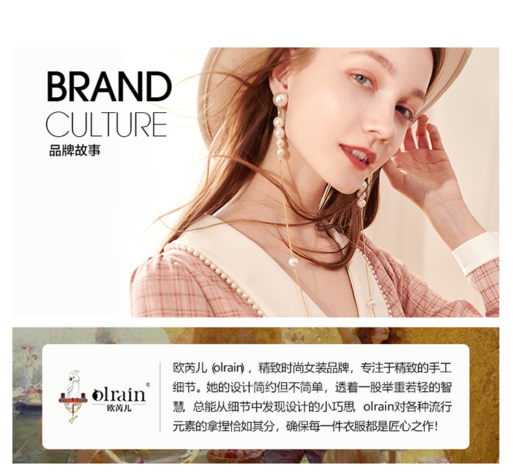 - “精致”是欧芮儿olrain品牌文化的核心,欧芮儿认为,精致的女人,不但要外在动人,更要内在迷人,内外兼修,有魅力、有气质、有内涵,自信而不自傲,优雅而不矫揉,自有万种风情而不轻浮,更不故作矜持。
