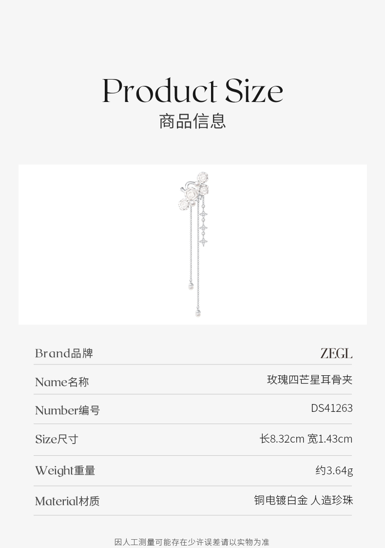 ZEGL设计师冰透玫瑰系列四芒星流苏耳夹女无耳洞耳骨夹仿珍珠耳环