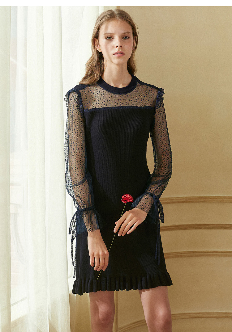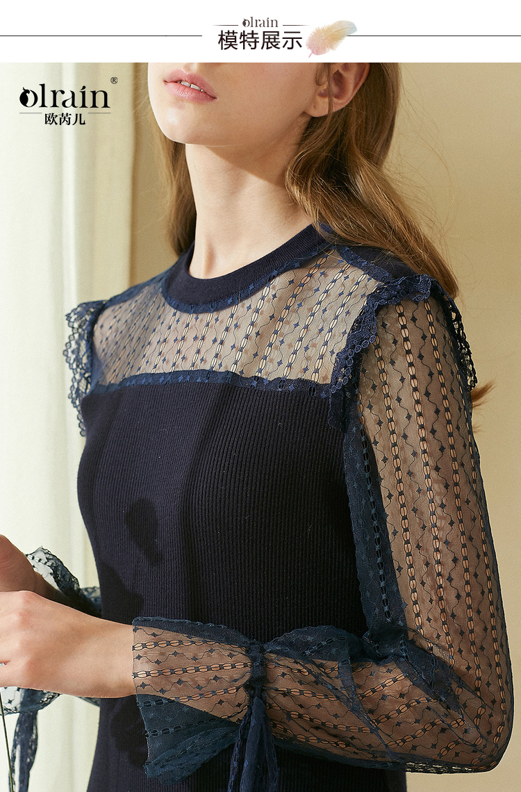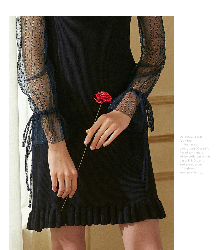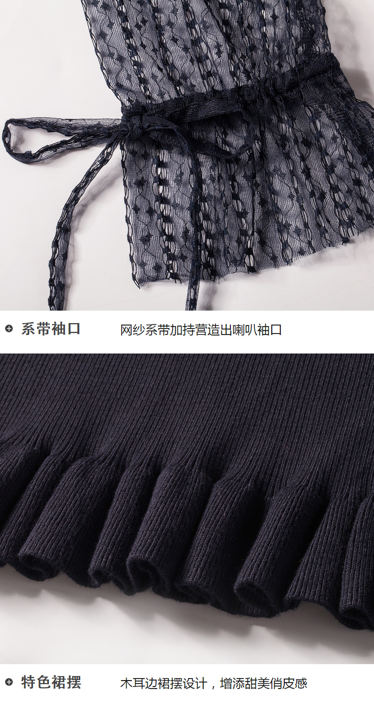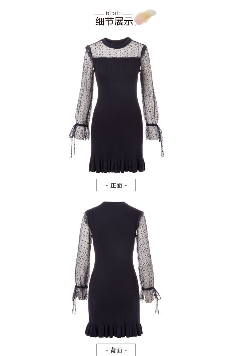 欧芮儿2018秋装新针织连衣裙女中长款网纱拼接木耳边黑色裙子