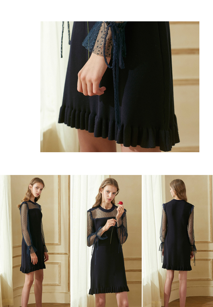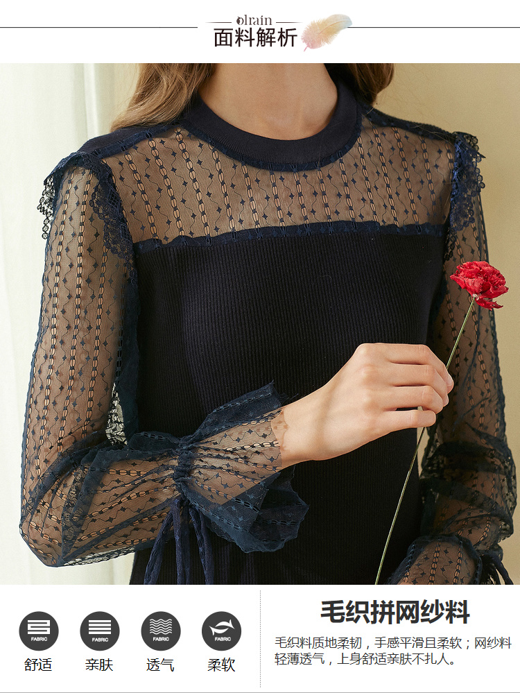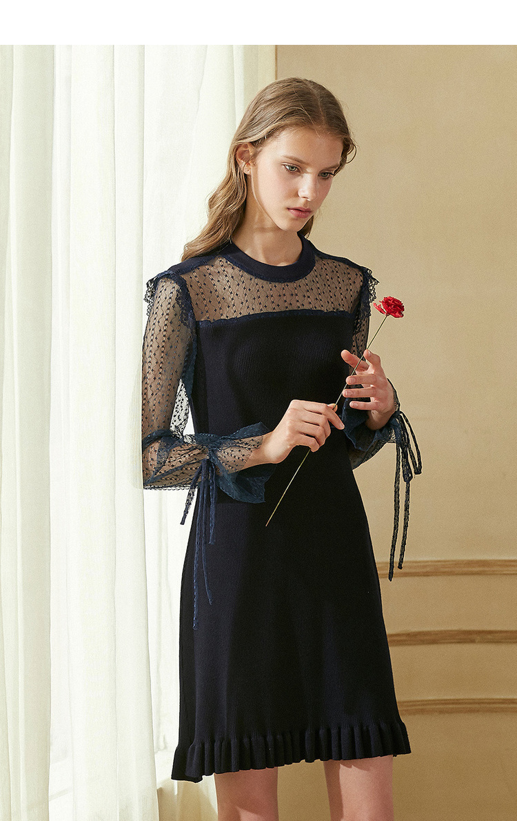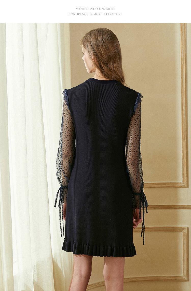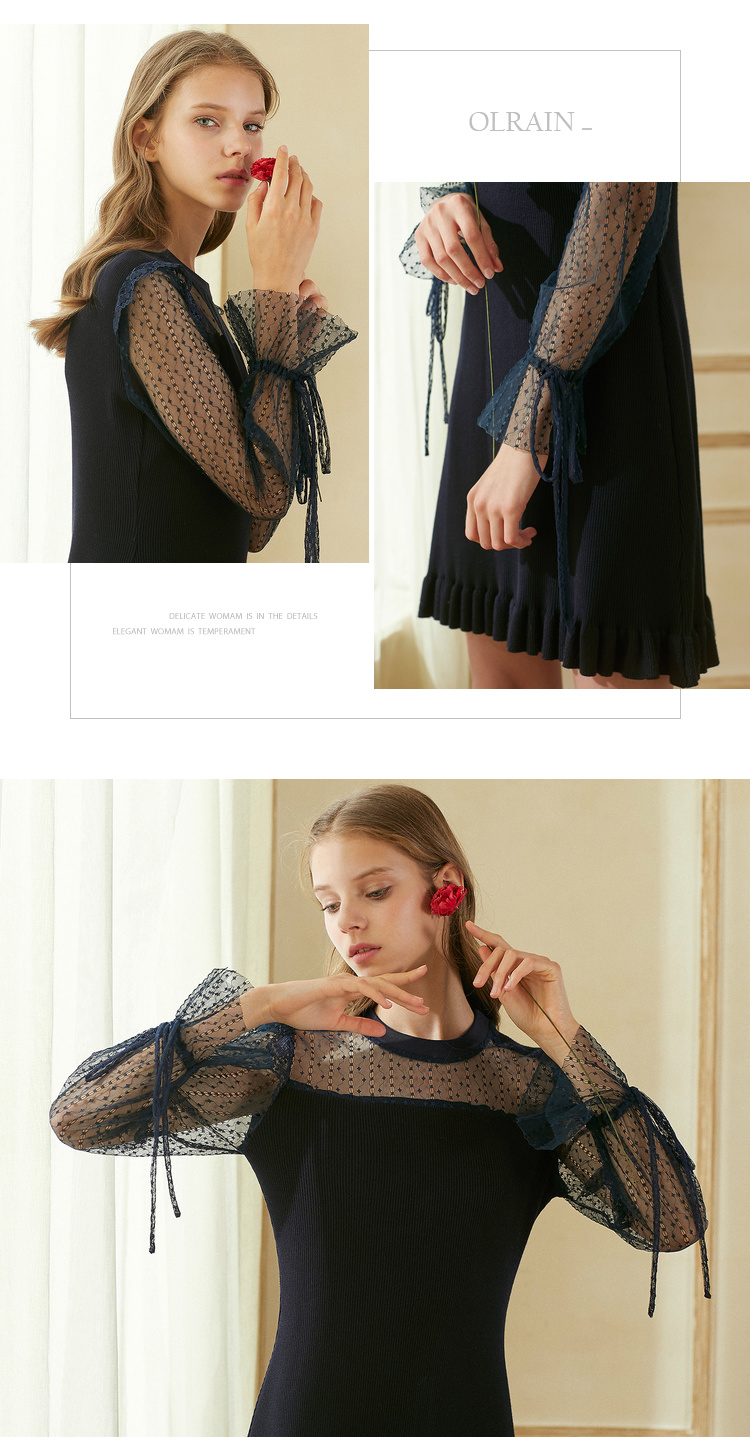 欧芮儿2018秋装新针织连衣裙女中长款网纱拼接木耳边黑色裙子