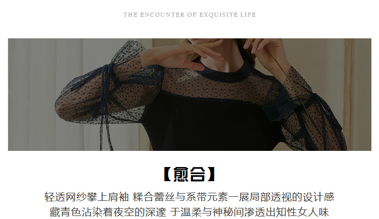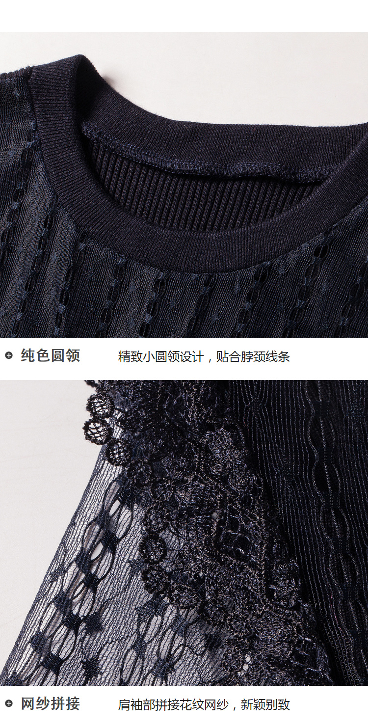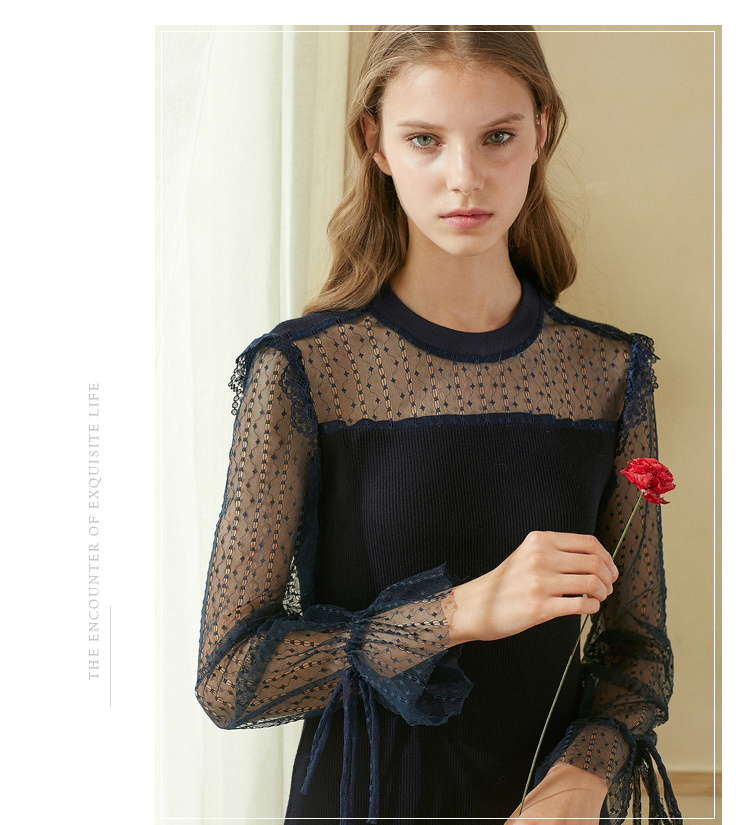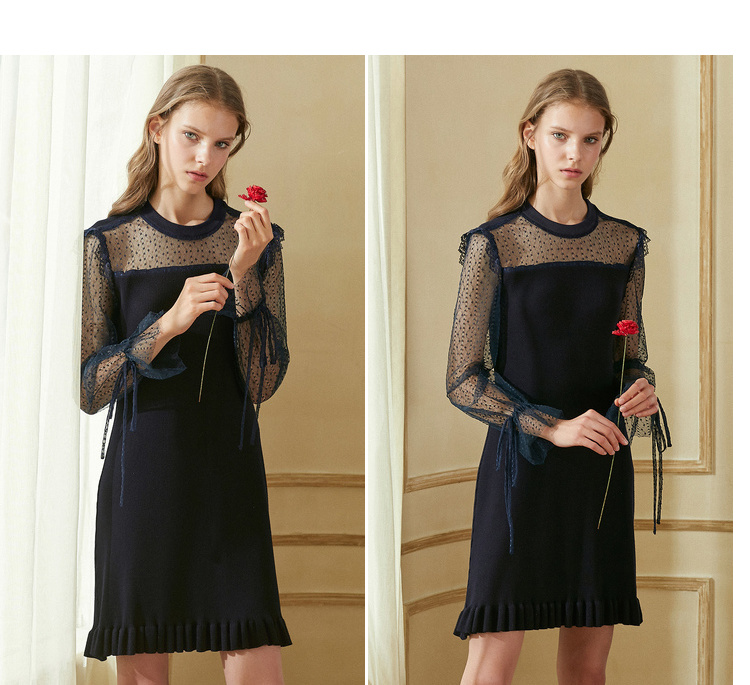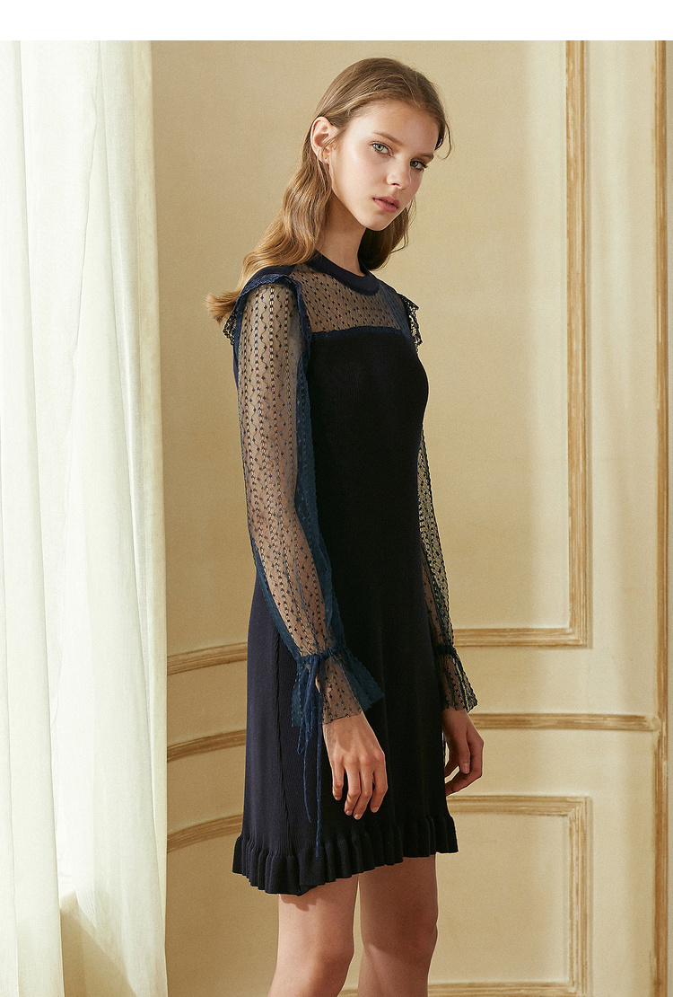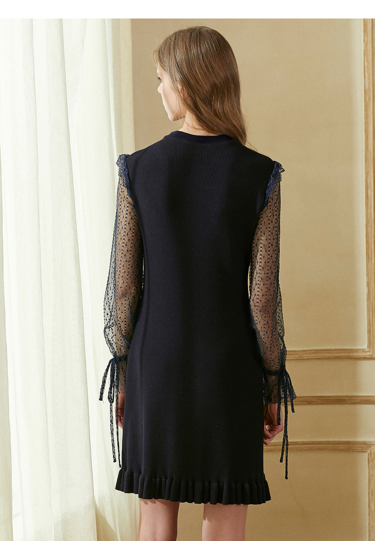 欧芮儿2018秋装新针织连衣裙女中长款网纱拼接木耳边黑色裙子