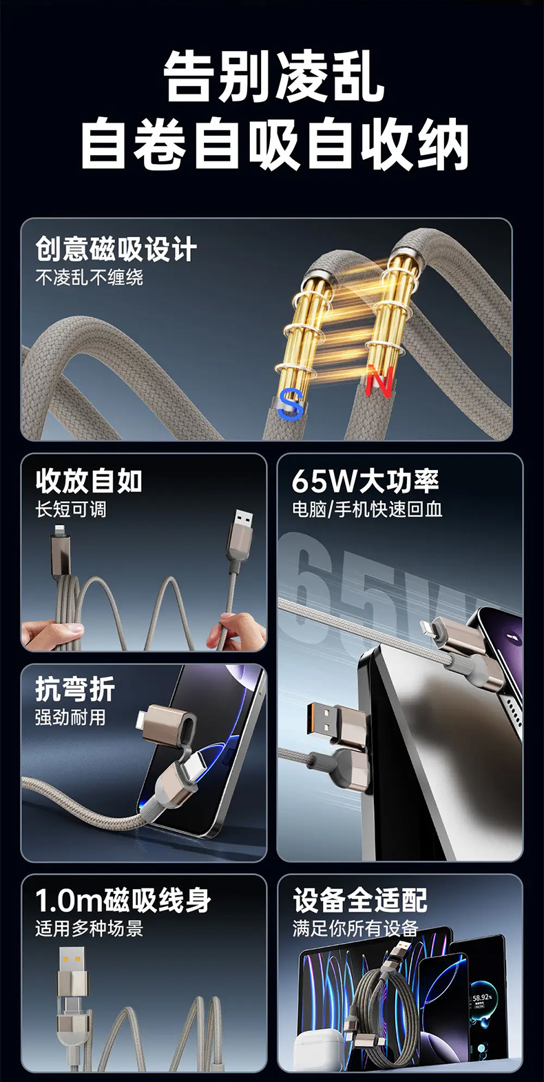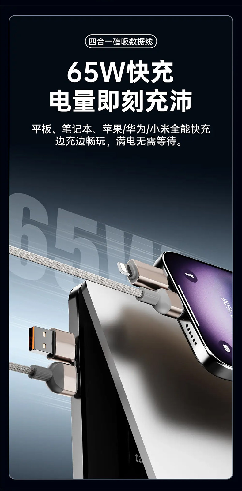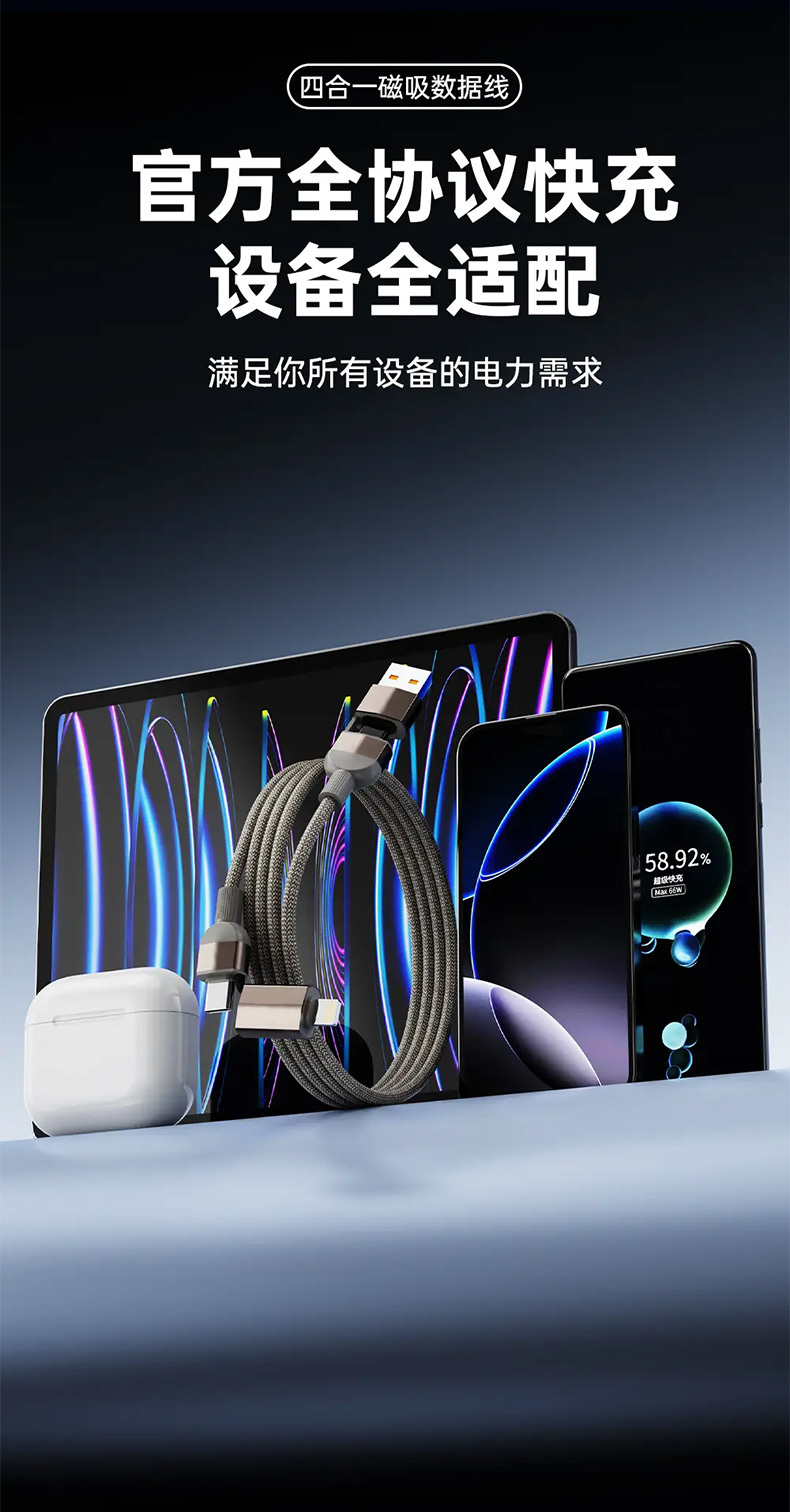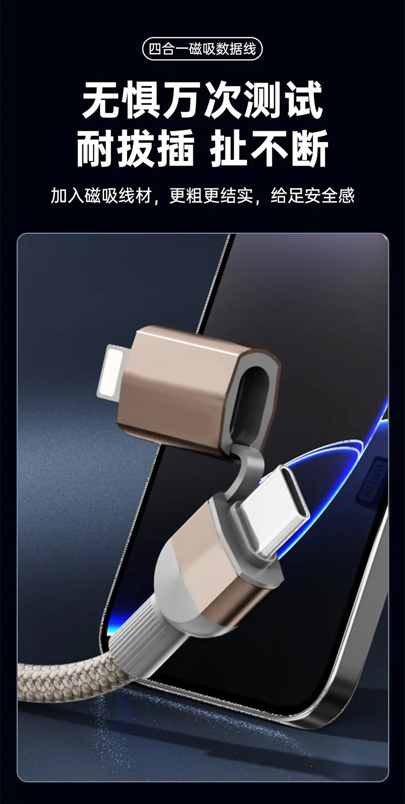 【四合一磁吸快充线】65W快充+磁吸收纳!全能接口,兼容手机平板笔记本等!耐磨耐用,安全高效两不误!【XW-X】