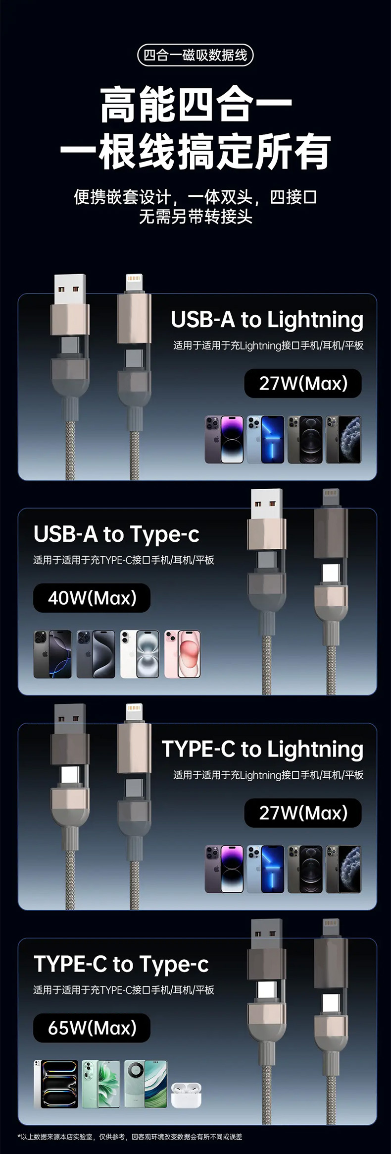 超强四合一,一线四用,高功率到低功率,65/40/27W设备都能完全兼容