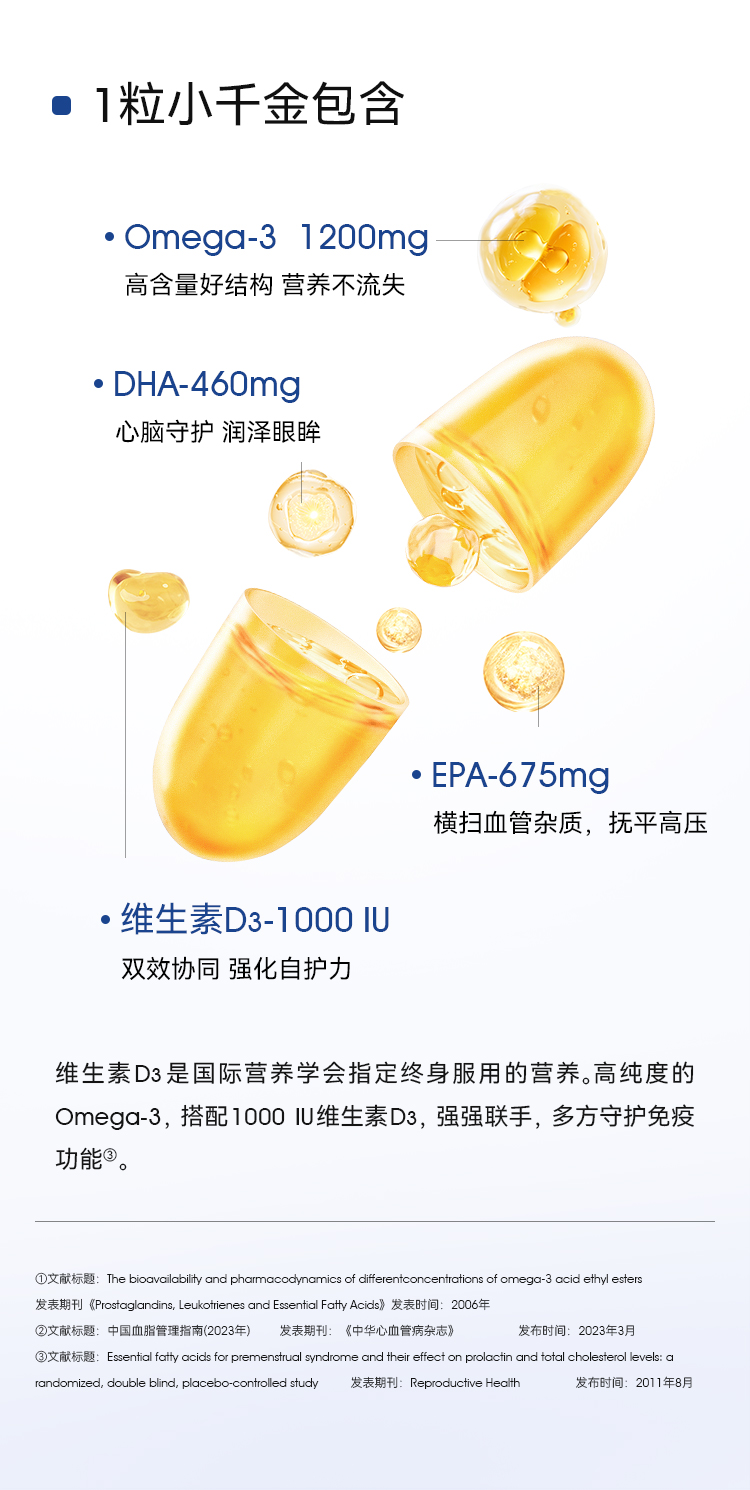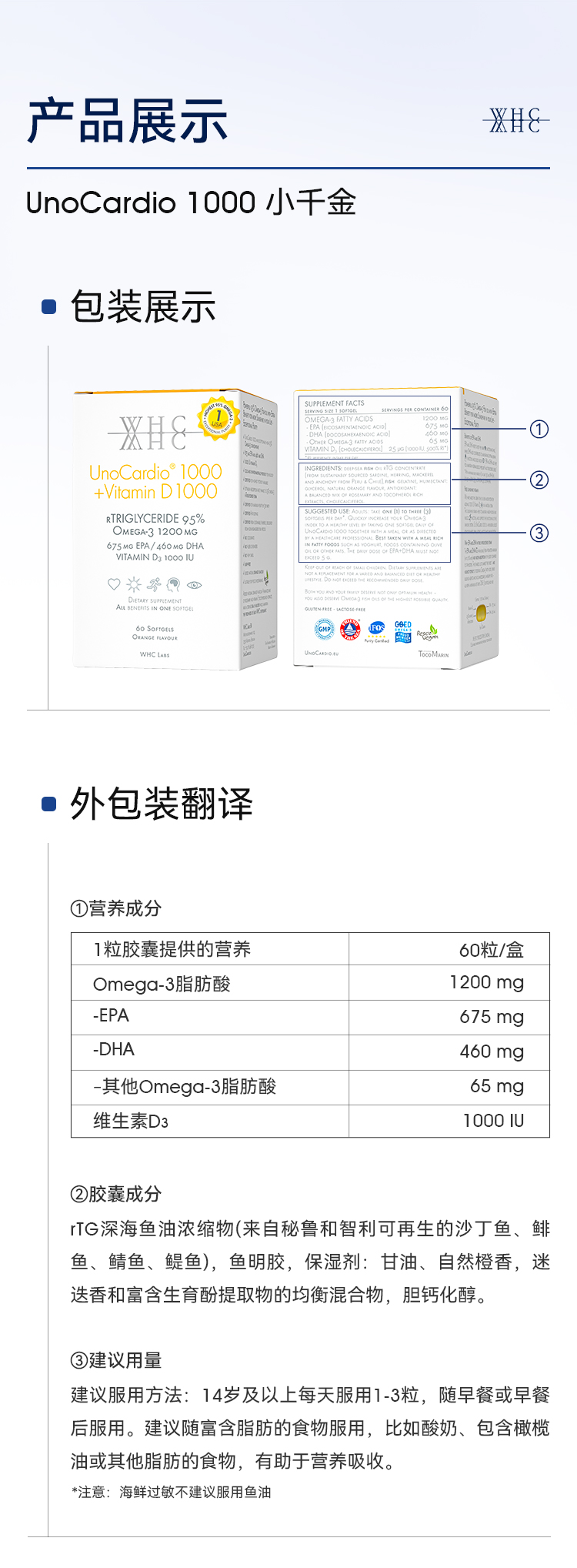 WHC小千金深海鱼油rTG结构95%高纯度Omega3维生素D3成人60粒