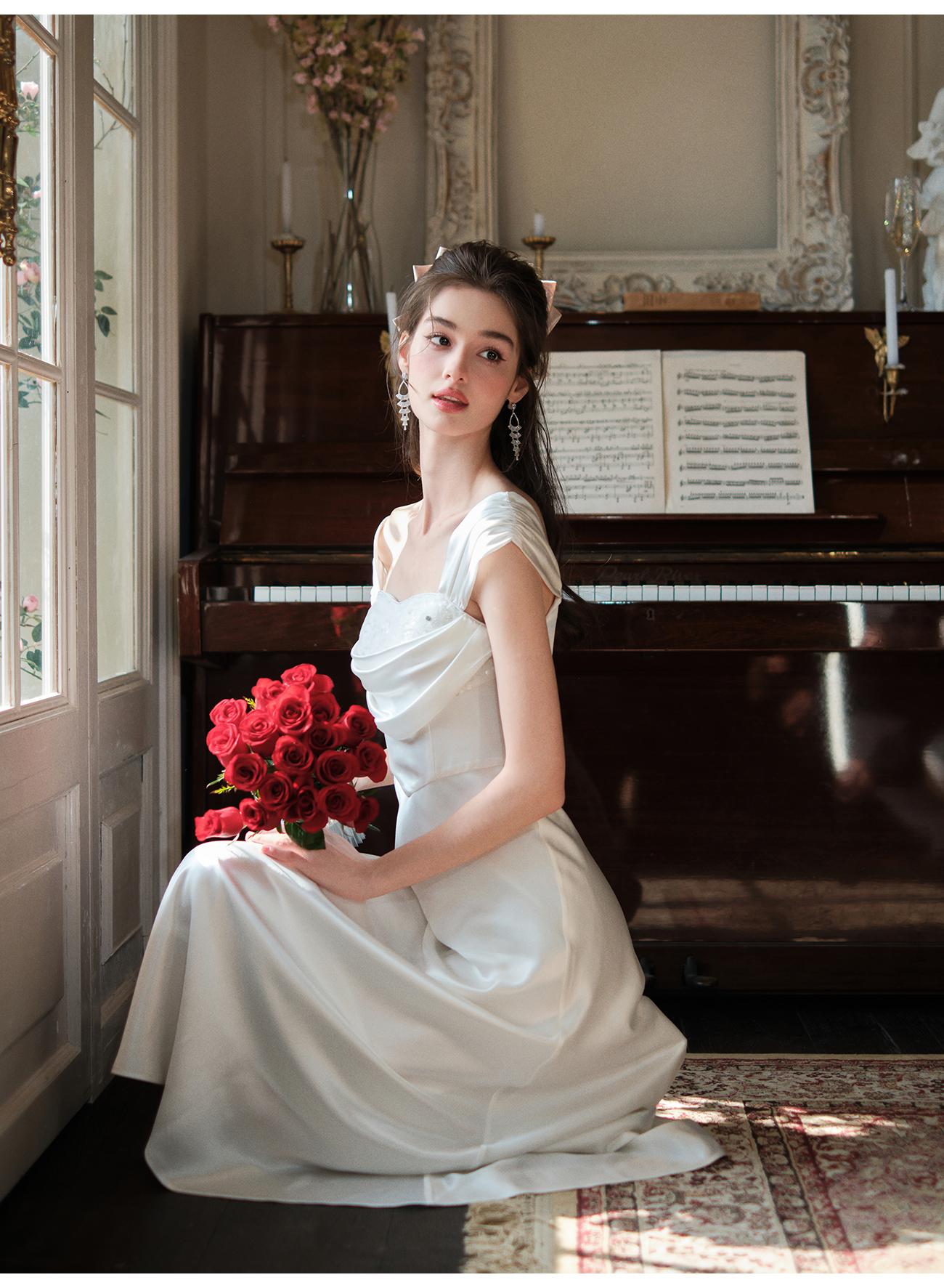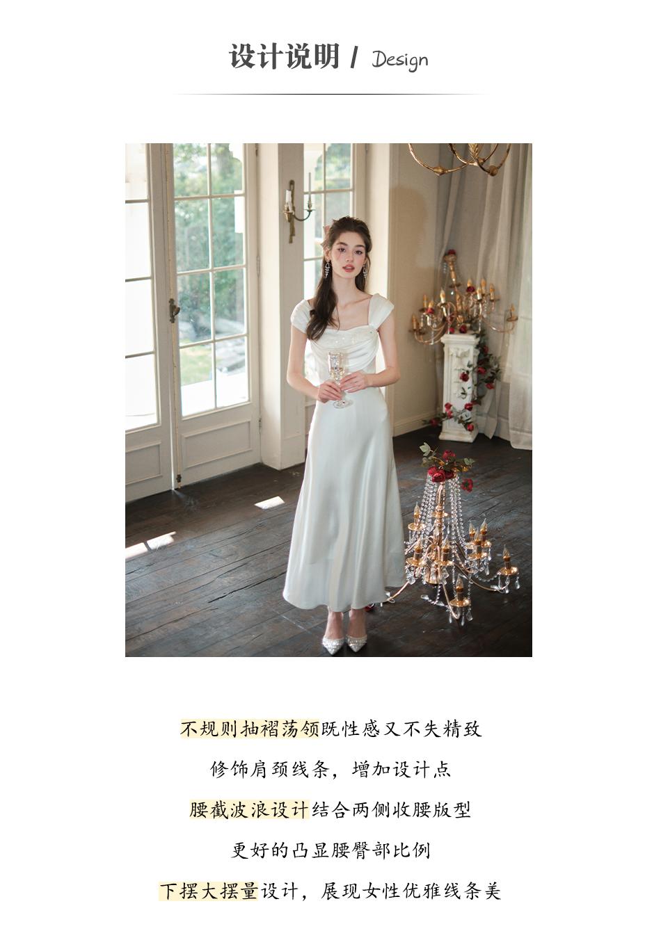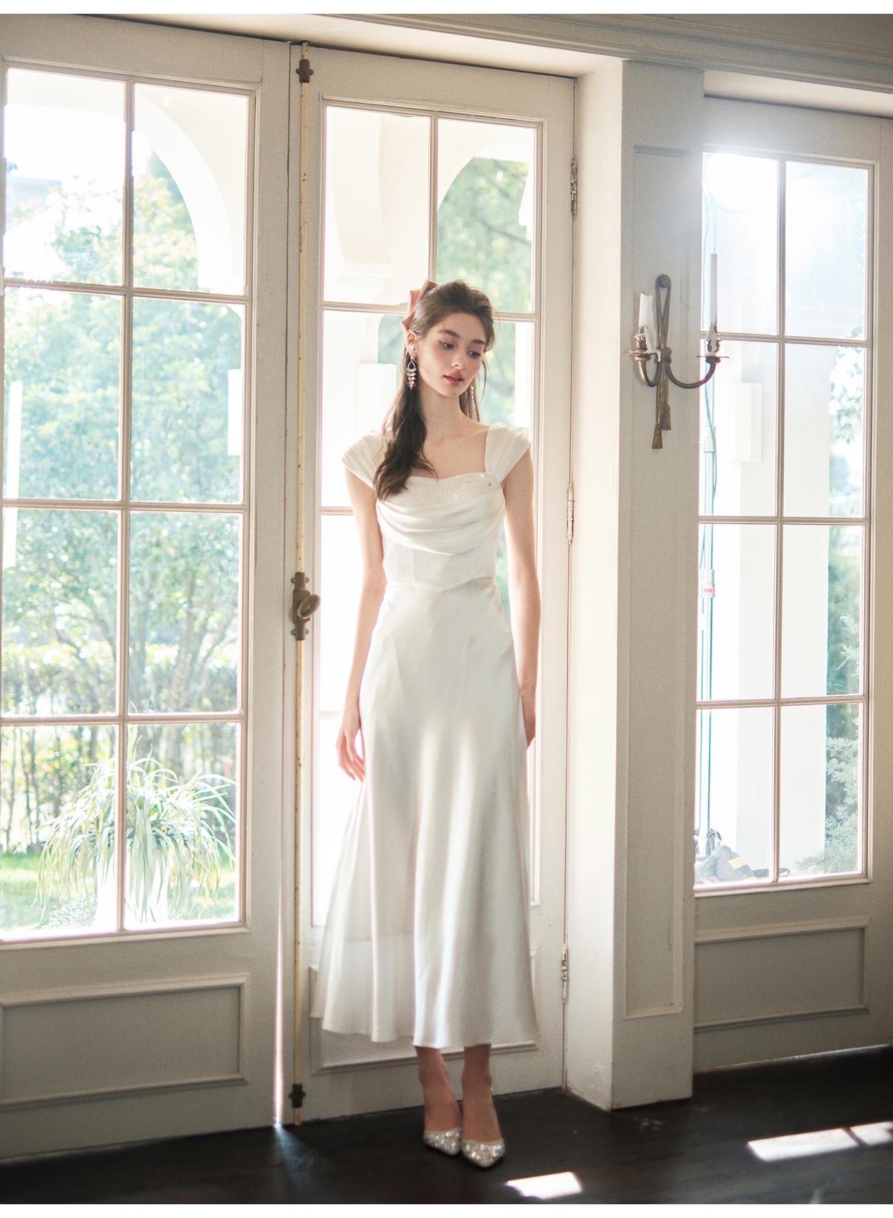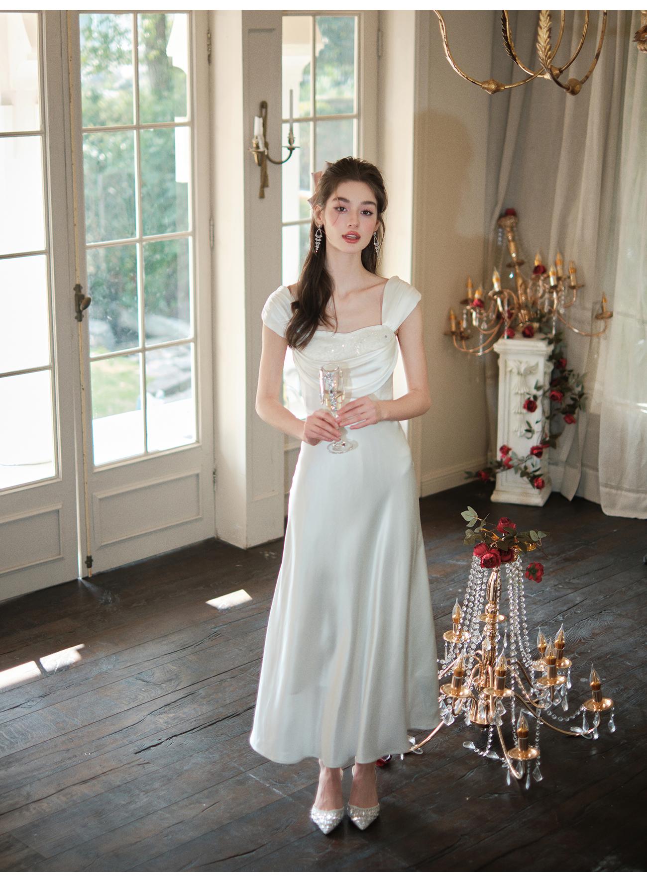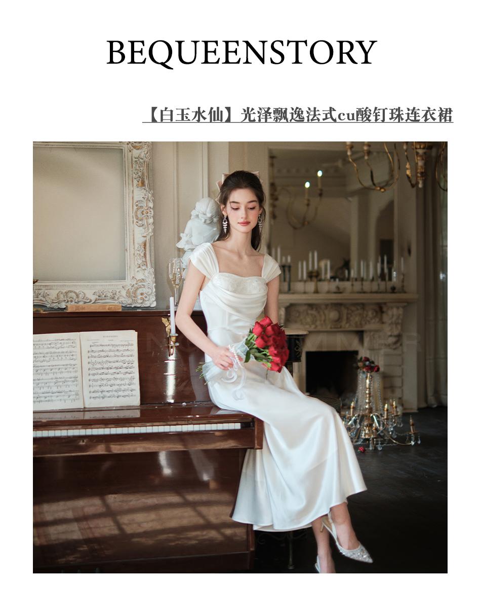BeQueenStory【白玉水仙】设计感光泽飘逸优雅法式醋酸钉珠连衣裙