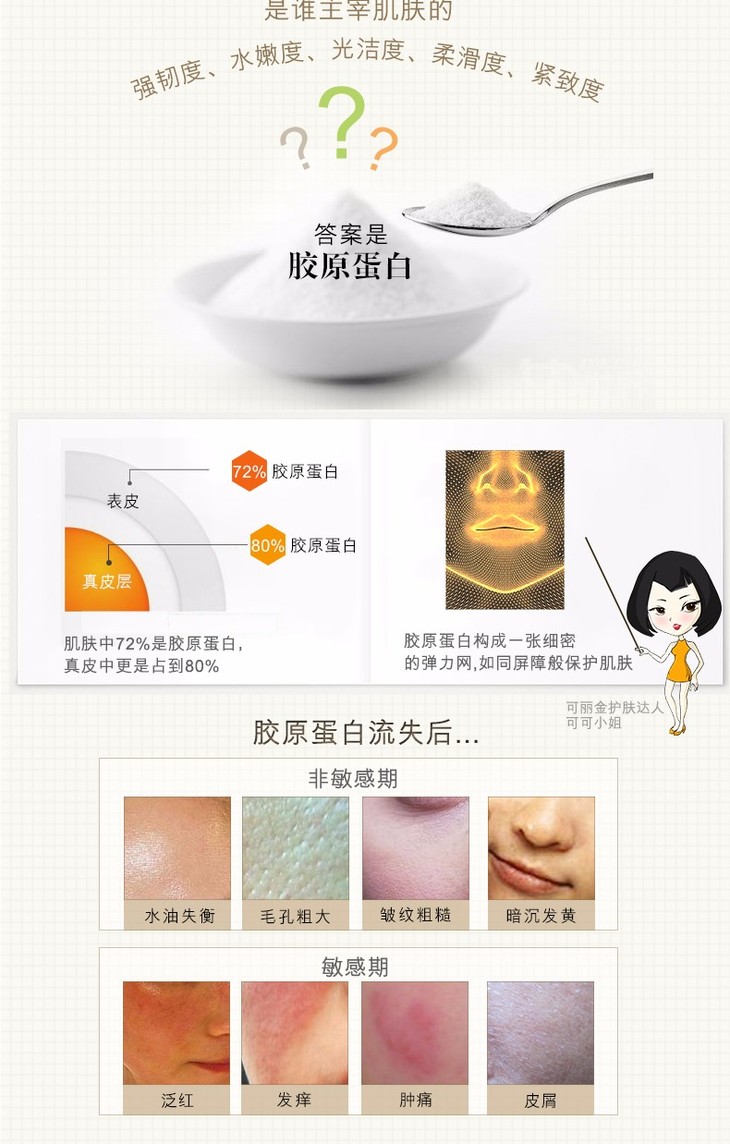 【产品特性】:采用低浓度类人胶原蛋白原液、高浓度透明质酸和注射用水配制。强大的补水和舒缓性能:降低皮肤敏感度,舒缓刺激性症状。调节水油平衡,修复皮脂膜。适合任何肌肤类型,尤其适合敏感肌肤、光疗后底耐受肌肤和脱毛术后肌肤的补水和舒缓。与可丽金安护面霜配合使用,效果更佳。