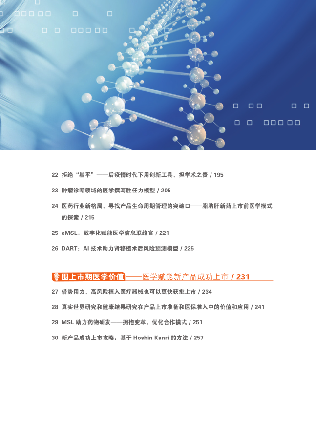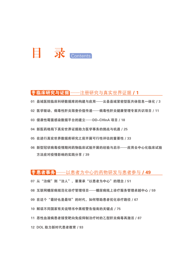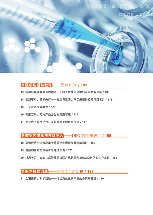 本书是继医学事务优秀案例荟萃图书的第6本,本书征集了来自全国各大医药企业在临床研究与证据、患者事务、医学沟通与教育、药物经济学与市场准入、医学模式创新、围上市期医学价值等案例经验分享,每一篇案例都提供了一个工作思路,点亮了医学事务人工作方向,拓宽了医学事务人在各大工作领域的能力和技能,内容精彩纷呈,引人入胜,值得同仁相互学习和借鉴。