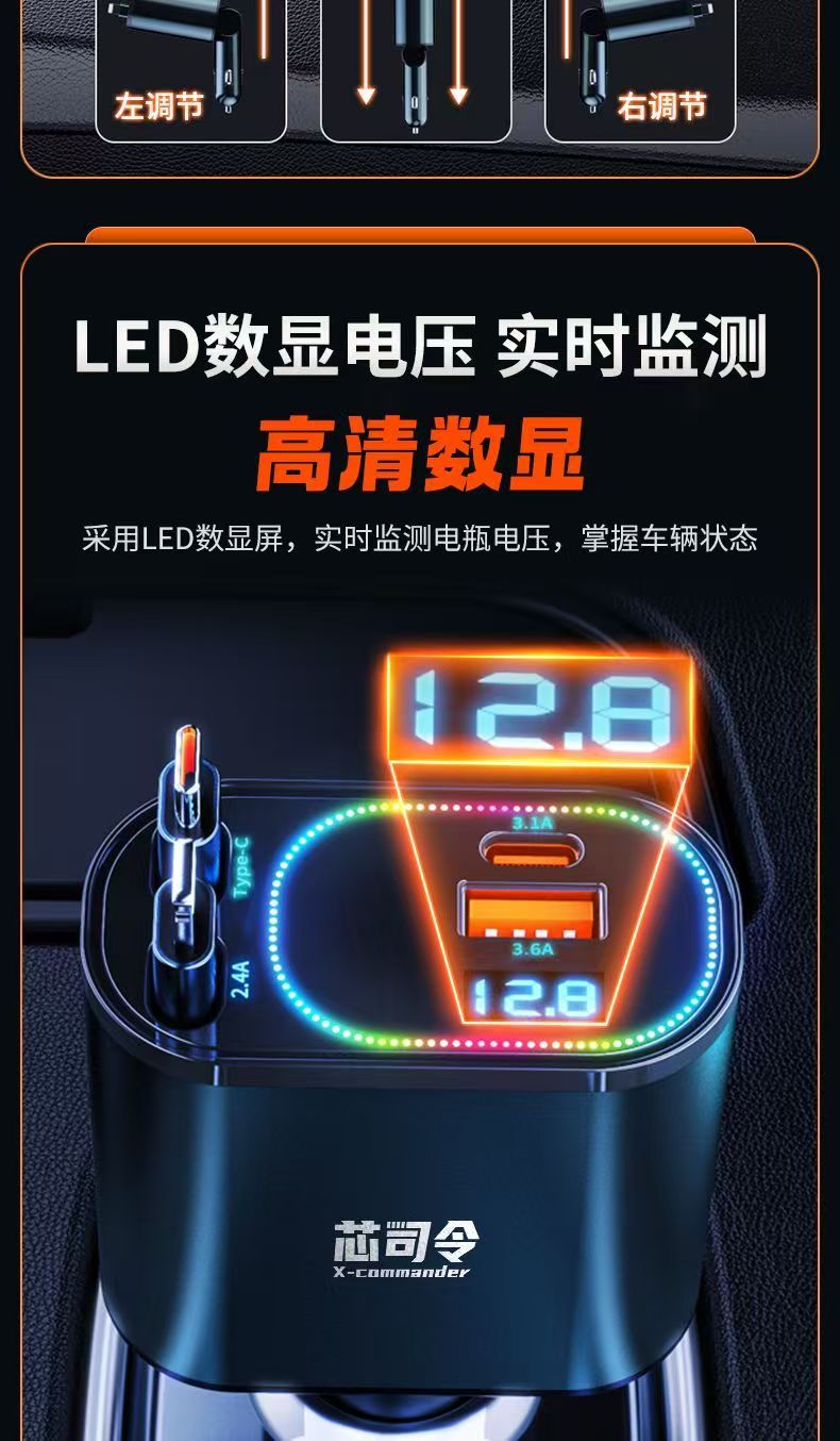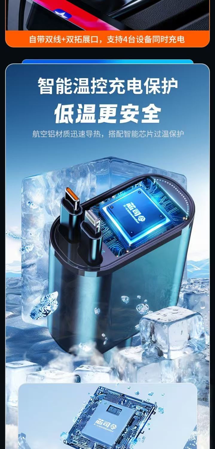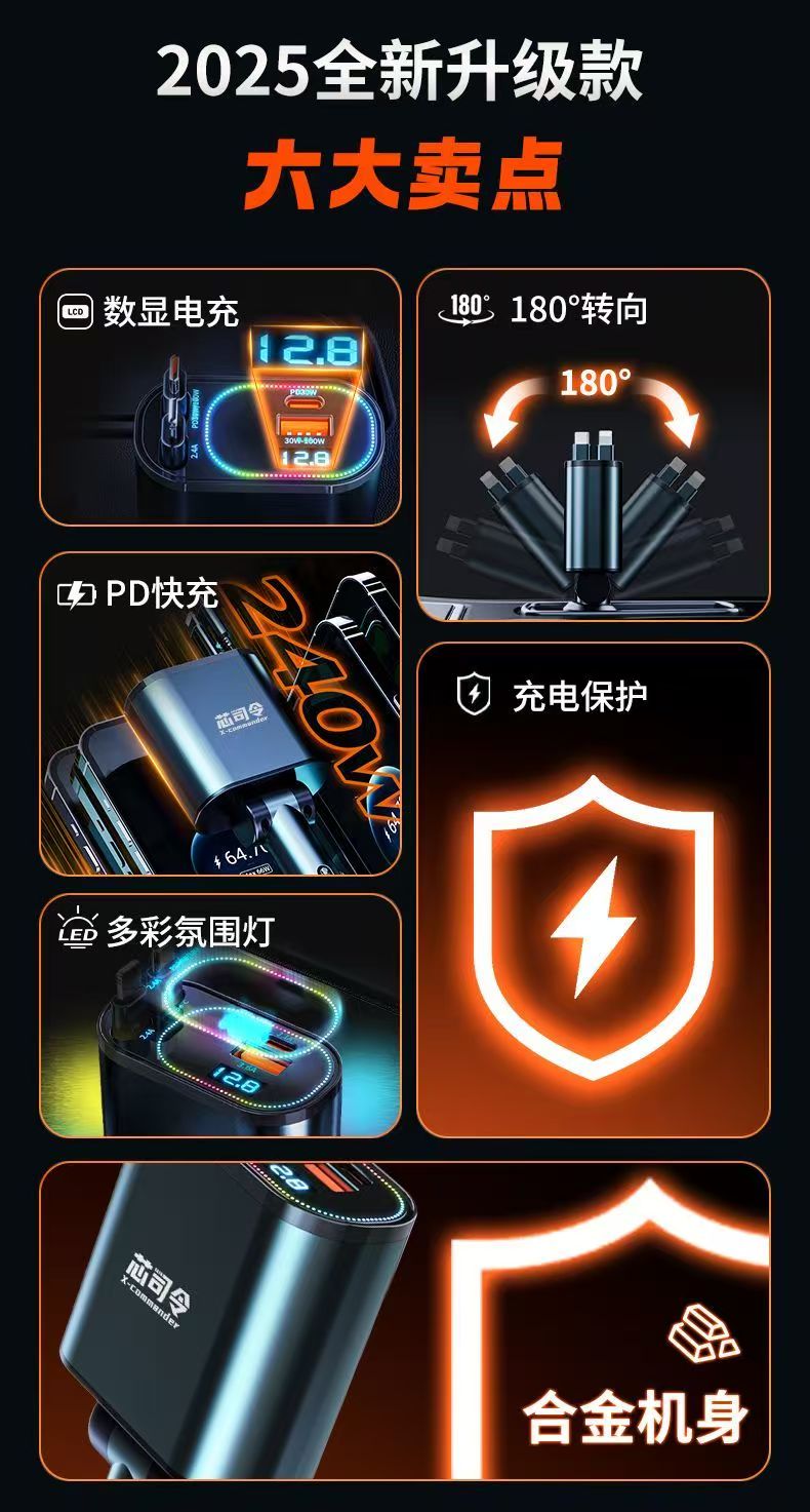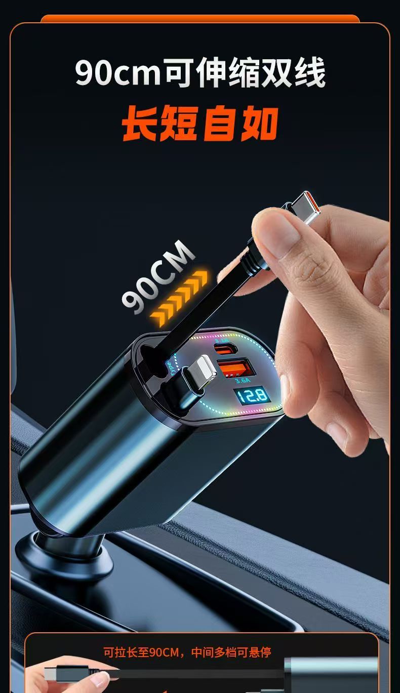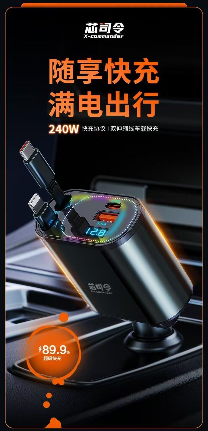 芯司令车载超级快充自带伸缩线一拖四闪充充电保护通用安卓苹果