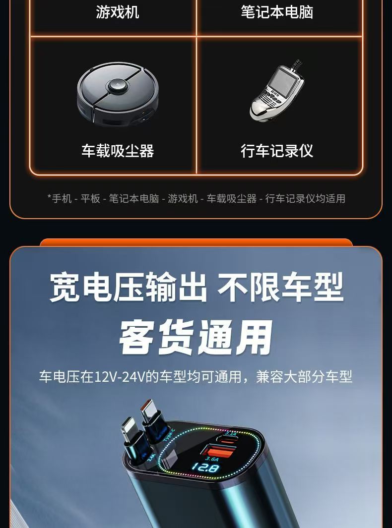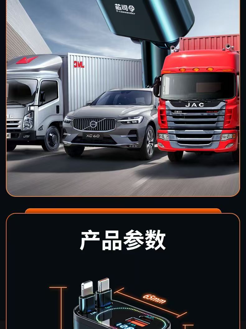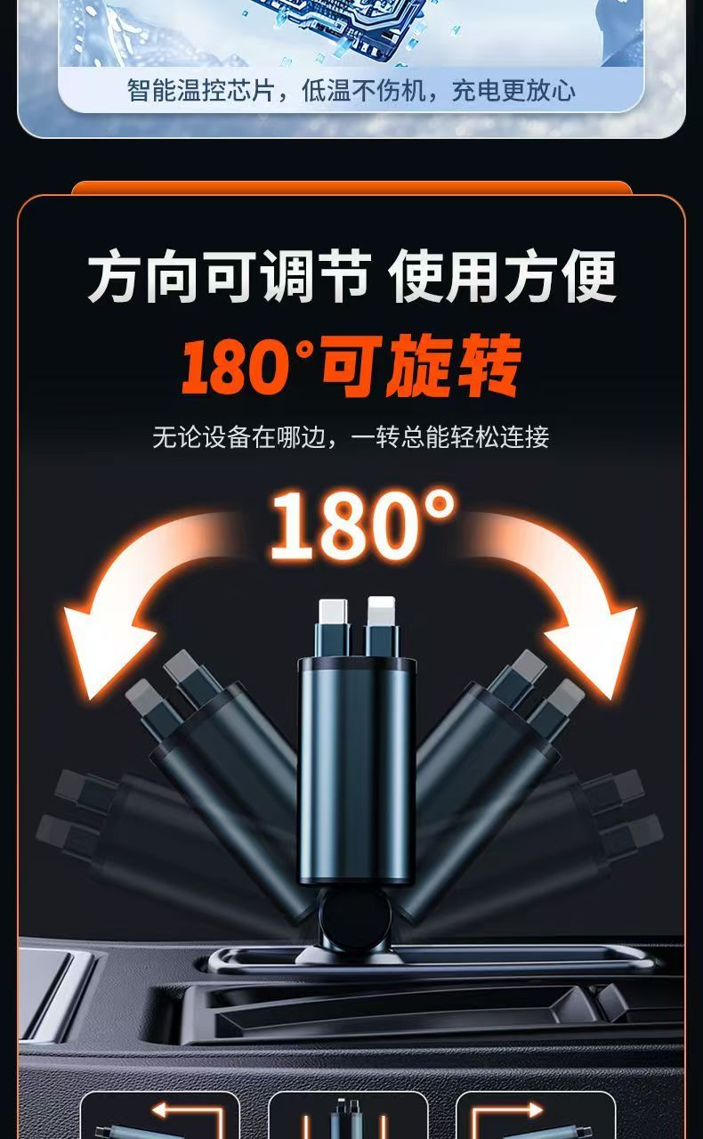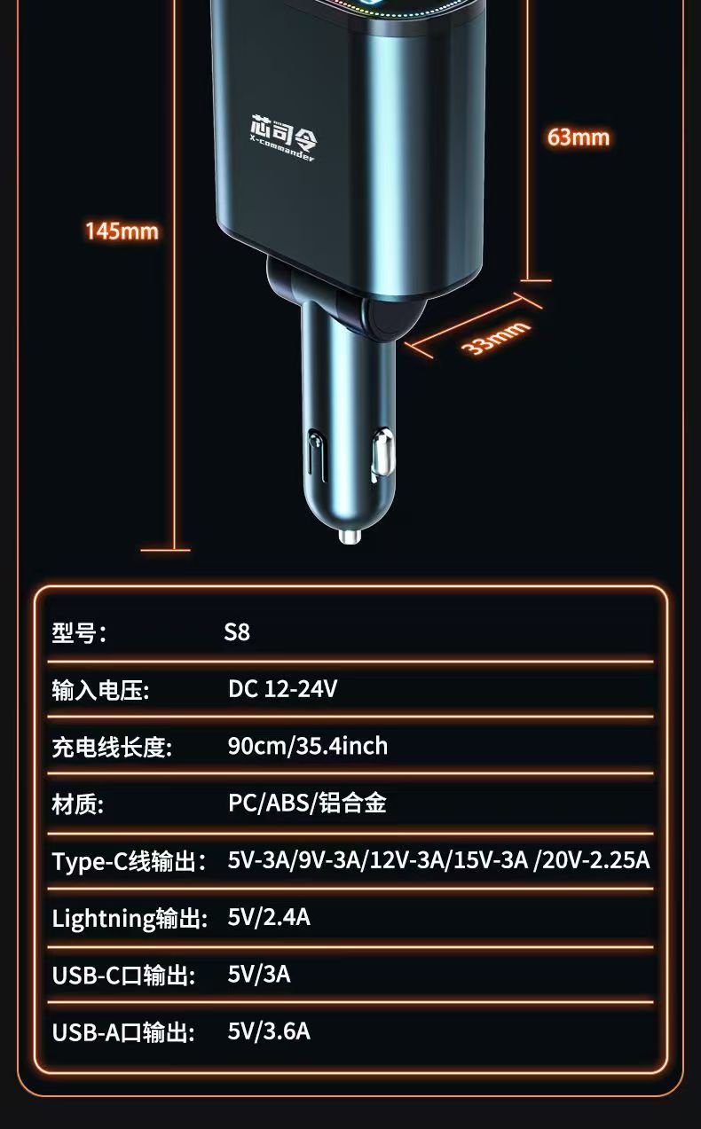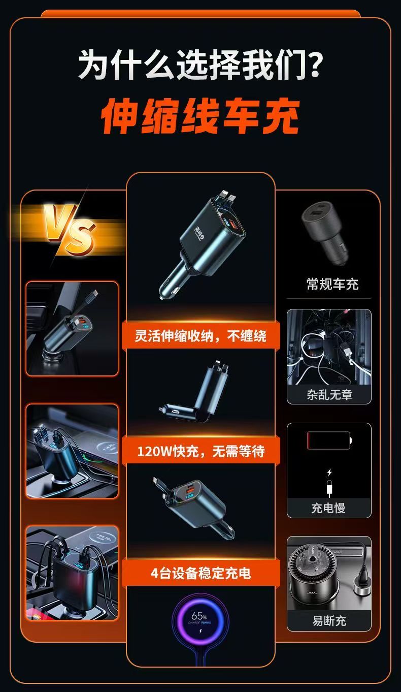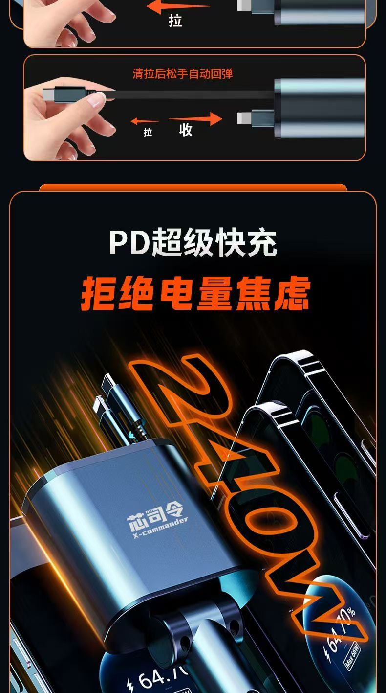 芯司令车载超级快充自带伸缩线一拖四闪充充电保护通用安卓苹果