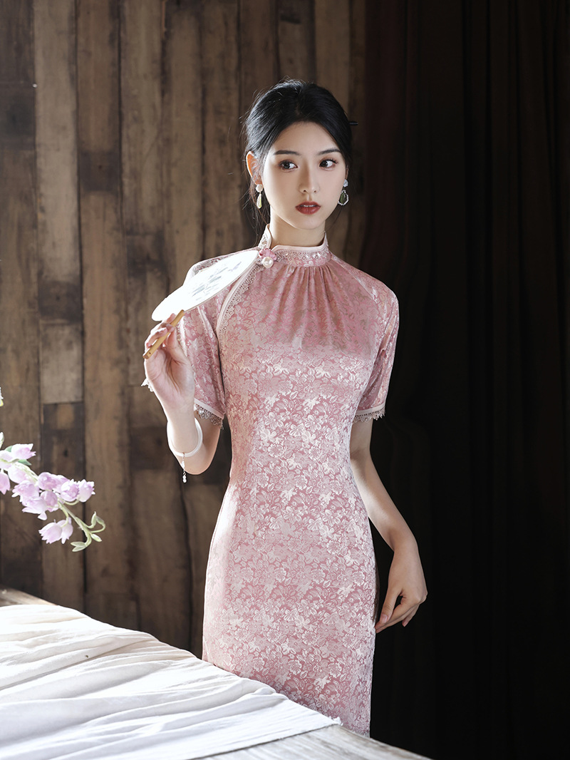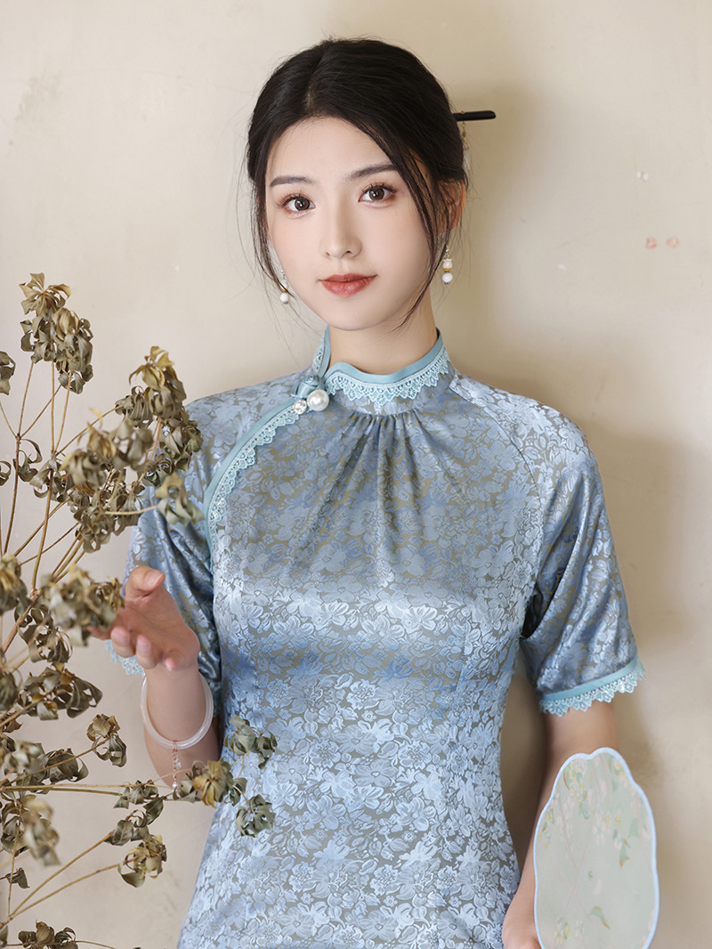 蕾丝加绒长袖保暖毛领日常旗袍 MLS6113