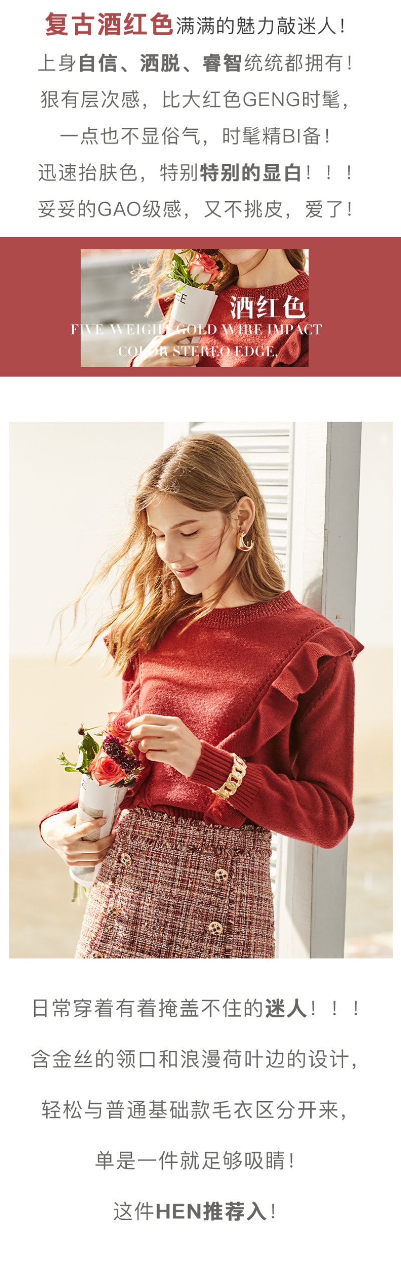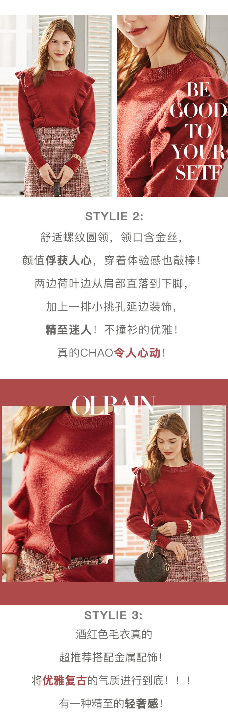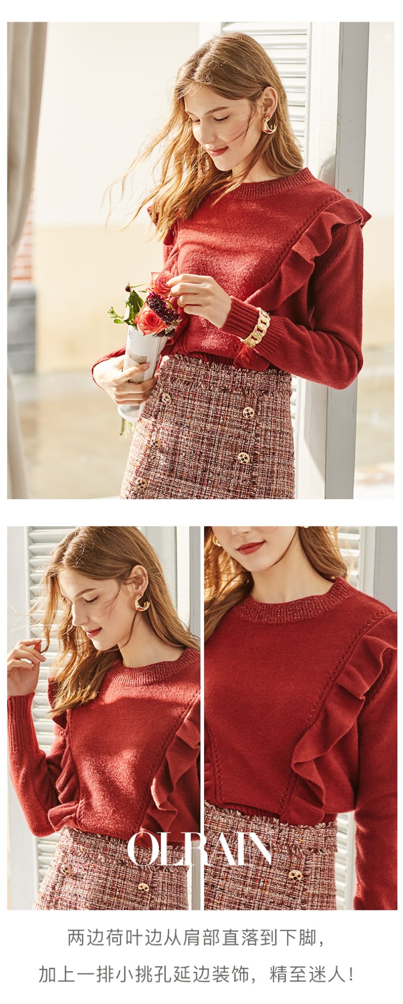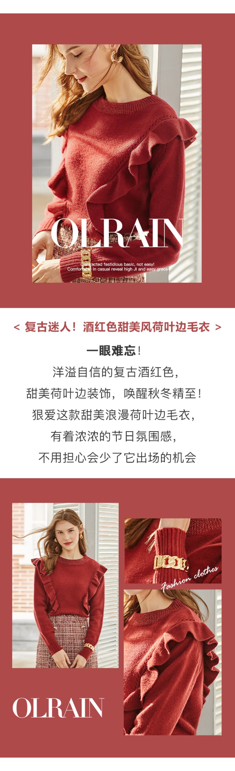 欧芮儿酒红色毛衣女新款圆领荷叶边套头打底衫内搭上衣