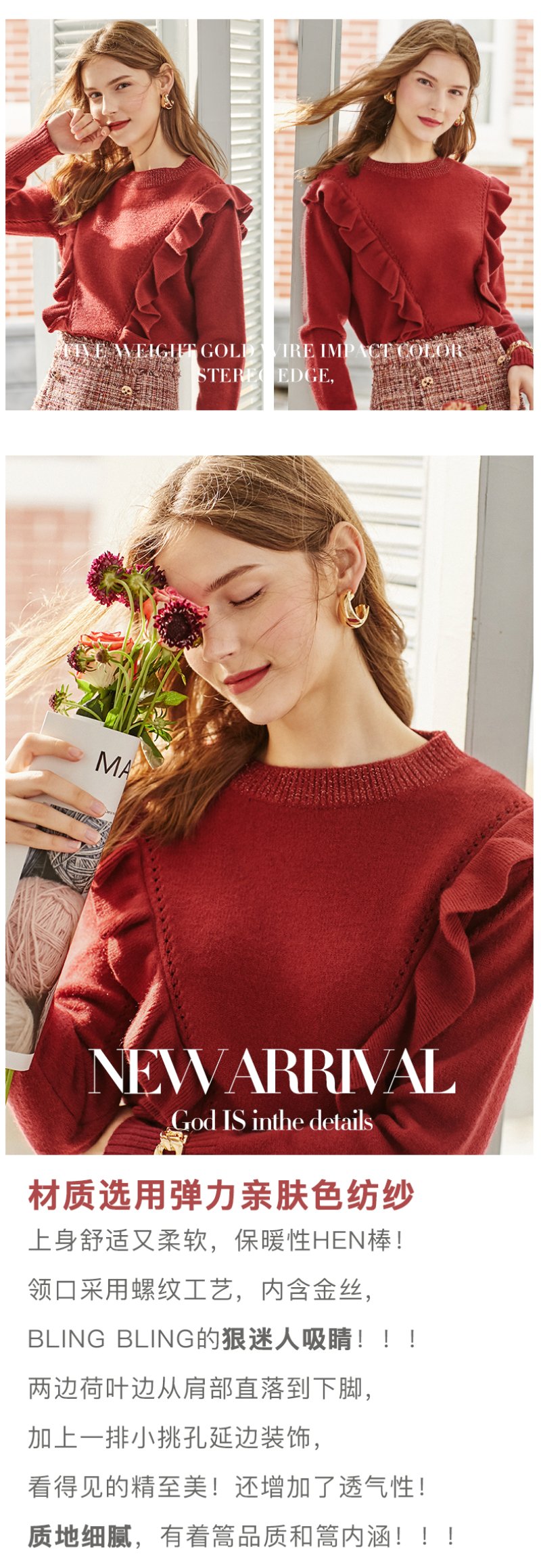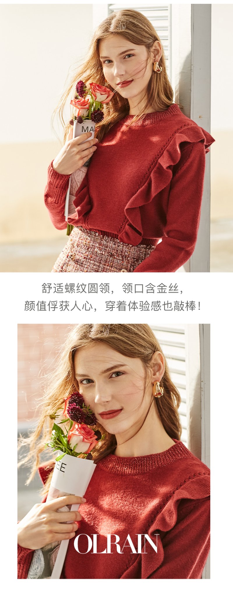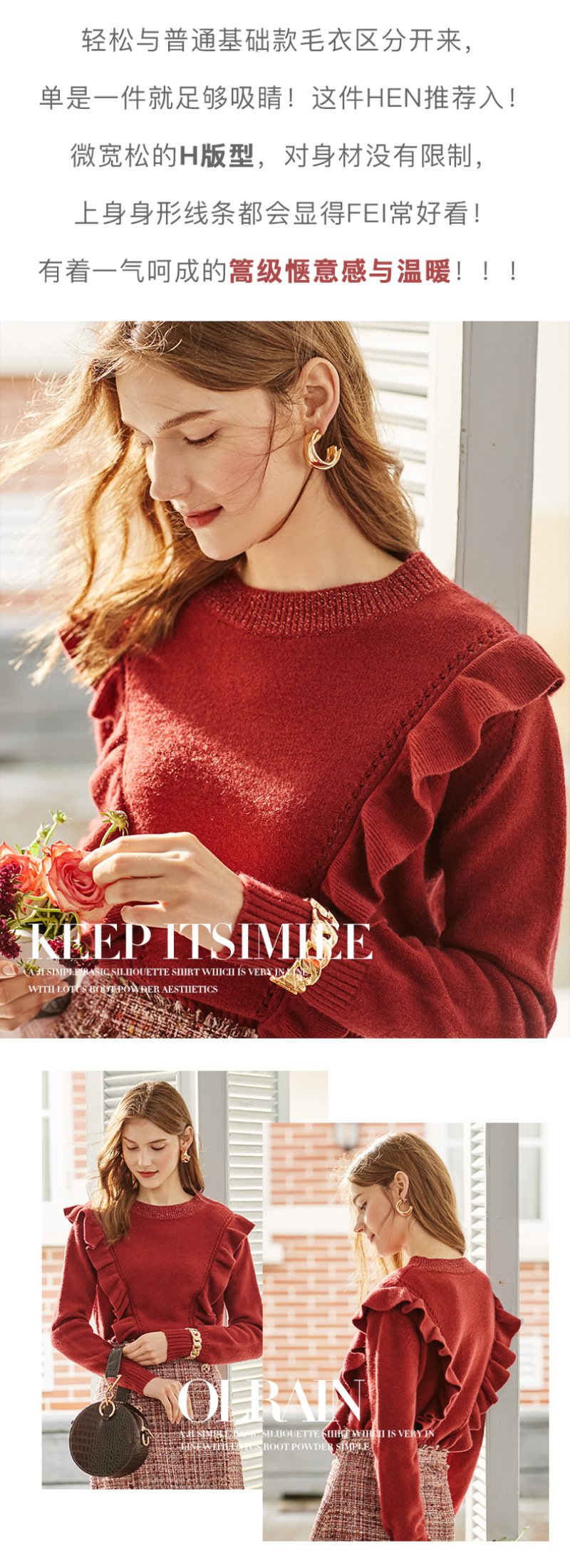 欧芮儿酒红色毛衣女新款圆领荷叶边套头打底衫内搭上衣