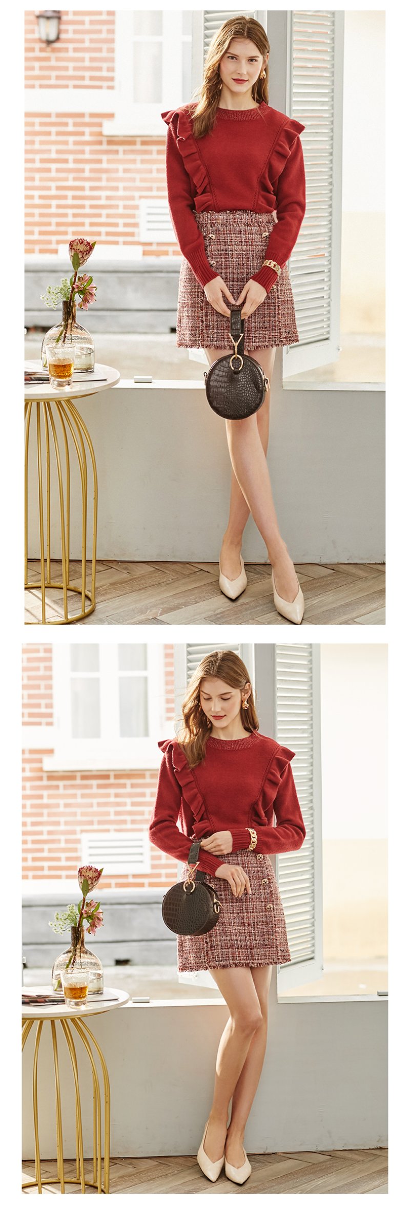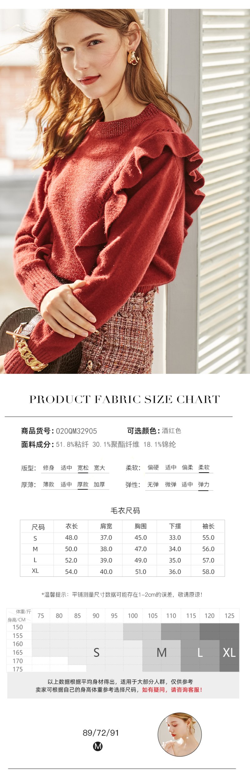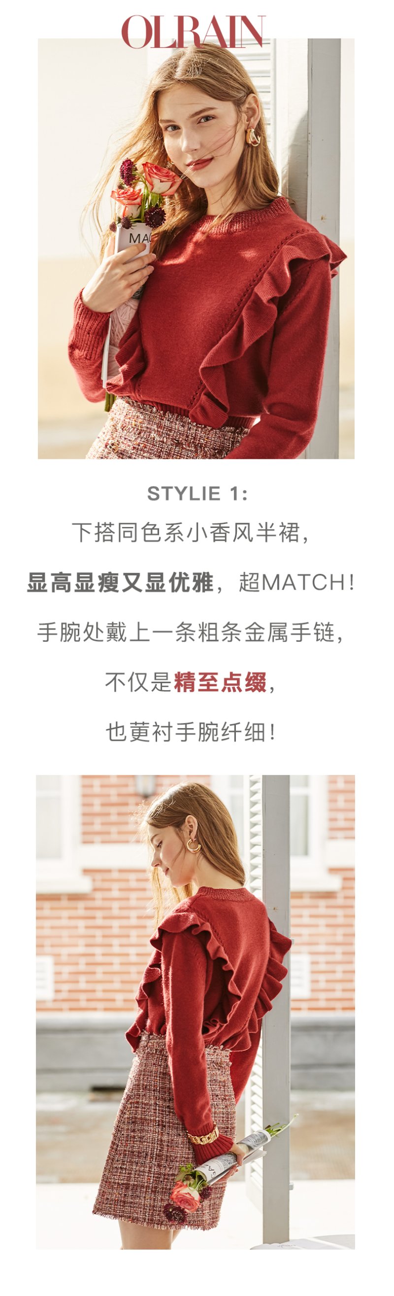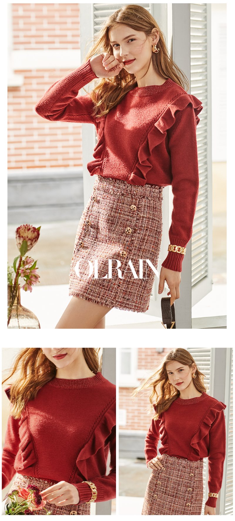 欧芮儿酒红色毛衣女新款圆领荷叶边套头打底衫内搭上衣
