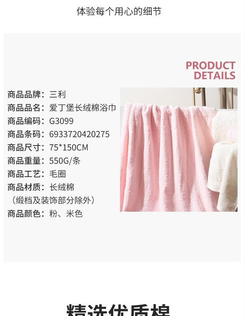 三利 爱丁堡长绒棉浴巾 单条G3099