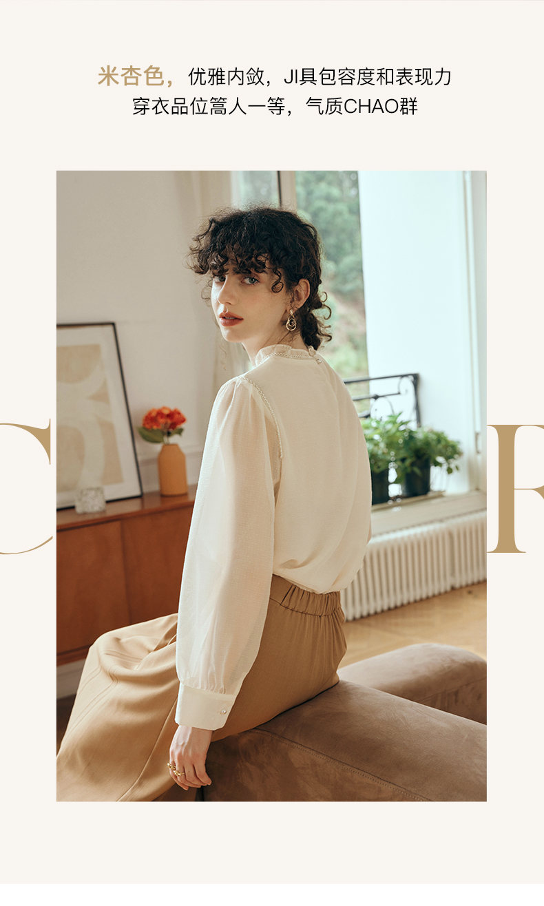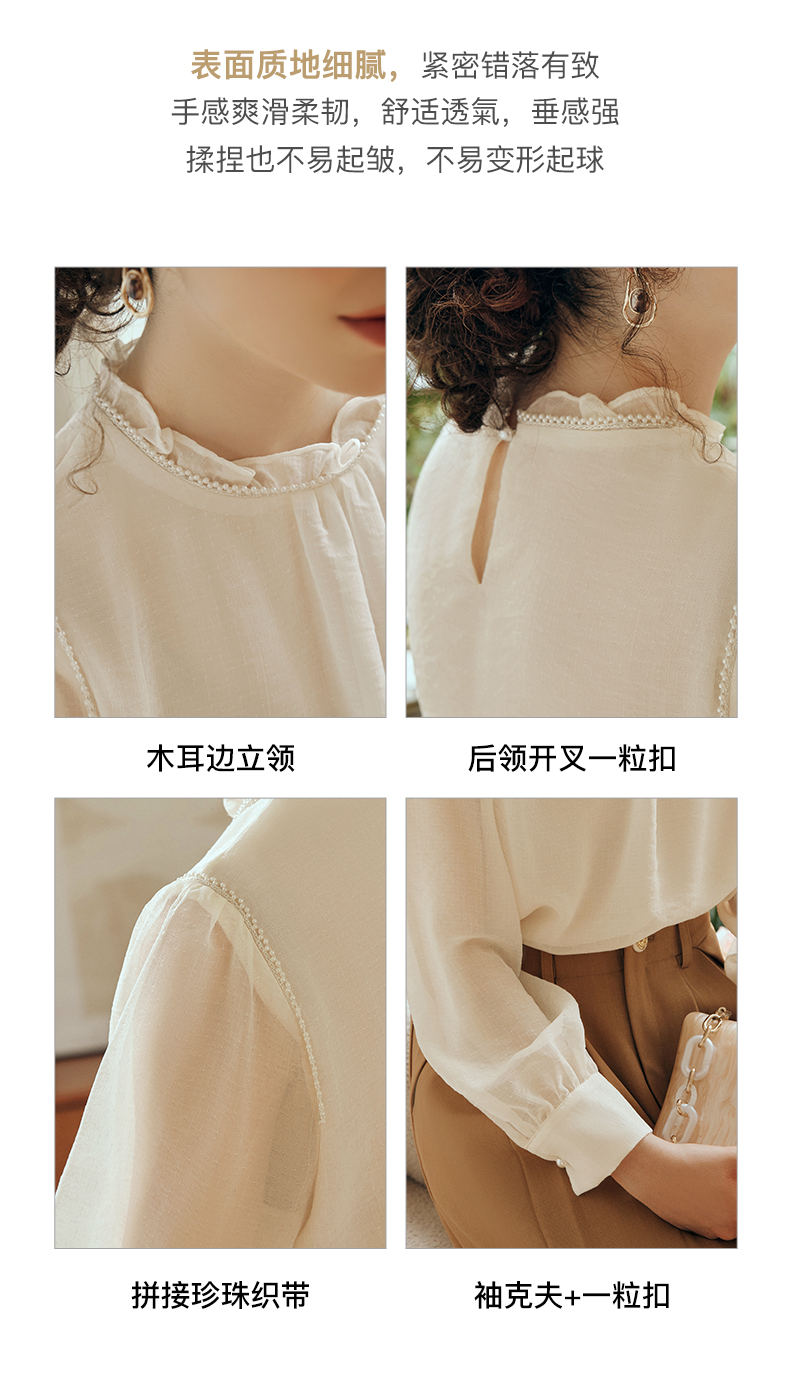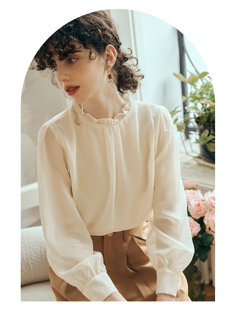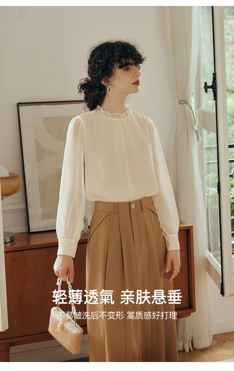 OLrain欧芮儿米杏色蕾丝雪纺衫女初秋2023新款法式木耳边立领小衫