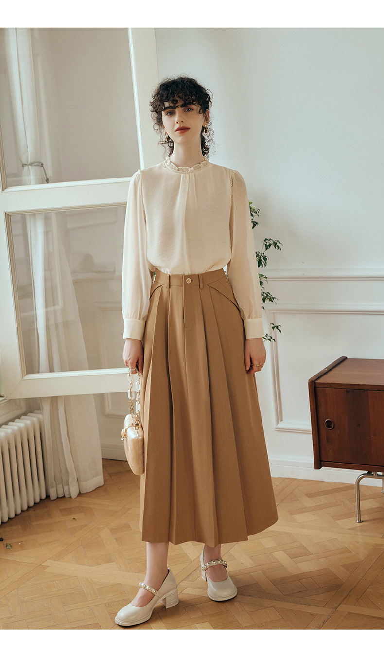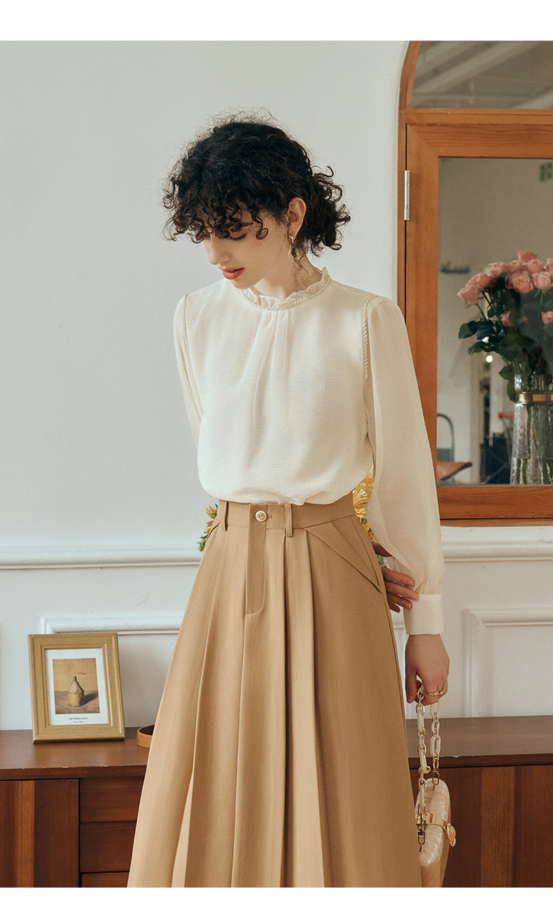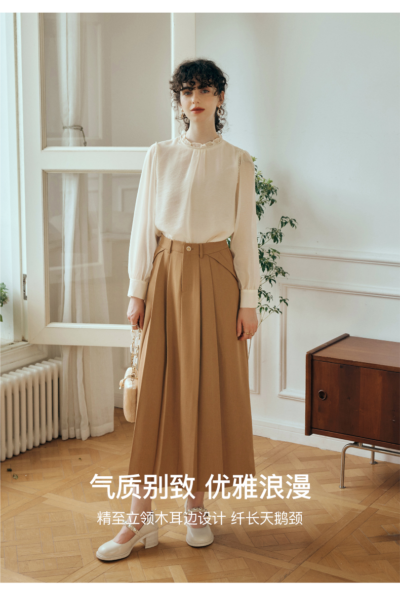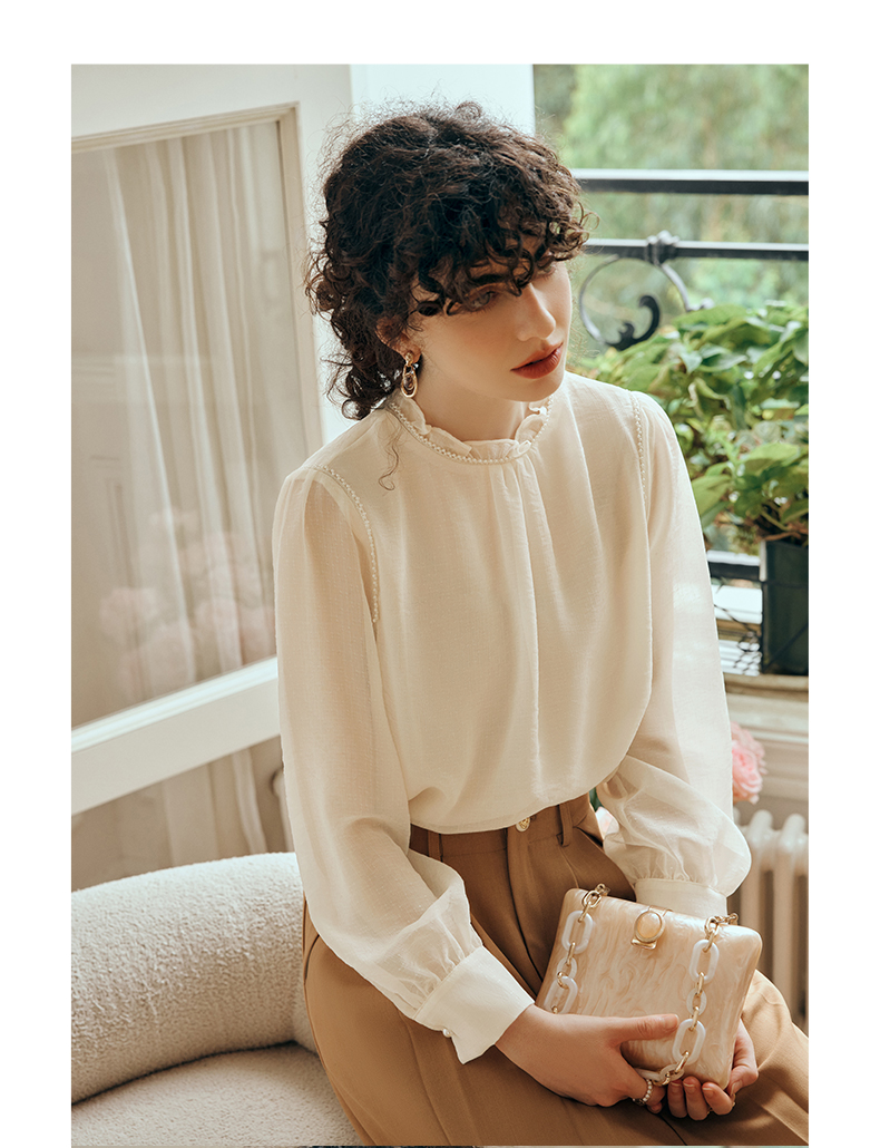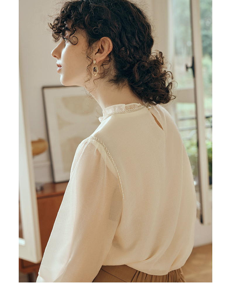 OLrain欧芮儿米杏色蕾丝雪纺衫女初秋2023新款法式木耳边立领小衫
