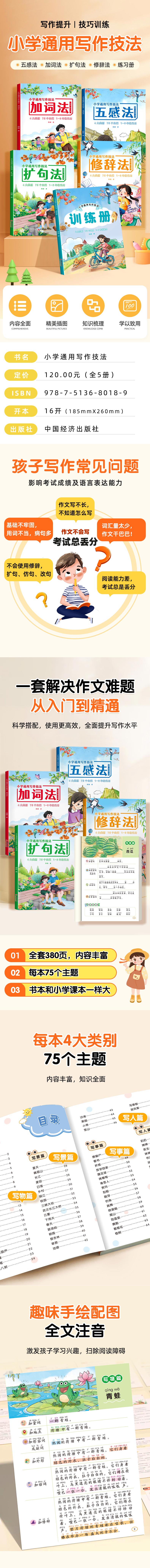1,本套书专为小学生打造,从“五感法”“修辞法”“加词法”“扩句法”四大实用技法入手,分“写物”“写景”“写事”“写人”四大主题,手把手教孩子写出精彩作文!
