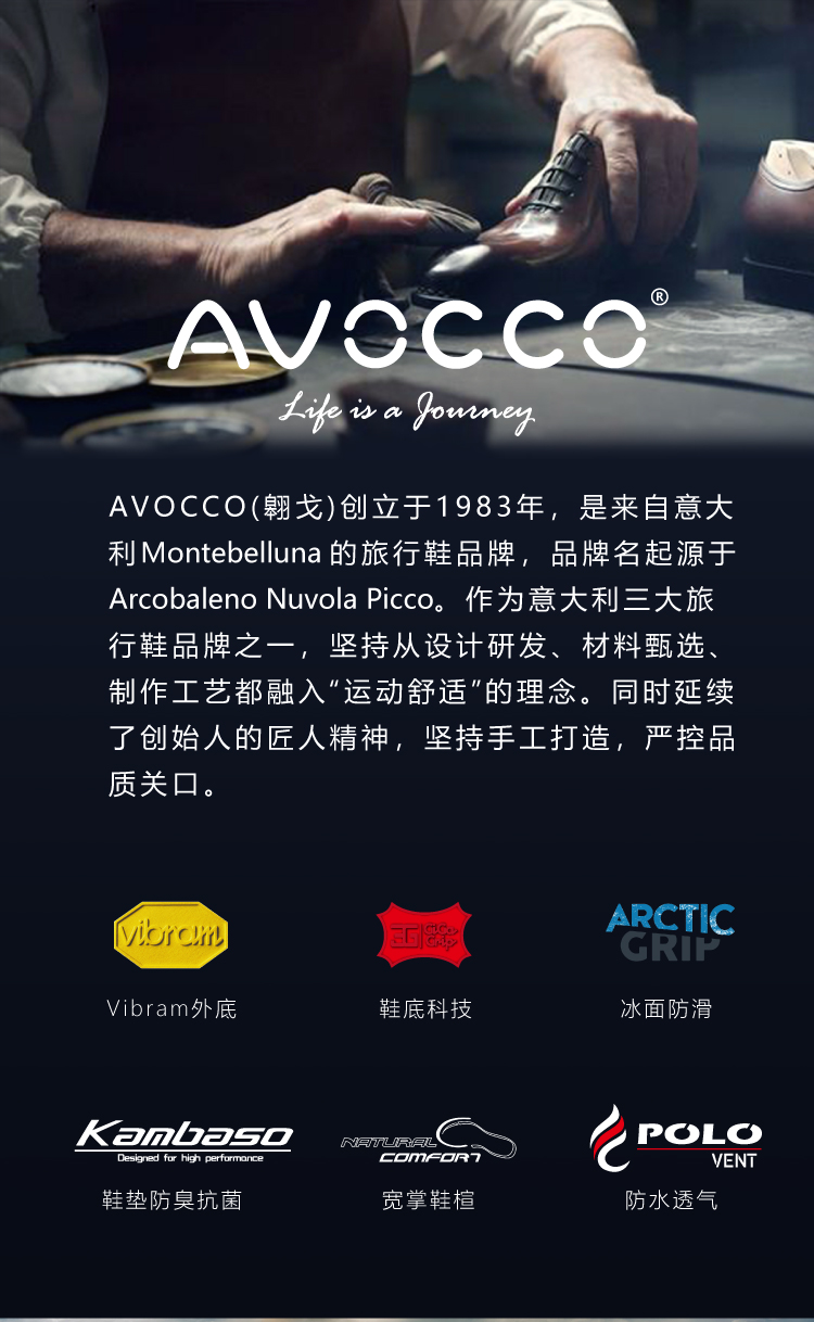 AVOCCO品牌来自于意大利著名制鞋小镇—Montebelluna,创立于1983年。秉承旅旅行和运动的基因,采用全球优质原料、与时俱进的工艺将产品做到舒适、合脚、仿生、时尚。