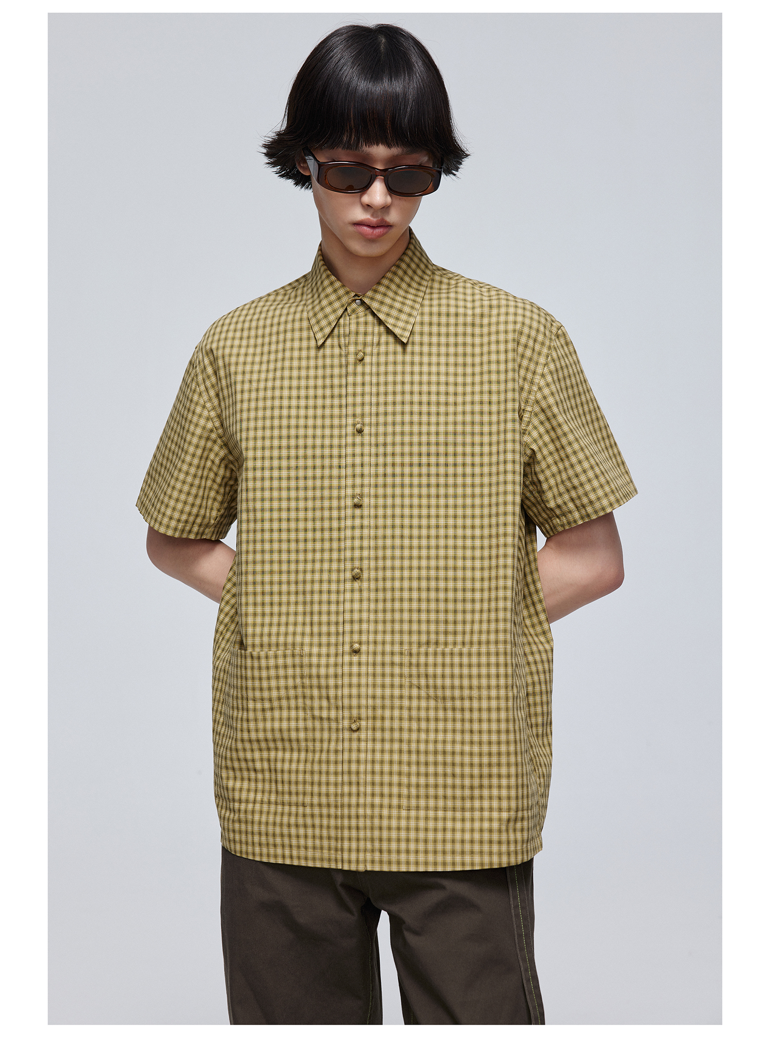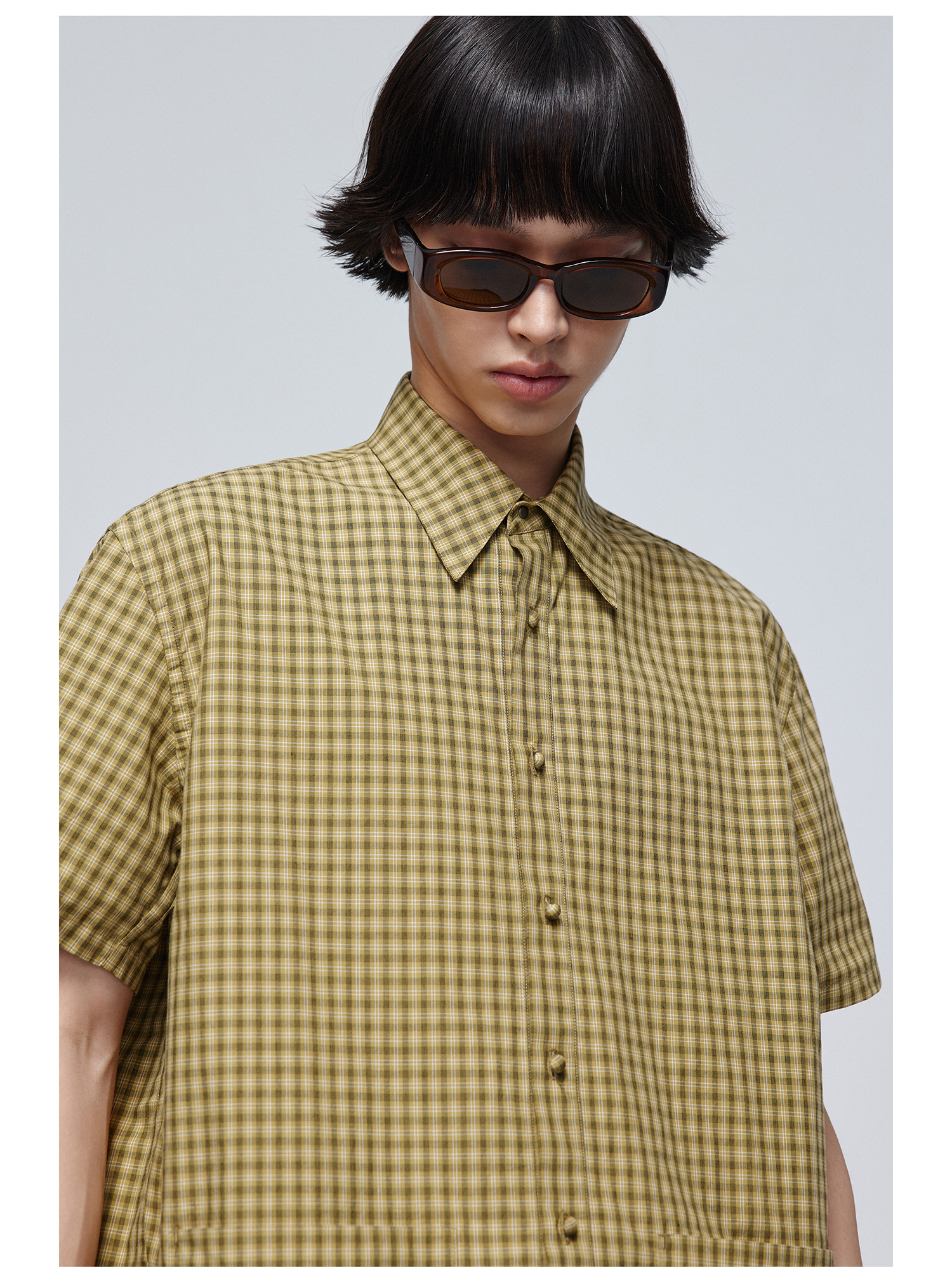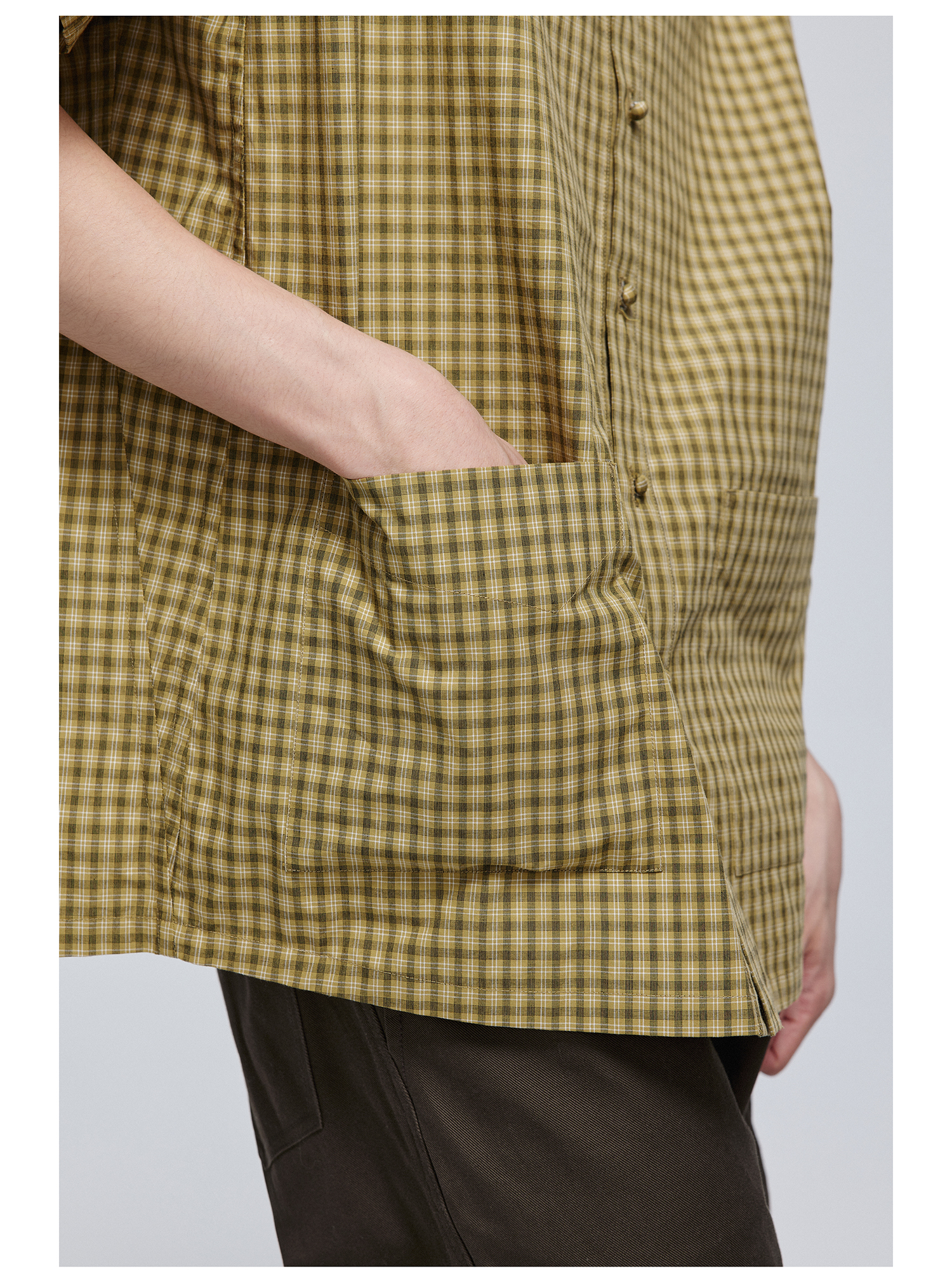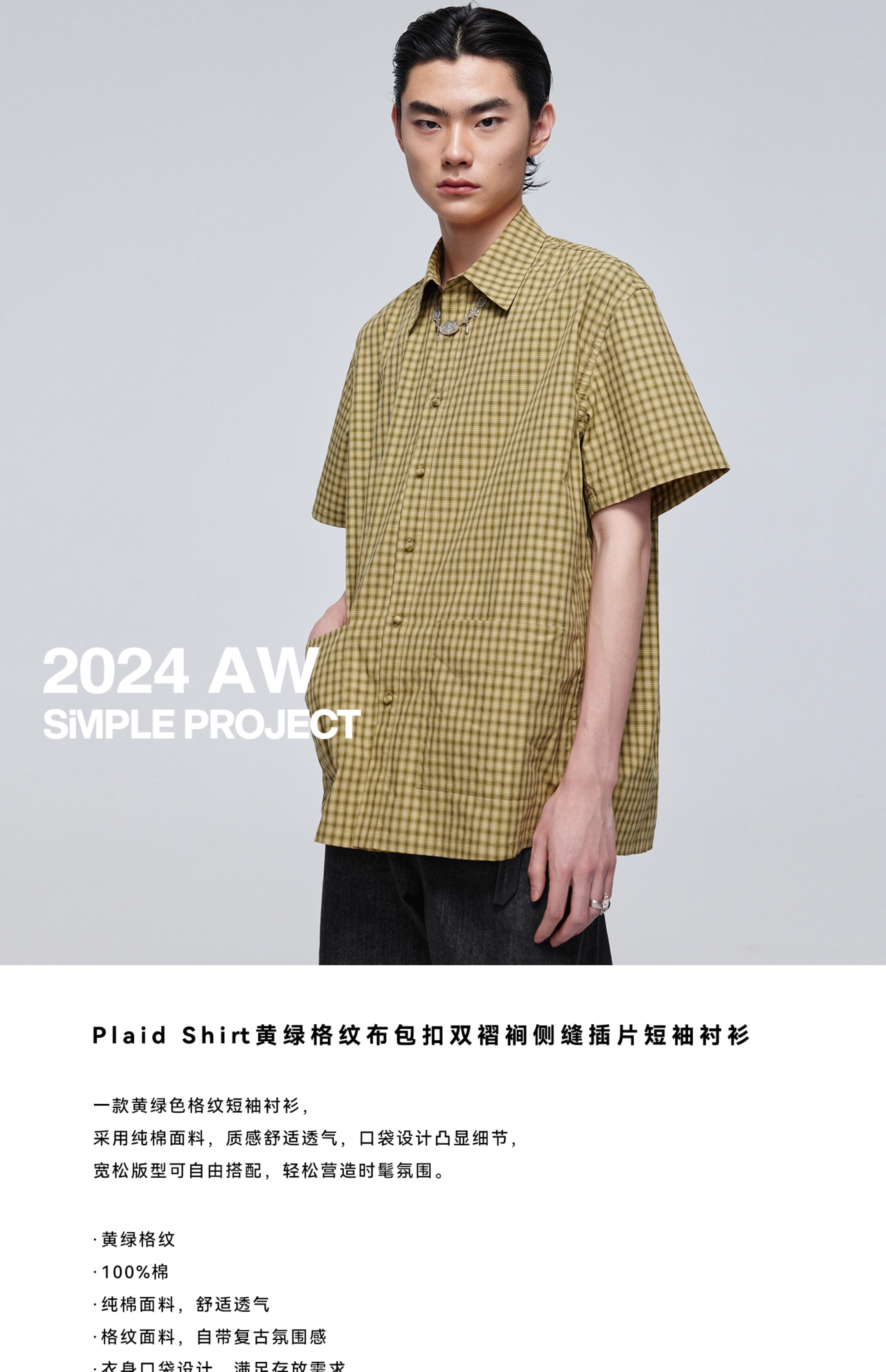 Simple Project/Y24117/黄绿格纹布包扣双褶侧缝插片短袖衬衫