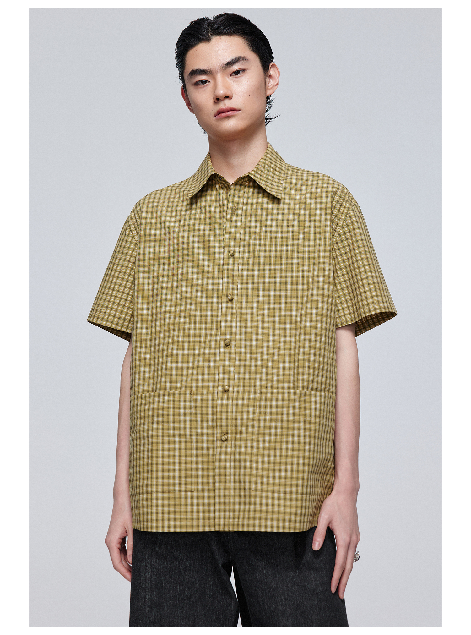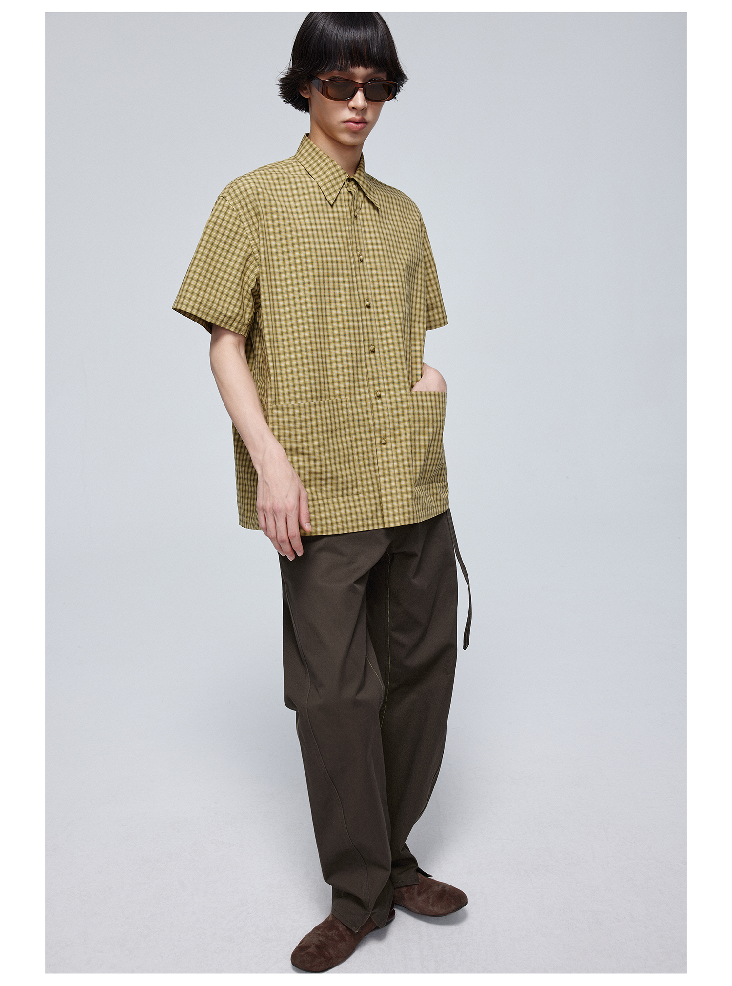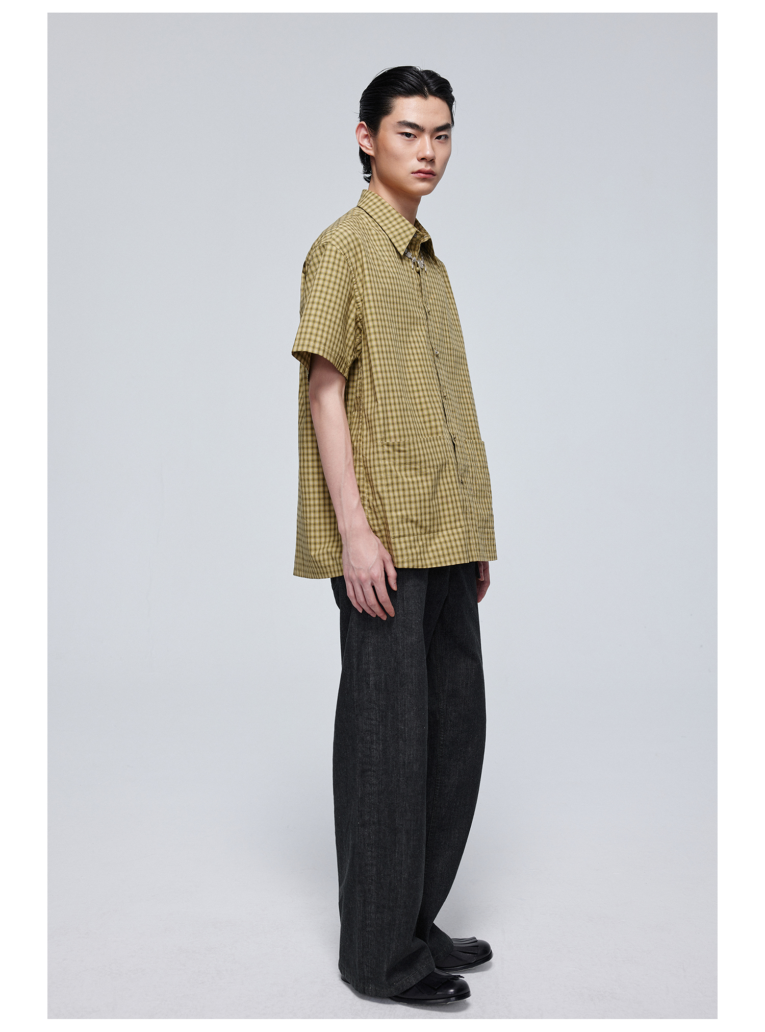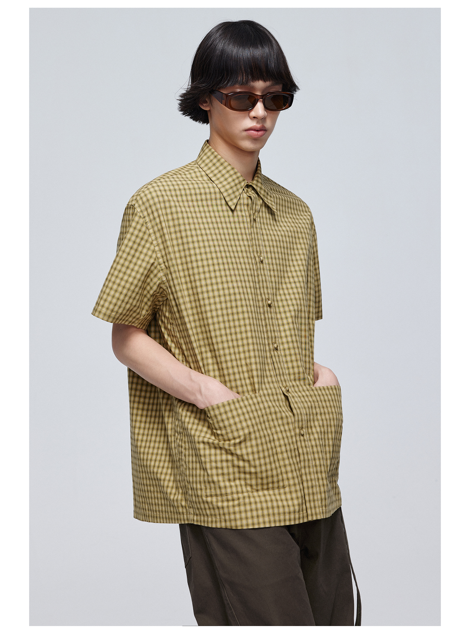 Simple Project/Y24117/黄绿格纹布包扣双褶侧缝插片短袖衬衫