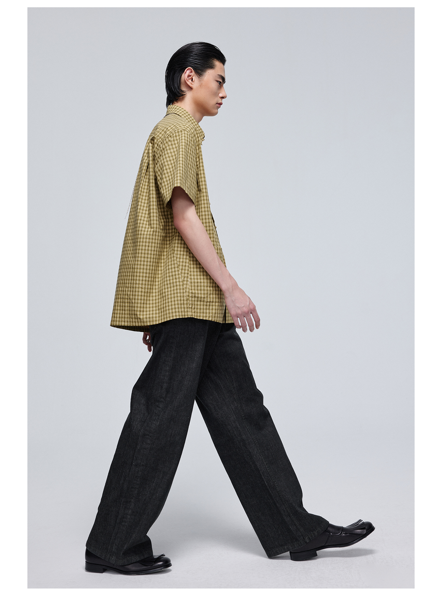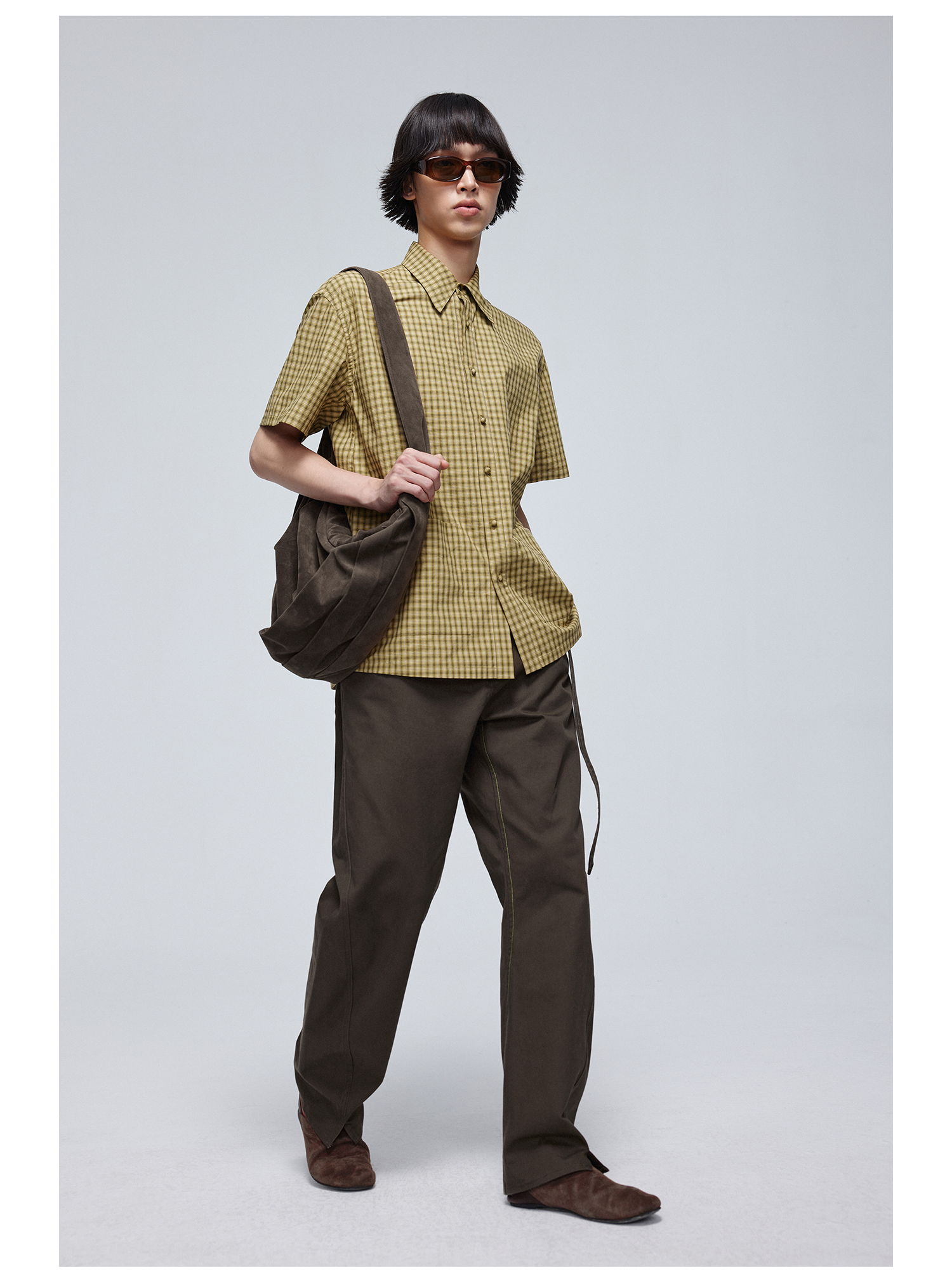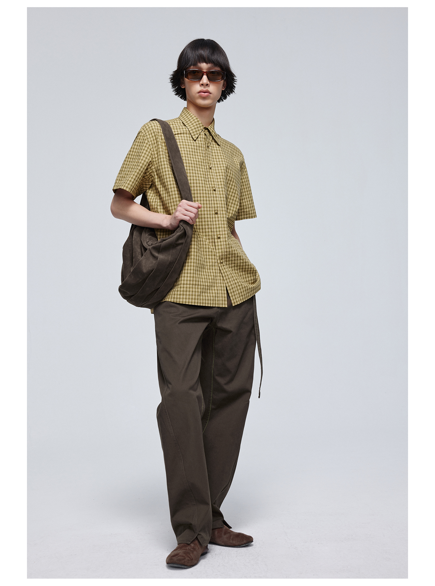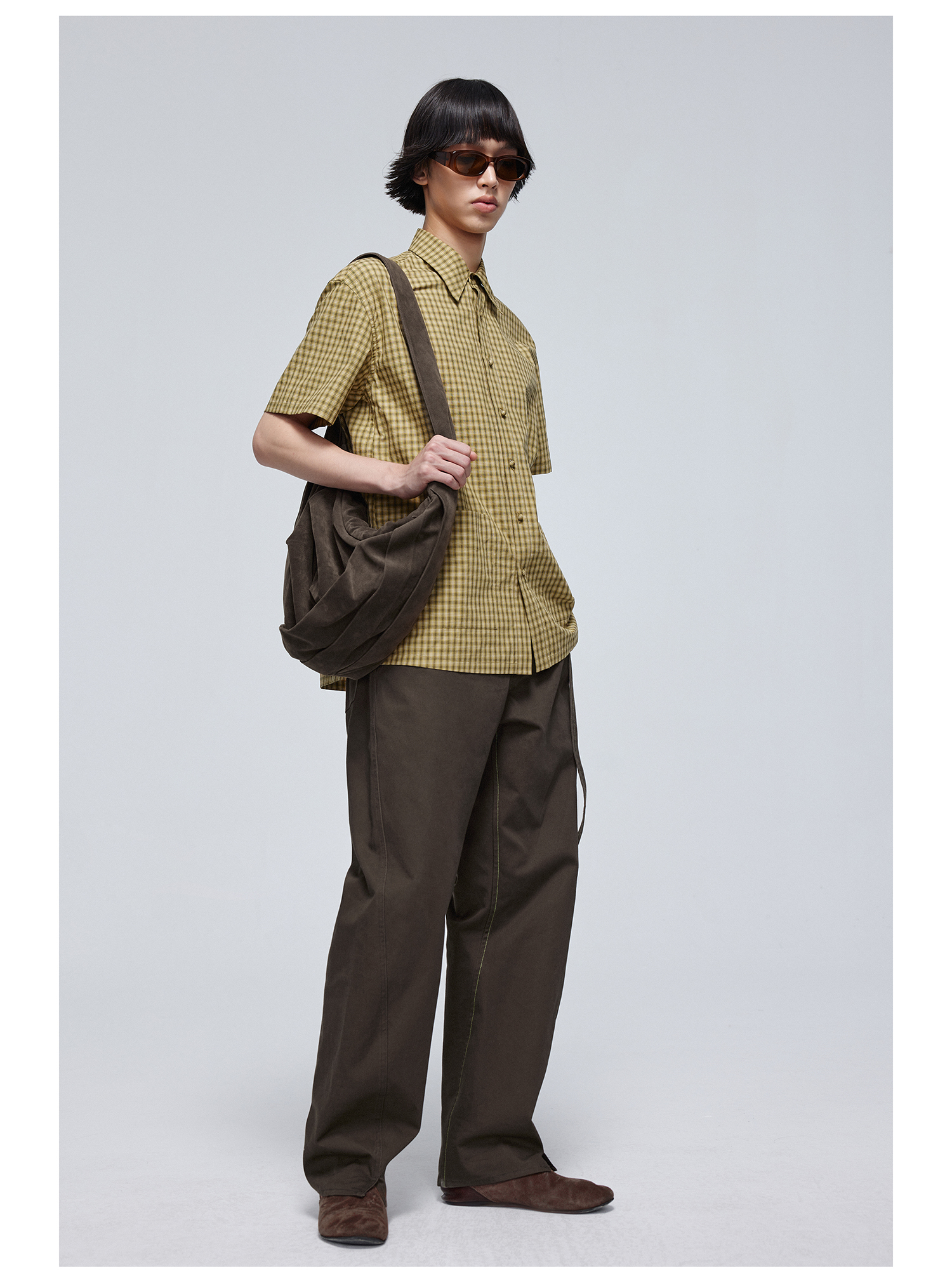 Simple Project/Y24117/黄绿格纹布包扣双褶侧缝插片短袖衬衫