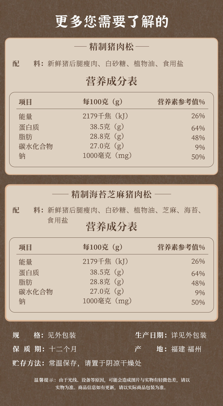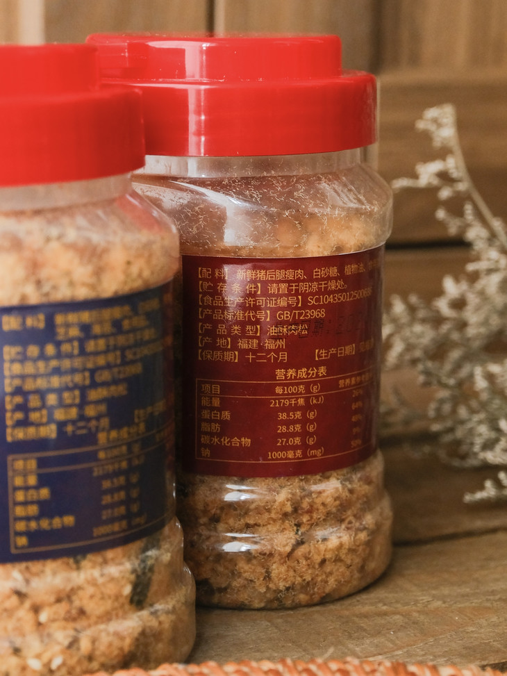 来自福州传统金字品牌「立日有」肉松! 满口香酥!肉松天花板 百年匠心工艺传承 代代相传,制成美味可口的肉松 口碑老字号,肉松入口,香满四溢 没有胃口时,白粥➕肉松,好吃又营养 拒绝科技与狠活,只选用4小时温体猪后腿肉 古法炒制,4-5斤猪肉1斤松 0添加色素、香精,全家吃得安心 0鸡肉 0添加剂 0豌豆粉 从没见过配料表这么干净的肉松 纯猪肉!纯猪肉!纯猪肉! 史上zui良心zui干净的肉松 靠一张配料表吊打全场