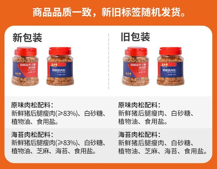 采用祖传的切肉法,配以火候严格的烹调技艺 焙制出的肉松不干燥、不潮湿,蓬松又酥脆 优质的食用盐搭配白砂糖,适量比列的调料搭配 给您带来咸甜适中的味觉体验