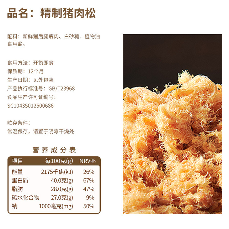 在原材料的选择上没有半点马虎 精选新鲜猪后腿瘦肉,肉块纤维很长 是公认的做肉松的好部位 肉松的炒制过程中不添加豌豆粉 更适合儿童与老人食用 入口易化,有利于消化,更好的让人体吸收