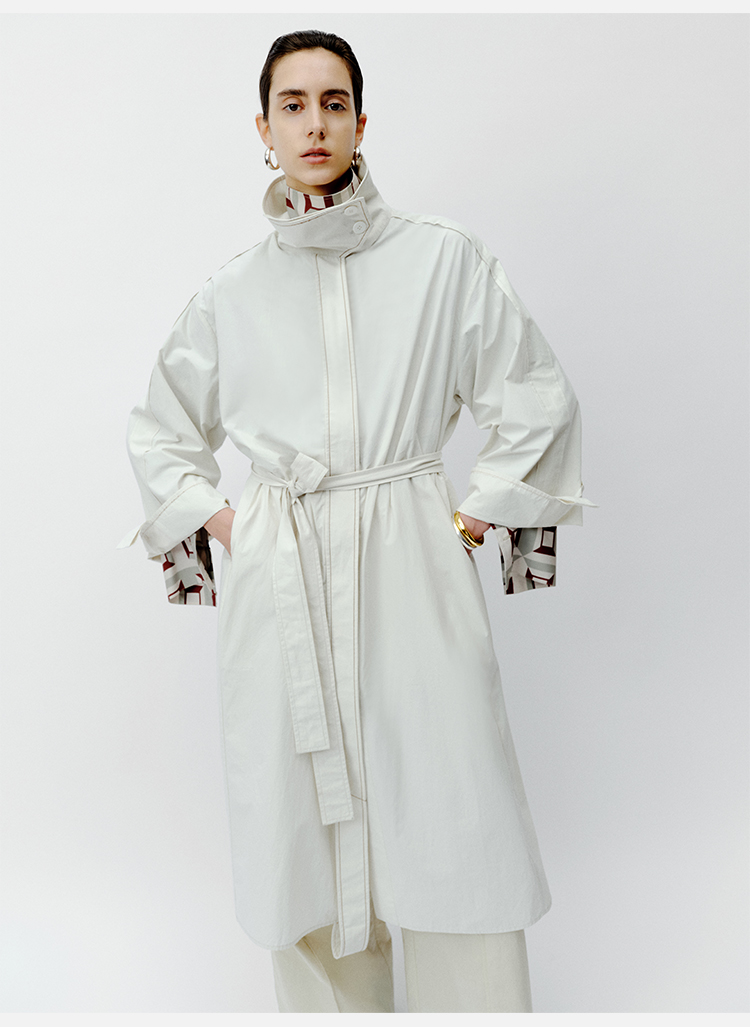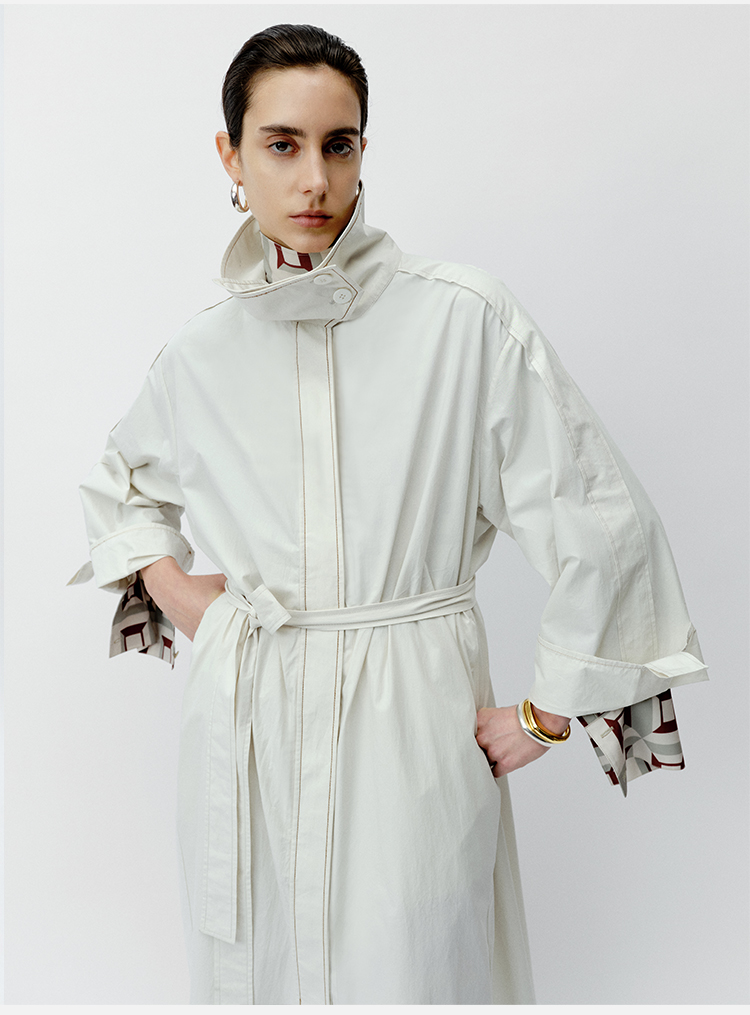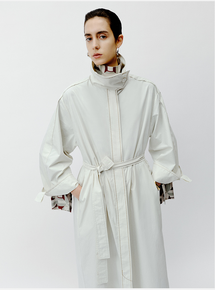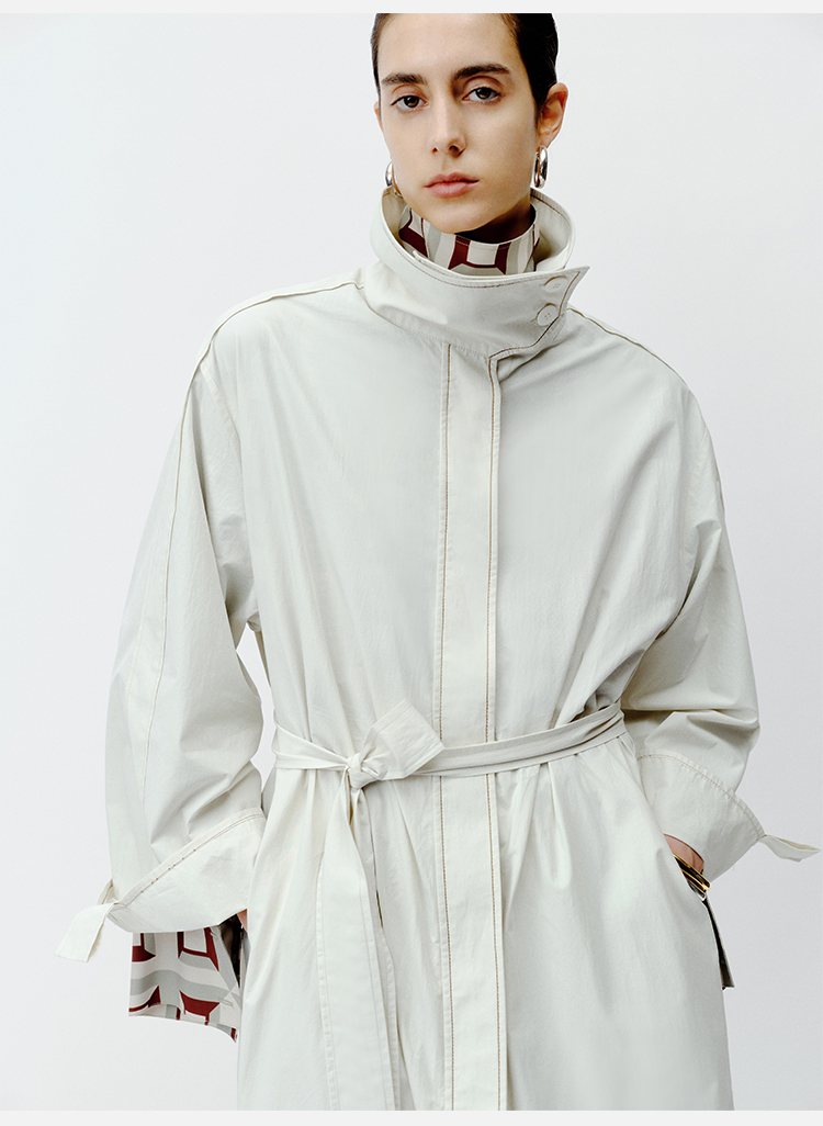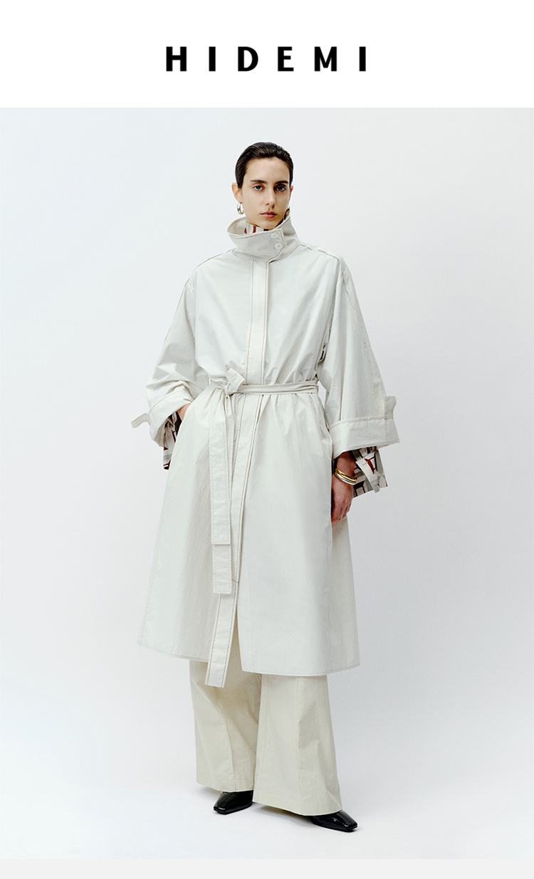 HIDEMI 极简设计感明线廓形立领腰带式长款水洗棉风衣
