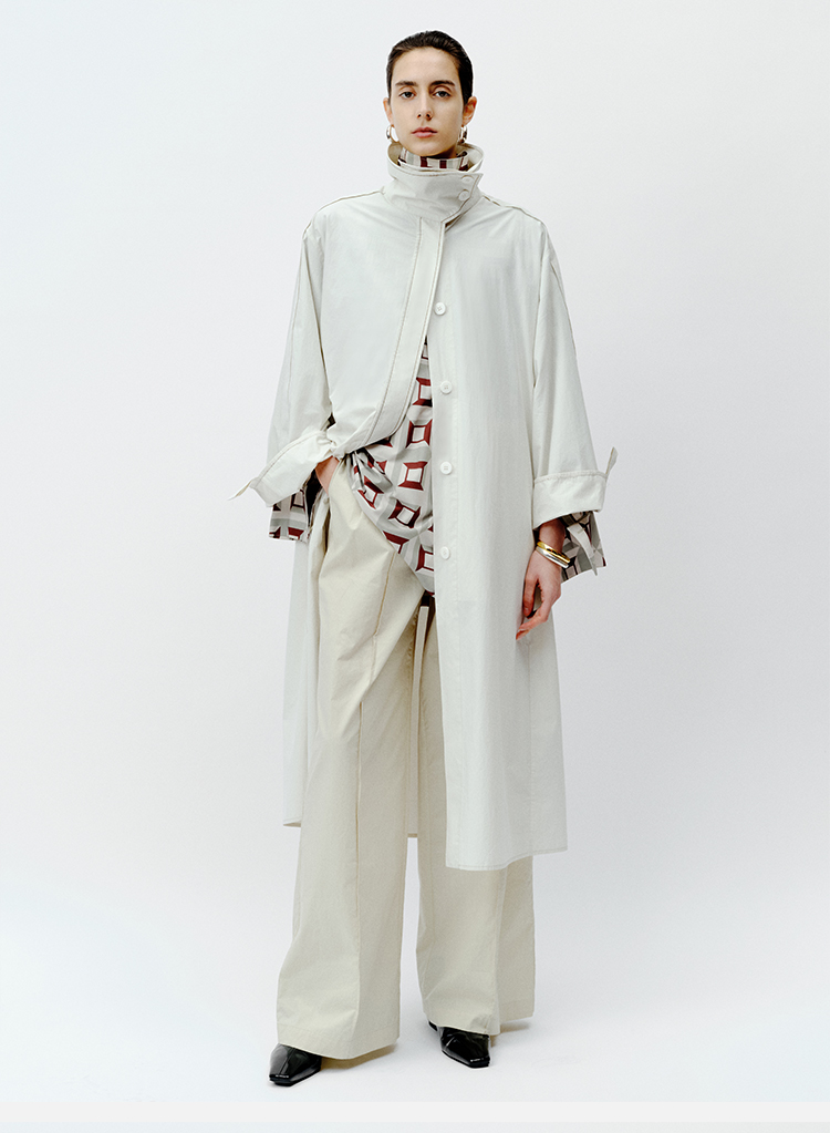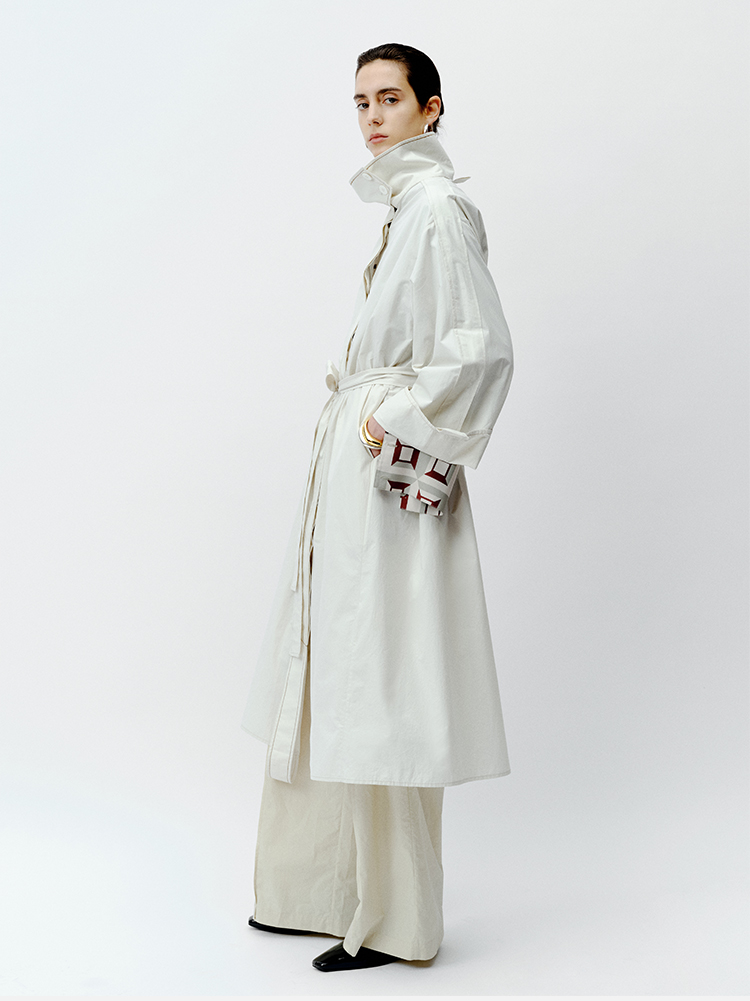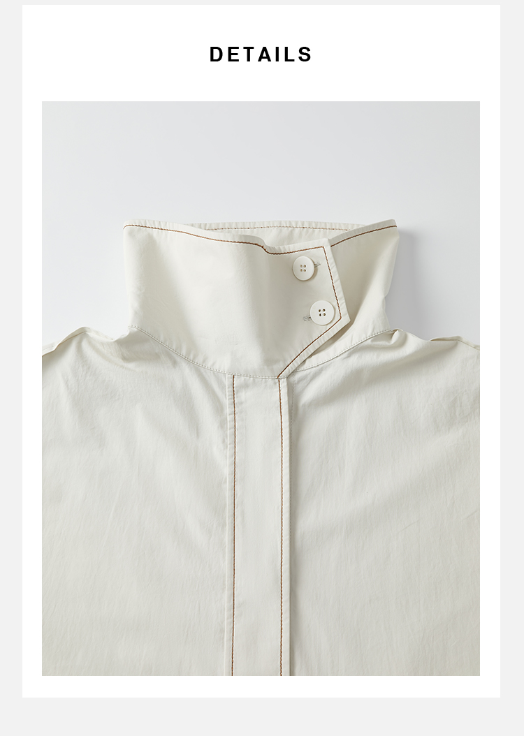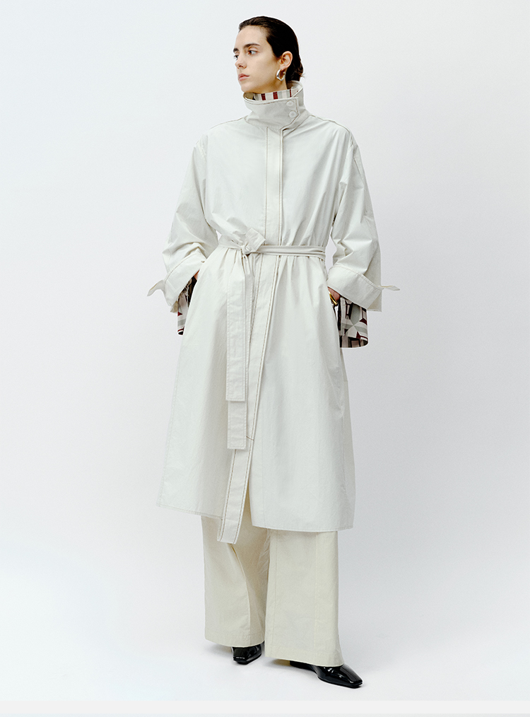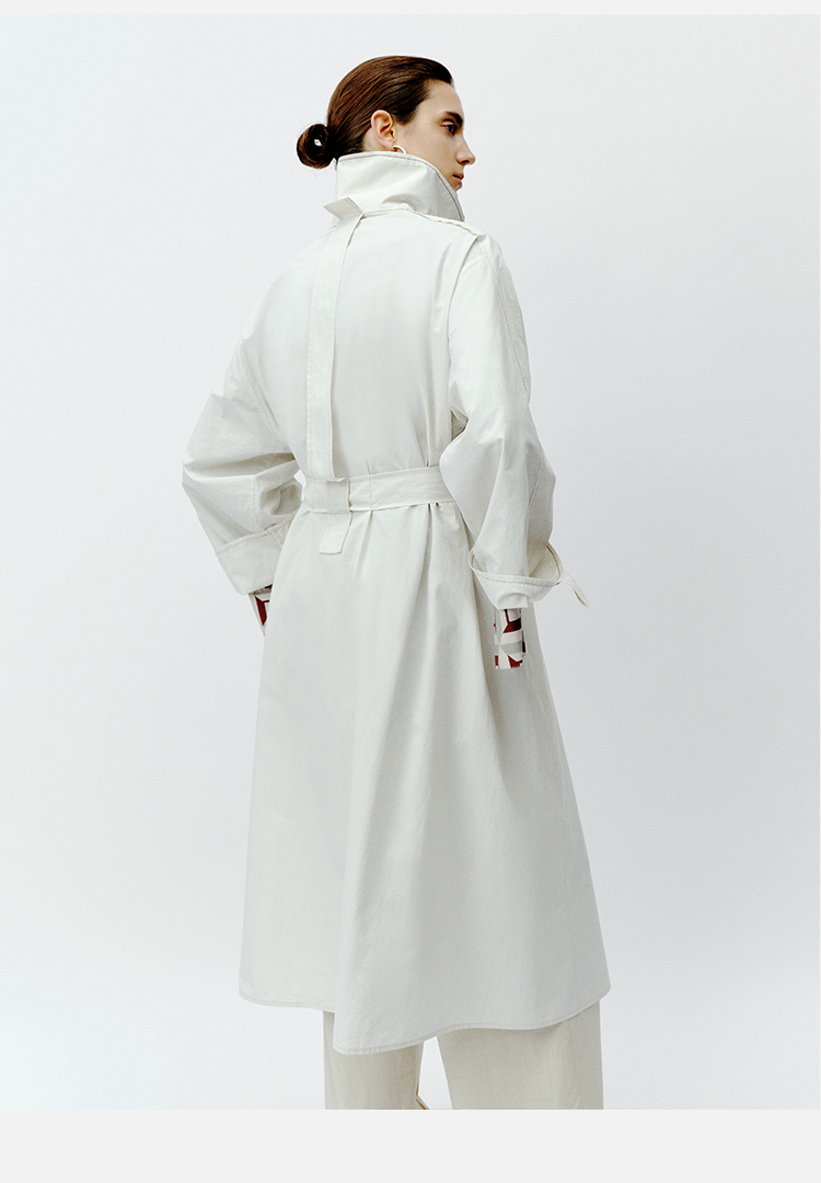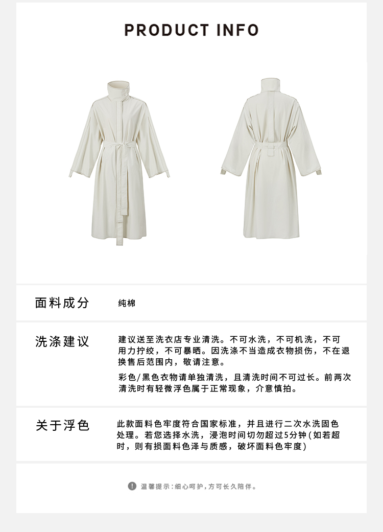 HIDEMI 极简设计感明线廓形立领腰带式长款水洗棉风衣
