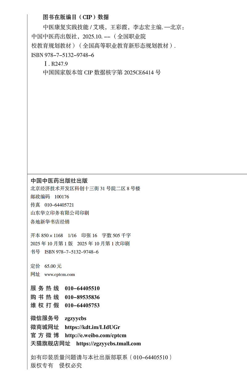中医康复实践技能 全国高等职业教育新形态规划教材 艾瑛 王彩霞 李志宏 供康复治疗技术中医学临床医学系专业使用中国中医药出版社