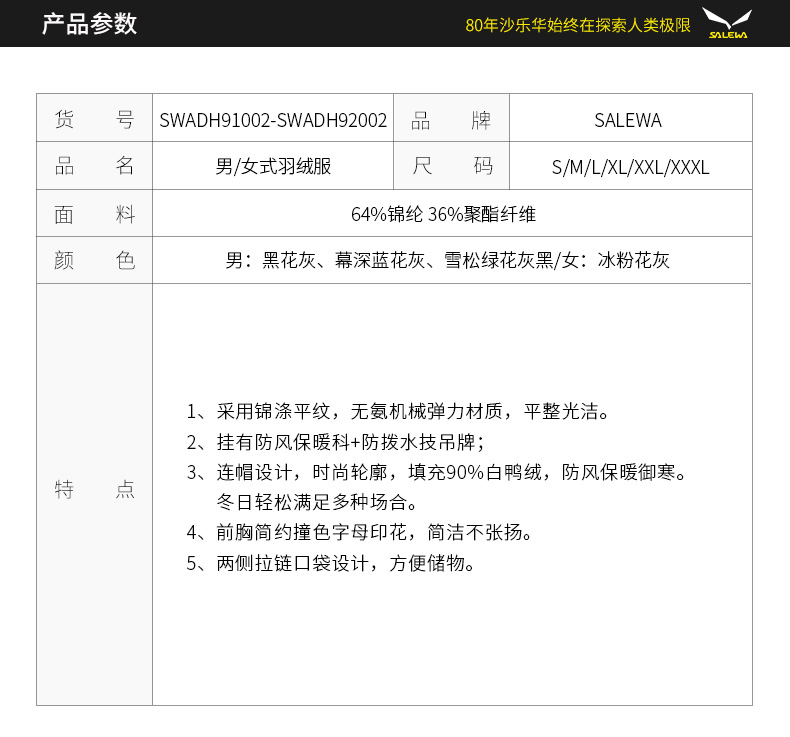 SALEWA|男女式羽绒服 SWADH92002/SWADH91002