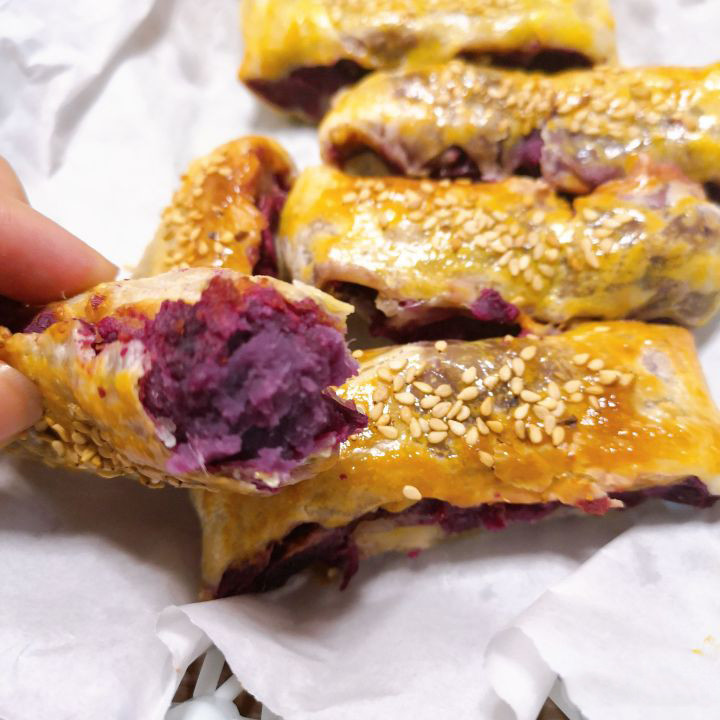蛋挞。安佳黄油手抓饼、鸡蛋、奶粉,建议吃多少烤多少,边烤边吃,热乎乎的特别好吃,手抓饼皮酥脆,蛋挞液甜甜的(奶粉也很甜,所以没放糖)。