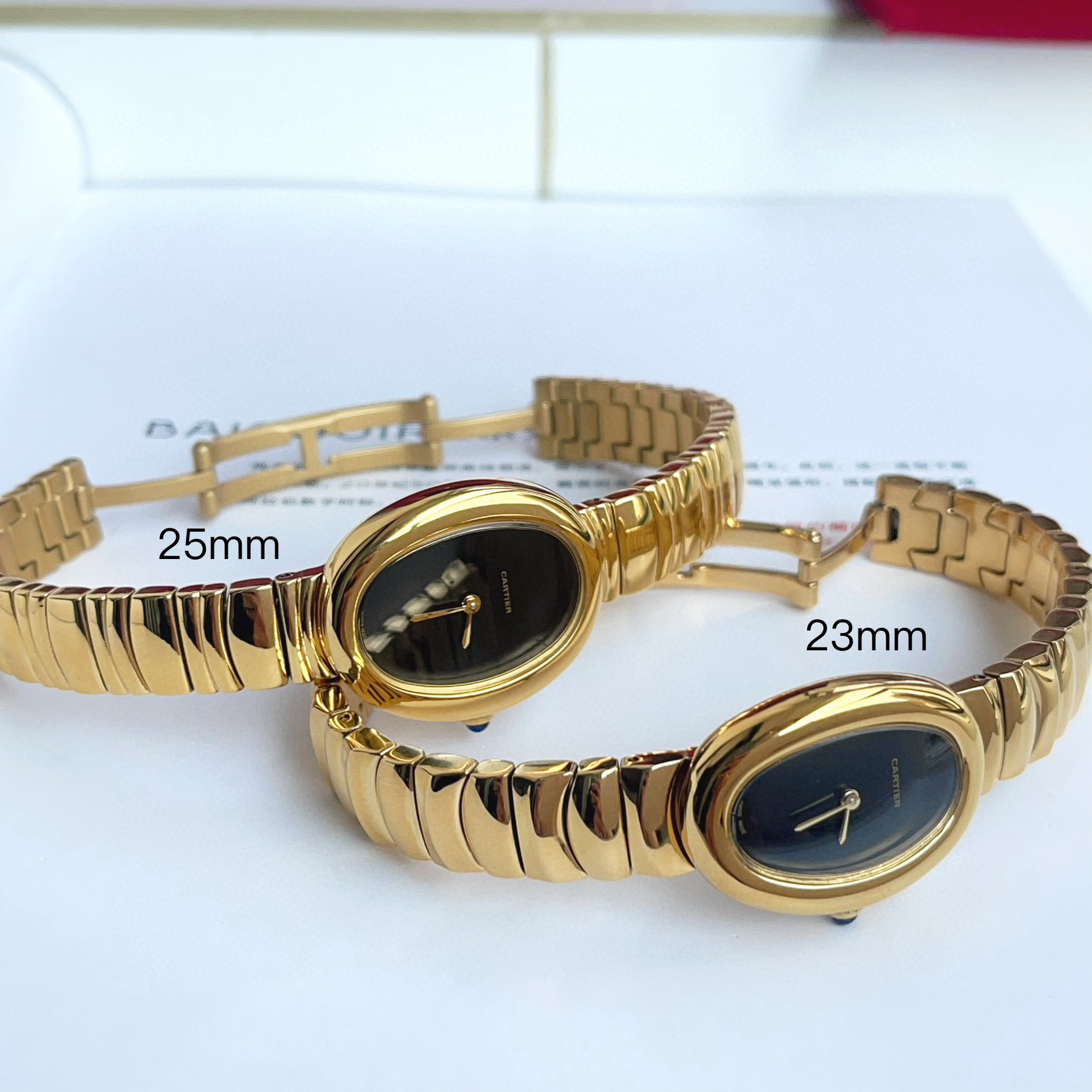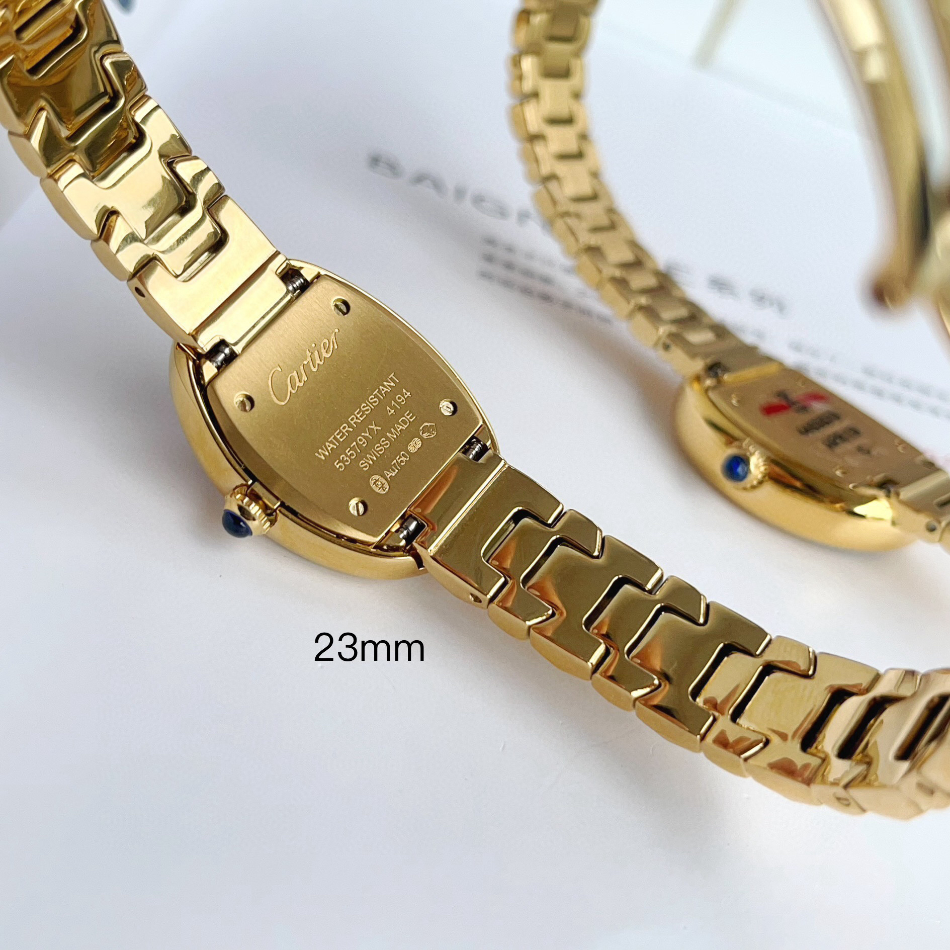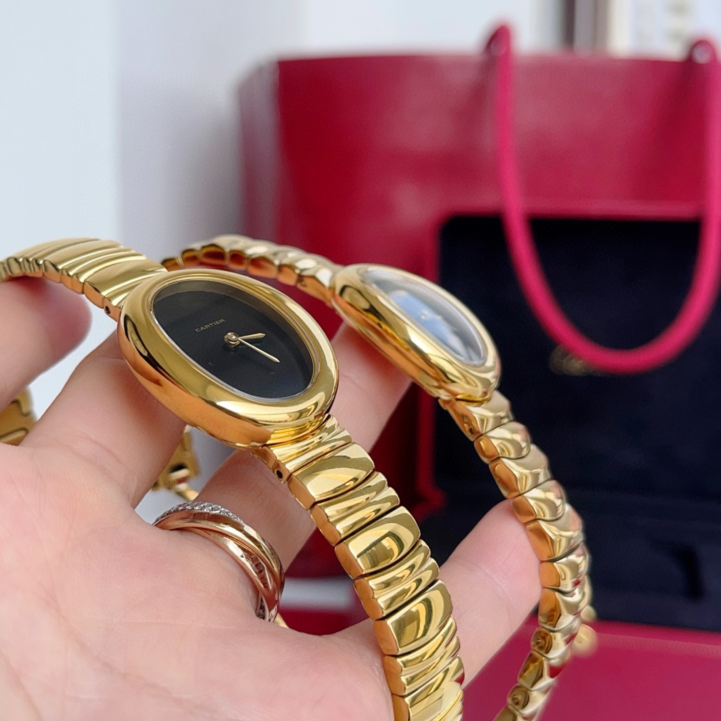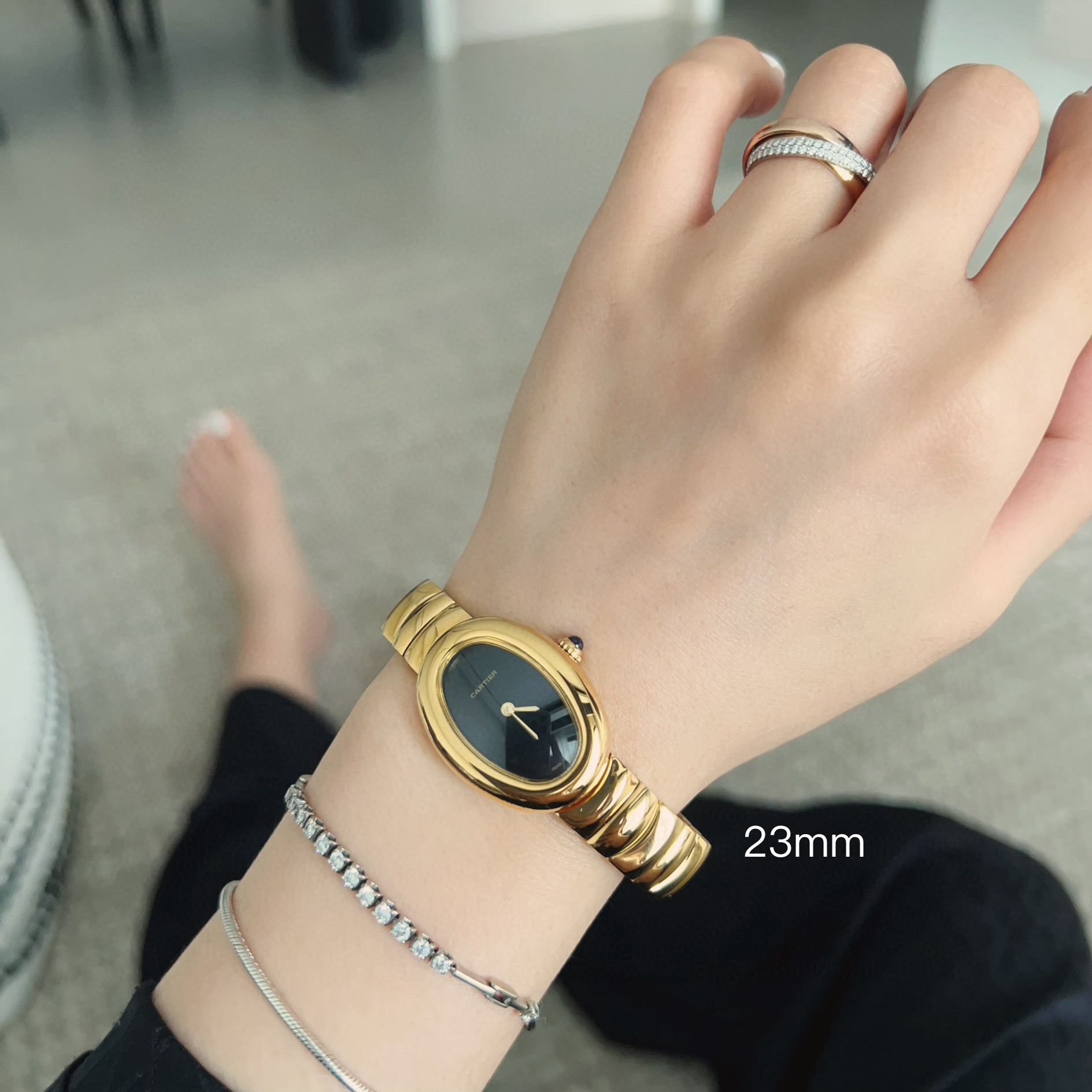 卡地亚浴缸Baignoire1920手镯系列,进口瑞士石英机芯,316L精钢表壳表扣,剑型黄金色指针,标志性金色logo印记,弧形水晶镜面,极简黑色表盘,展现复古单色美学,表壳尺寸: