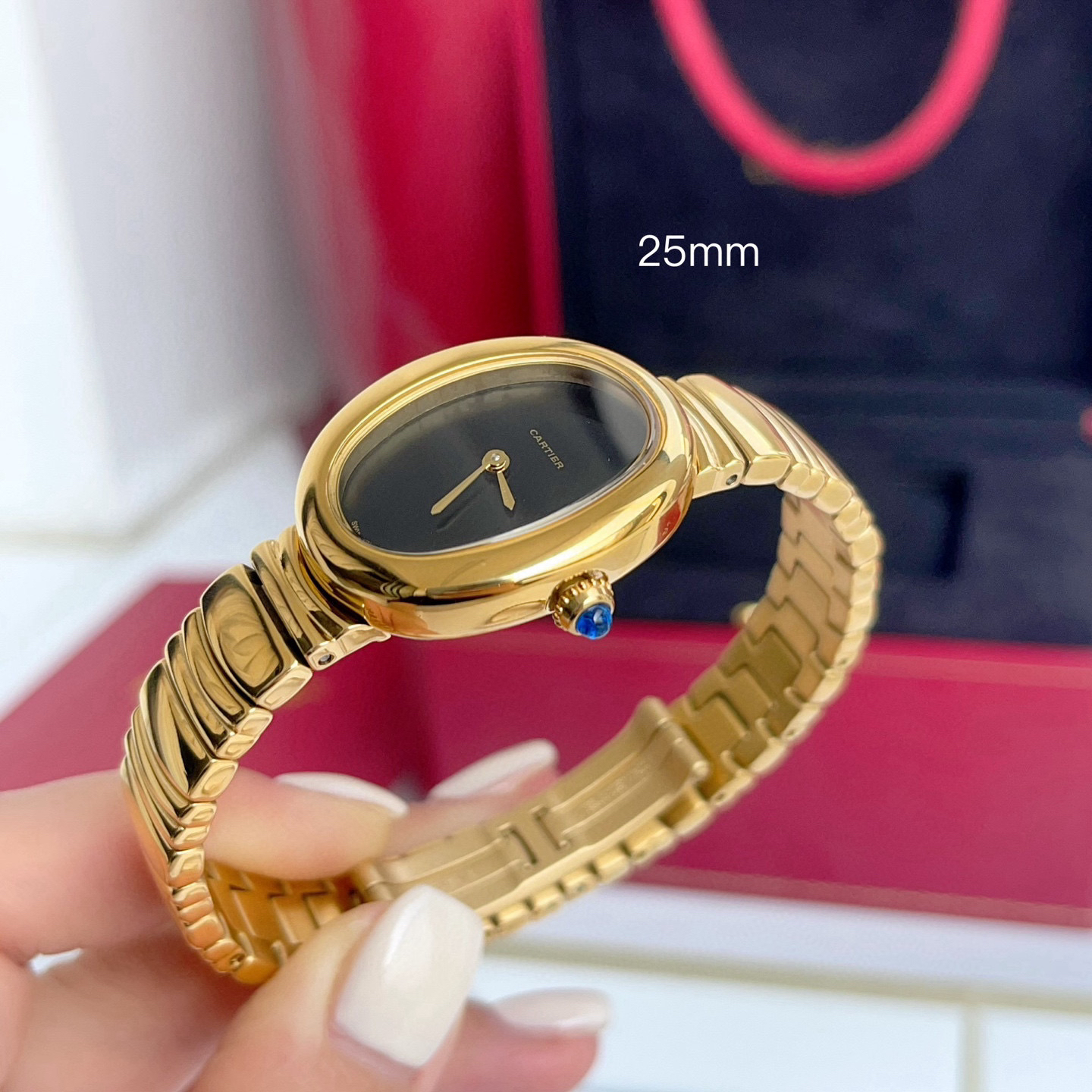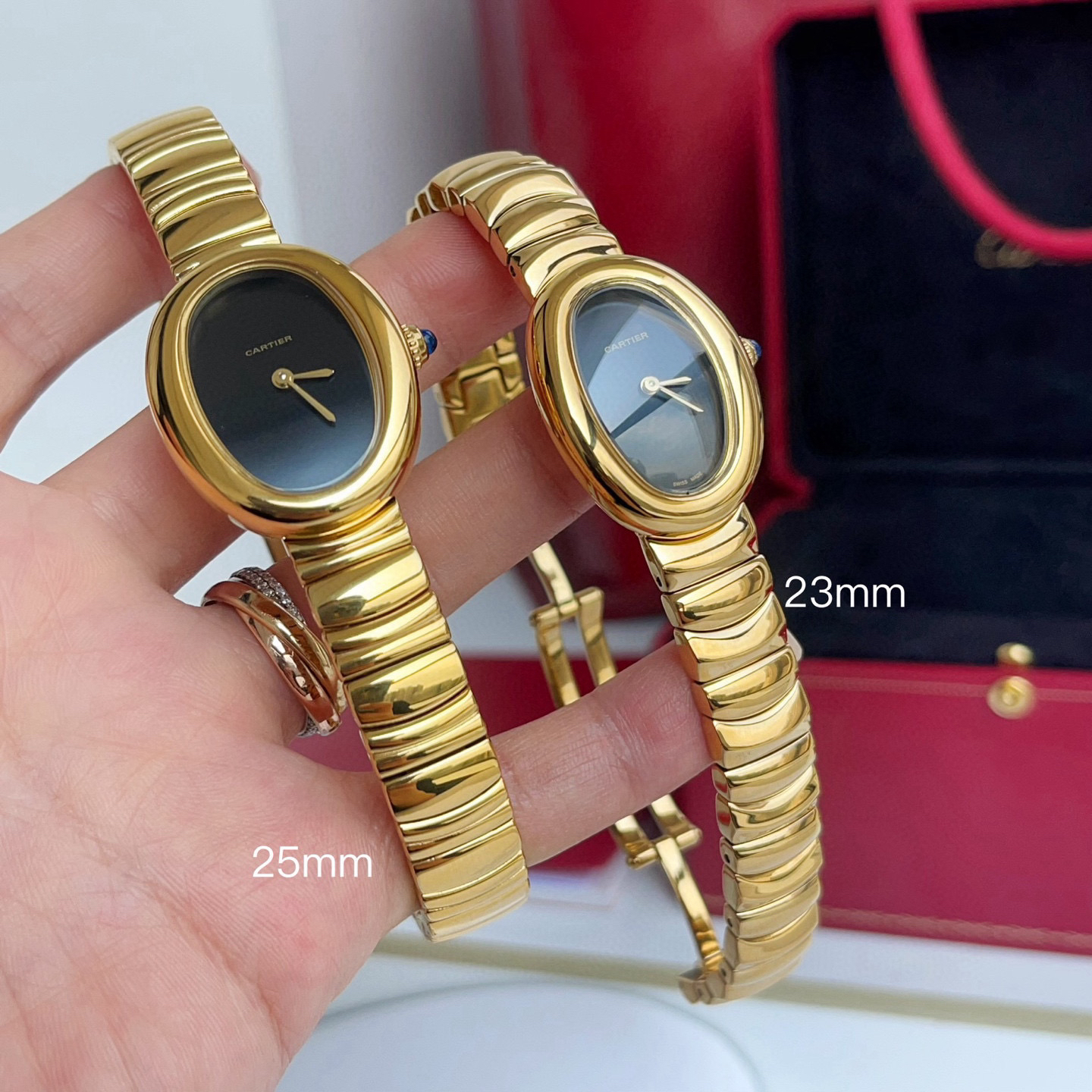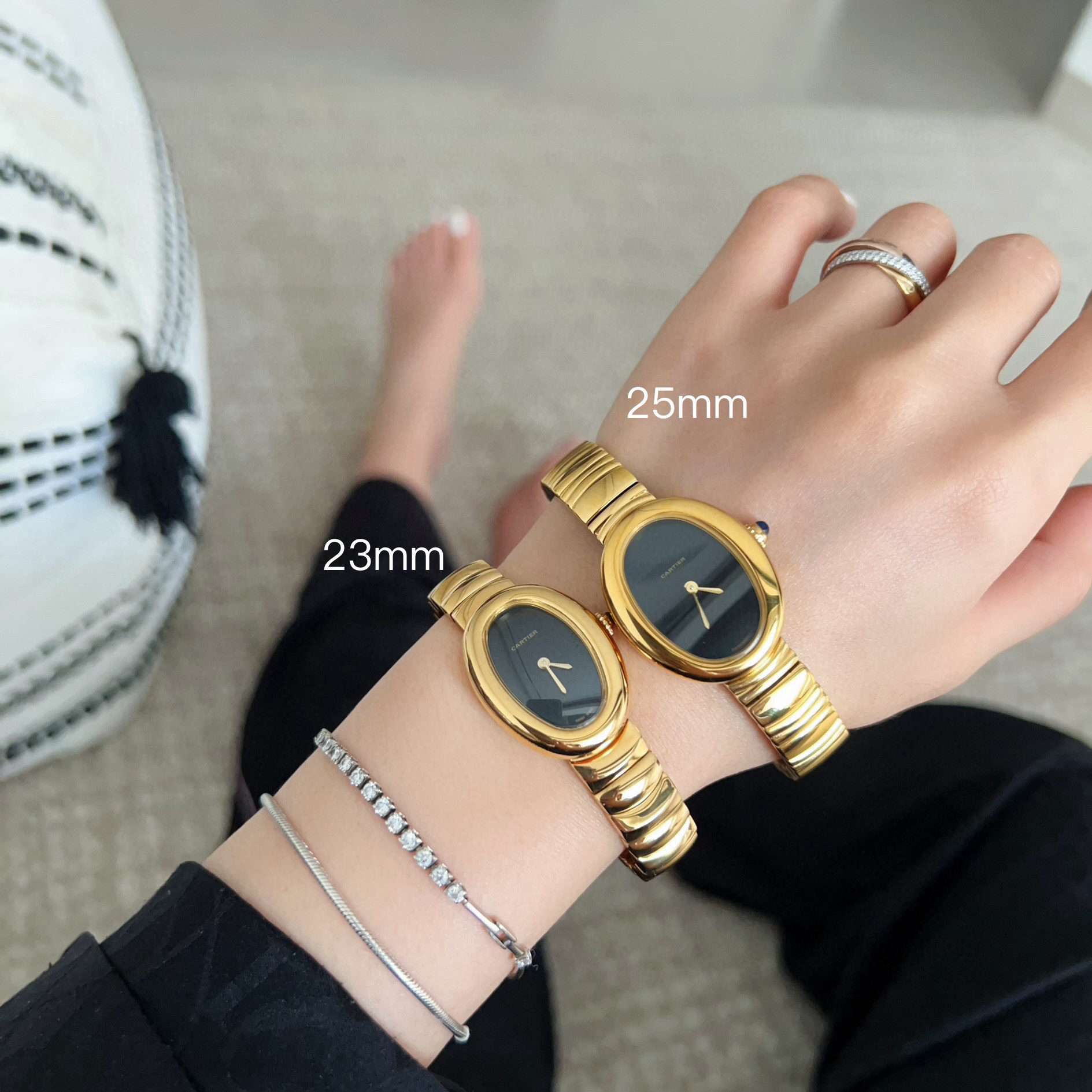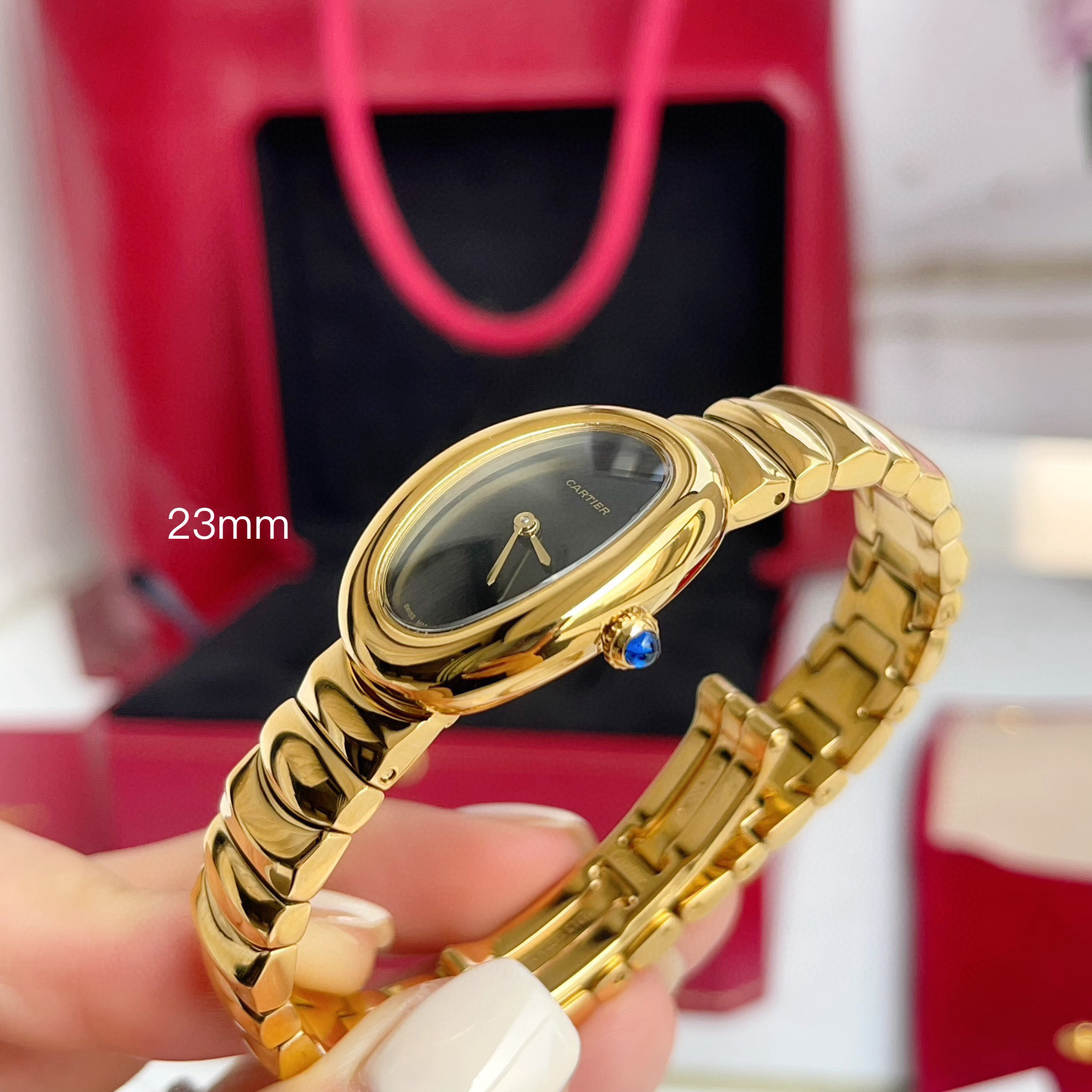 卡地亚浴缸Baignoire1920手镯系列,进口瑞士石英机芯,316L精钢表壳表扣,剑型黄金色指针,标志性金色logo印记,弧形水晶镜面,极简黑色表盘,展现复古单色美学,表壳尺寸: