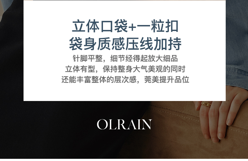 - “精致”是欧芮儿olrain品牌文化的核心,欧芮儿认为,精致的女人,不但要外在动人,更要内在迷人,内外兼修,有魅力、有气质、有内涵,自信而不自傲,优雅而不矫揉,自有万种风情而不轻浮,更不故作矜持。