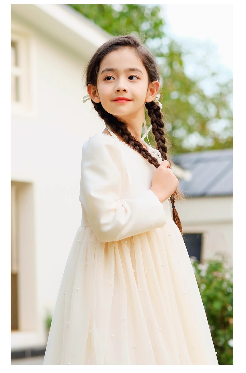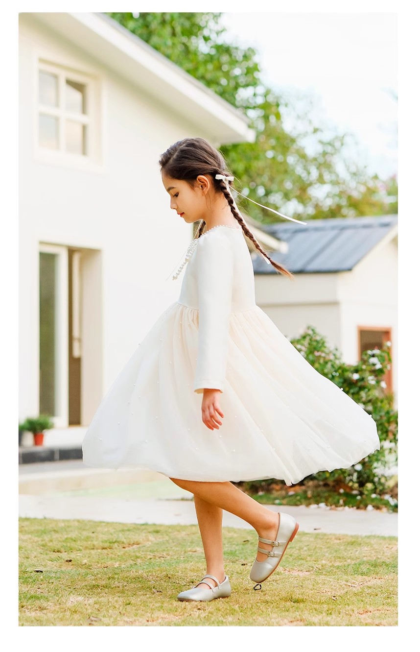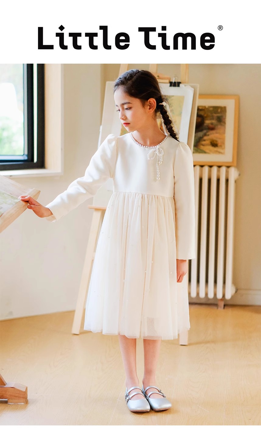 littletime女童轻奢珍珠2024新春款法式小香风纱纱A摆连衣裙