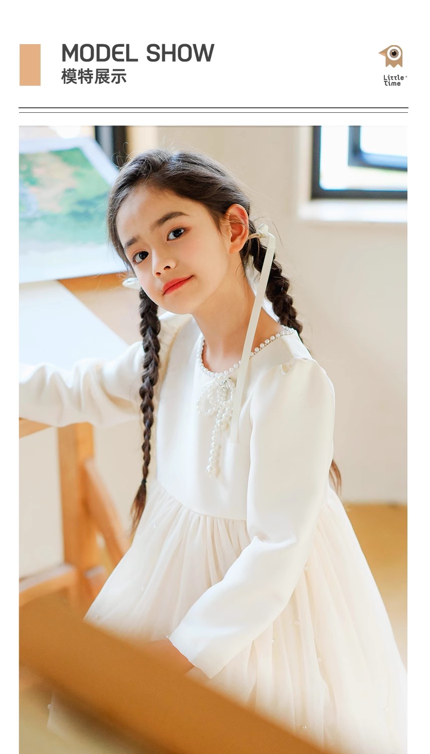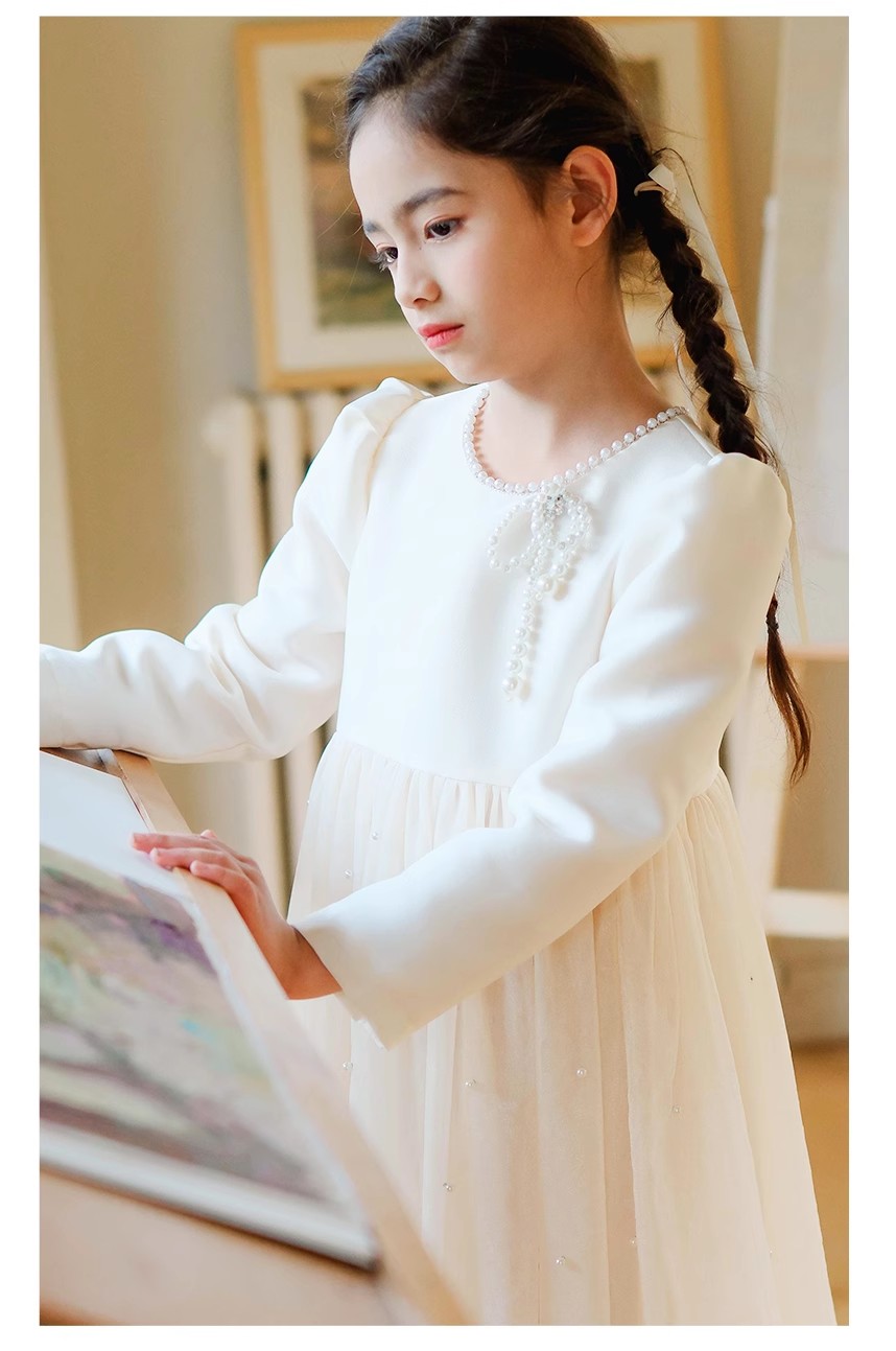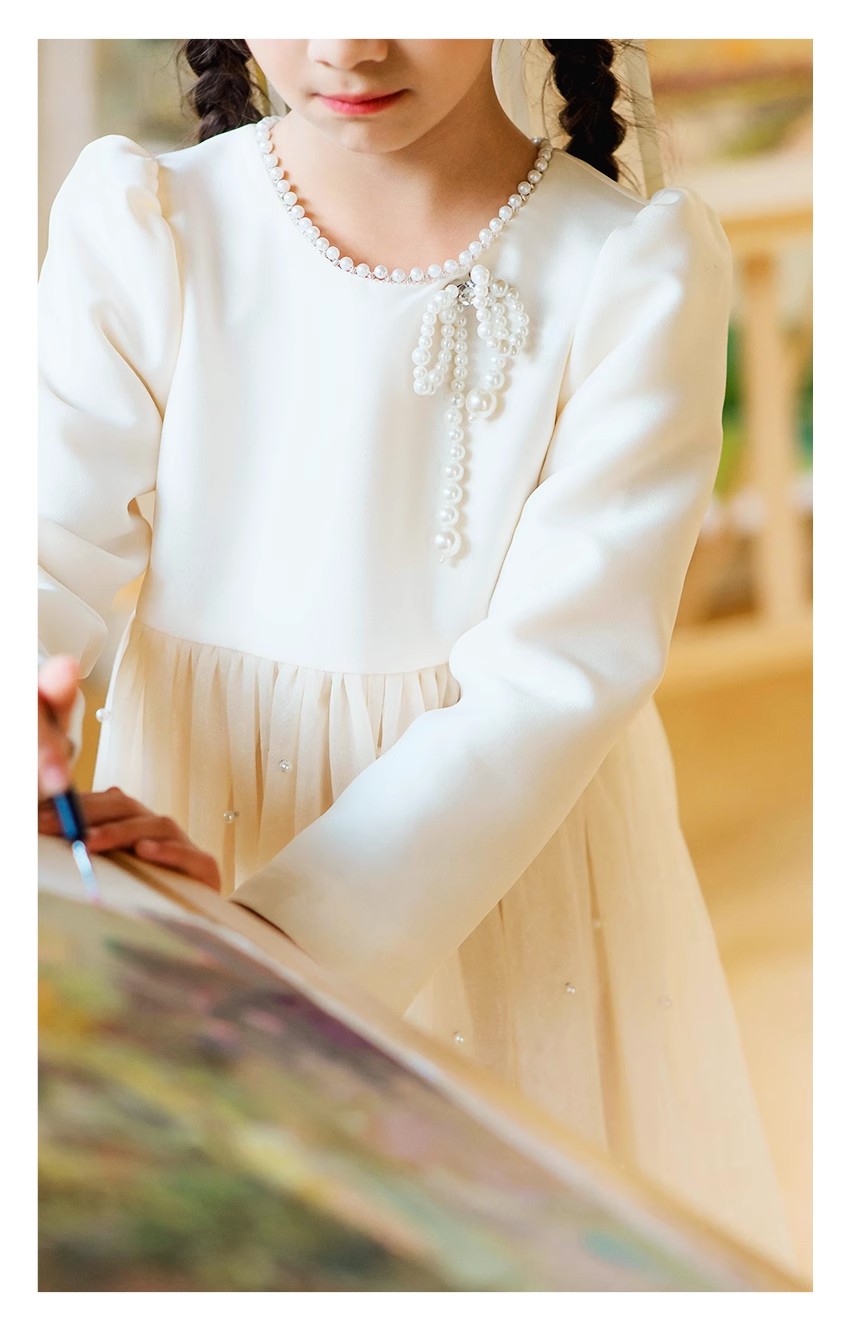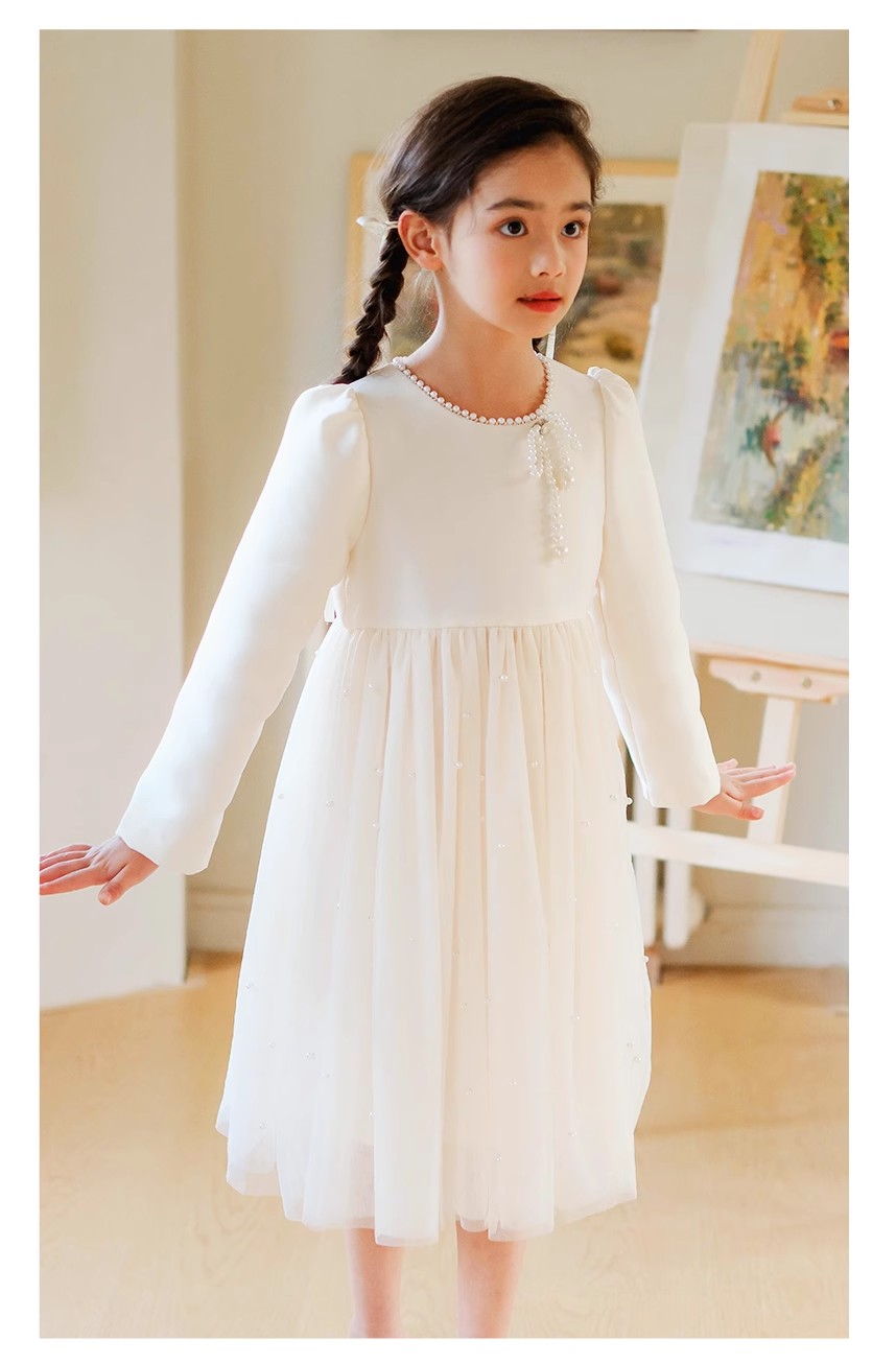 littletime女童轻奢珍珠2024新春款法式小香风纱纱A摆连衣裙