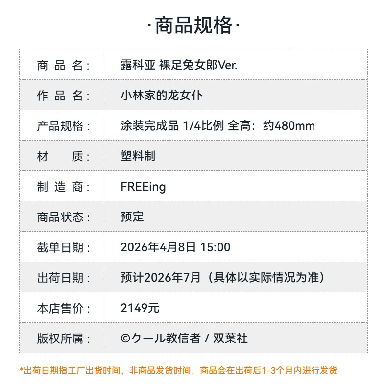 【GSC预售定金】1/4比例 露科亚 裸足兔女郎Ver. 小林家的龙女仆