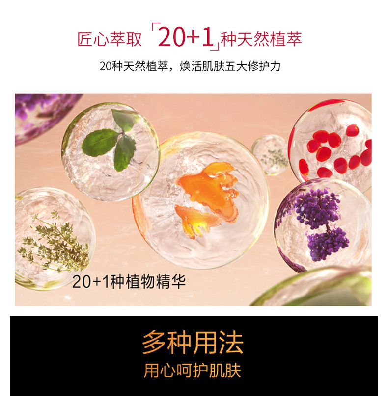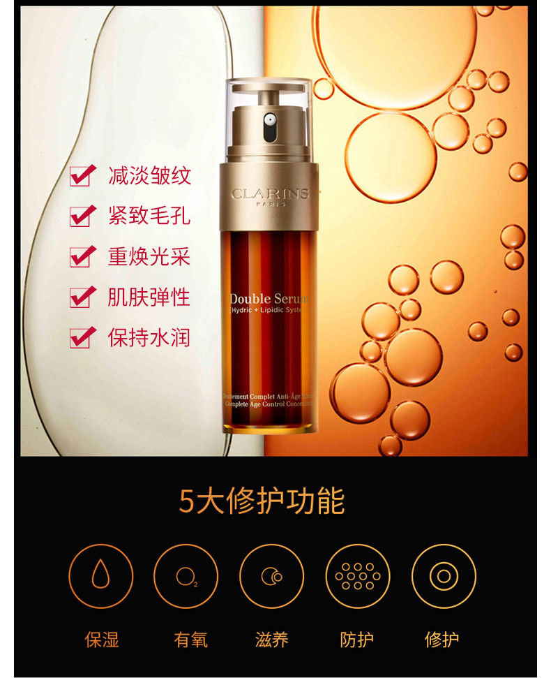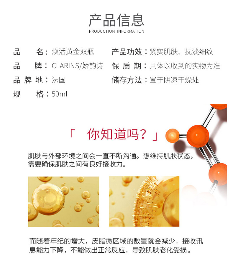 娇韵诗[黄金双瓶]五大修复功效: 1.重塑肌肤:重塑肌肤内在构造,促进表皮和真皮生长,提高胶原蛋白弹性,愈显光滑紧致。 2.有氧:帮助肌肤充分有氧呼吸,改善血液循环,自内绽放明亮通透。 3.滋养:改善肌肤营养,补充充沛能量。 4.保护:帮助抵御外界伤害,强化肌肤保护屏障。 5.保湿:有效抚褪干纹