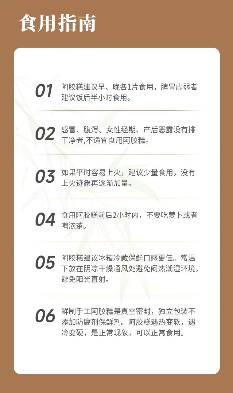【品名】墨驴黑芝麻核桃阿胶糕 【规格】2盒(500g/盒) 【贮存方法】置阴凉、干燥、通风处 【配料】黑芝麻、核桃仁、阿胶、红枣、枸杞、蛋白粉、麦芽糊精、黄酒、冰糖 【禁食人群】婴幼儿,对产品过敏者禁止食用 【注意事项】本品不能代替药物,产品为小袋真空包装,若在购买后发现包装胀气,请勿食用,请在购买出调换 【温馨提示】红枣为机器投核,偶有枣核,敬请食用时注意。 【食用方法】开袋即食(推荐食用量每日1-4块) 【发货时间】下单2-7天内,不接急单 【售后标准】 1、特殊定制礼盒产品不支持7天无理由,破损按比例赔付,若有质量问题请于签收后的24小时内拿快递面单+产品实拍,找客服处理售后,超售后时效,不做售后处理。 2、由于显示器和拍摄光线等因素会造成些微色差,以收到实物为准。 3、个人口感不作为售后理由;品相不好、储存不当不售后不赔付。 4、运输过程中难免有些磕碰礼盒小瑕疵,纸质礼盒有些许轻微变形,不影响外观不在理赔范围。 5、福利开团,微利经营,下单后不支持退改、拦截、拒收。(如一定要拒收拦截需扣除寄出加礼盒折旧费用5元/件) 6、一定要留对正确的收件信息,否则由此造成的无法顺利签收由顾客承担。 拍下即为默认同意以上条款,介意请勿拍,望理解! |