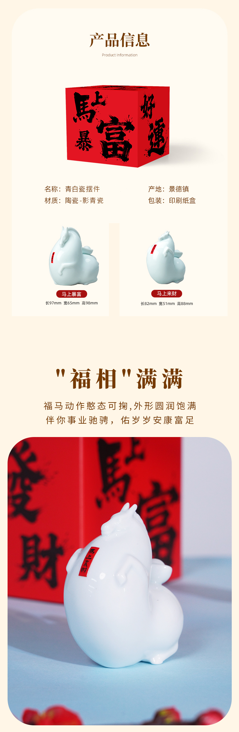 景德镇昌南青白瓷《马上暴富》《马上来财》摆件 捧在手里的“新年头彩” 青瓷马驮着元宝