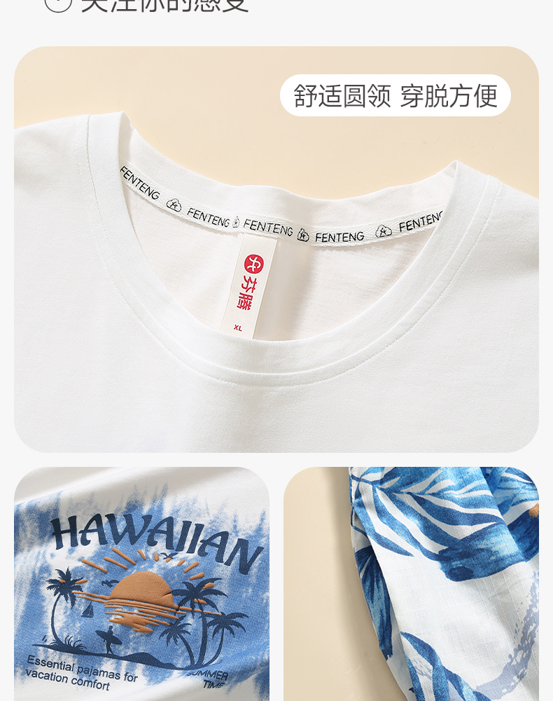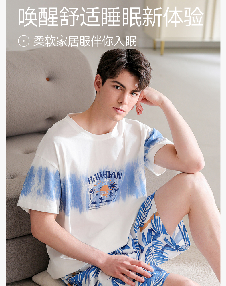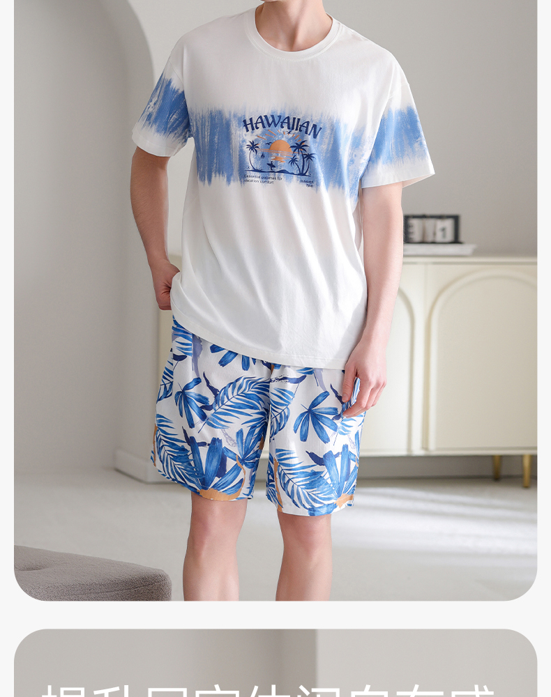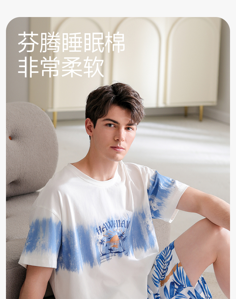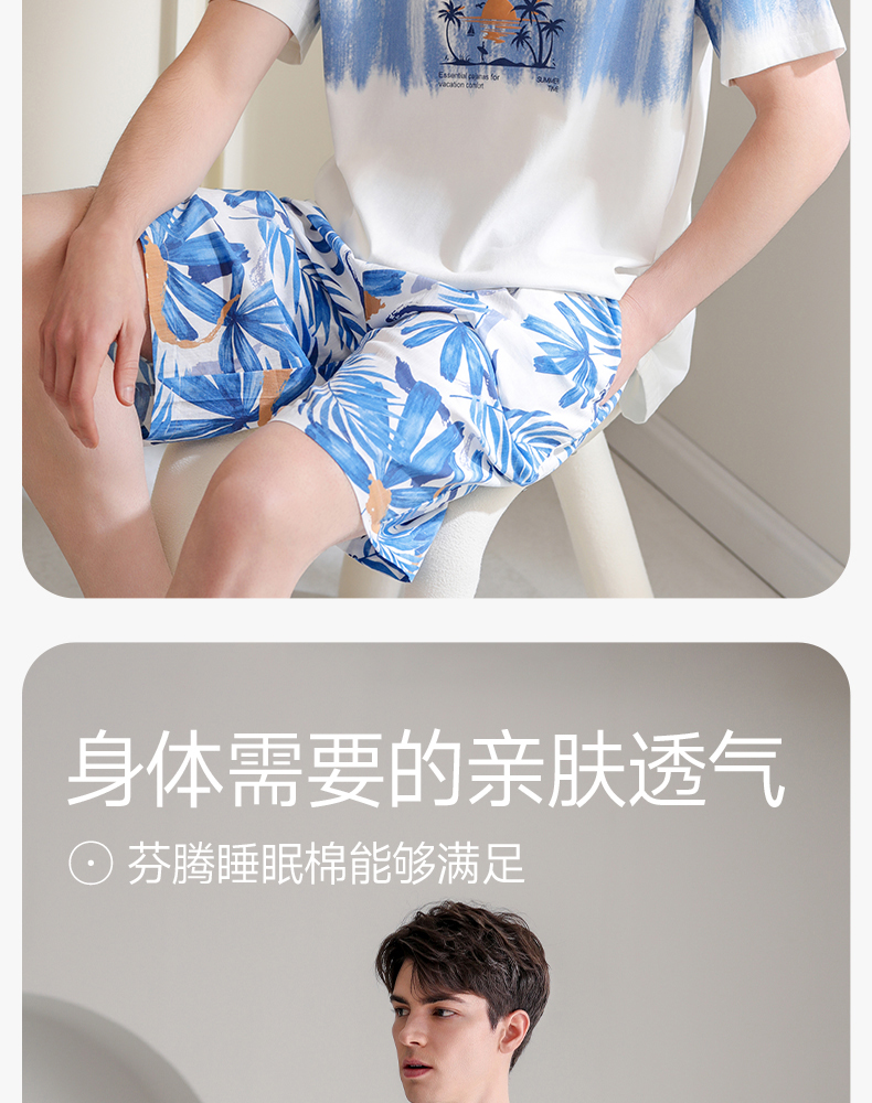 芬腾男士睡衣夏季纯棉短袖圆领套装青年休闲加大码外穿全棉家居服