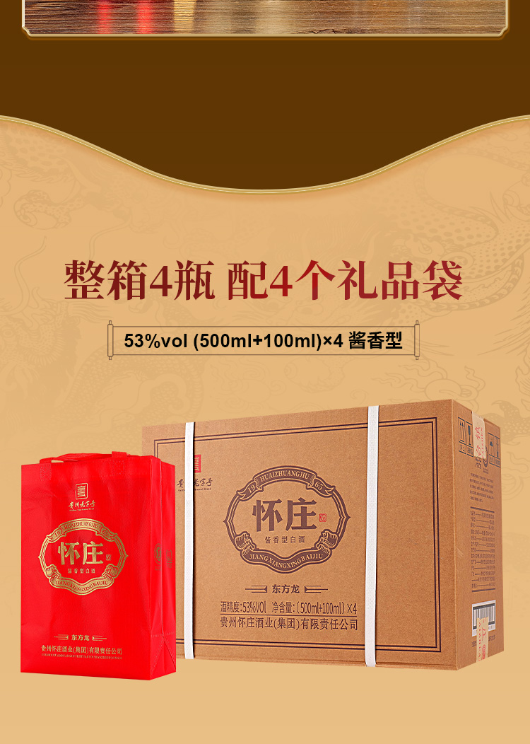 【赠酒杯+100ml体验装】怀庄酒·东方龙 | 53°酱香型白酒,500ml/500ml*4盒,原箱发货,礼盒包装
