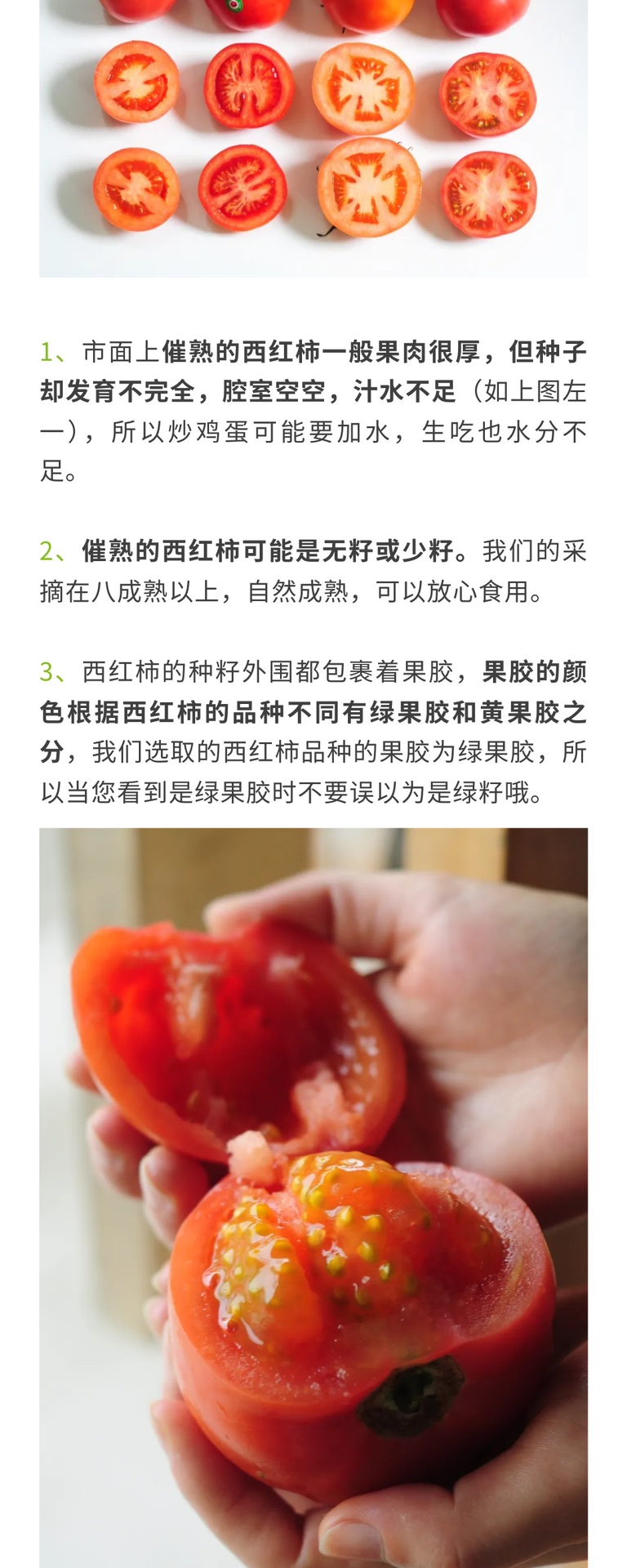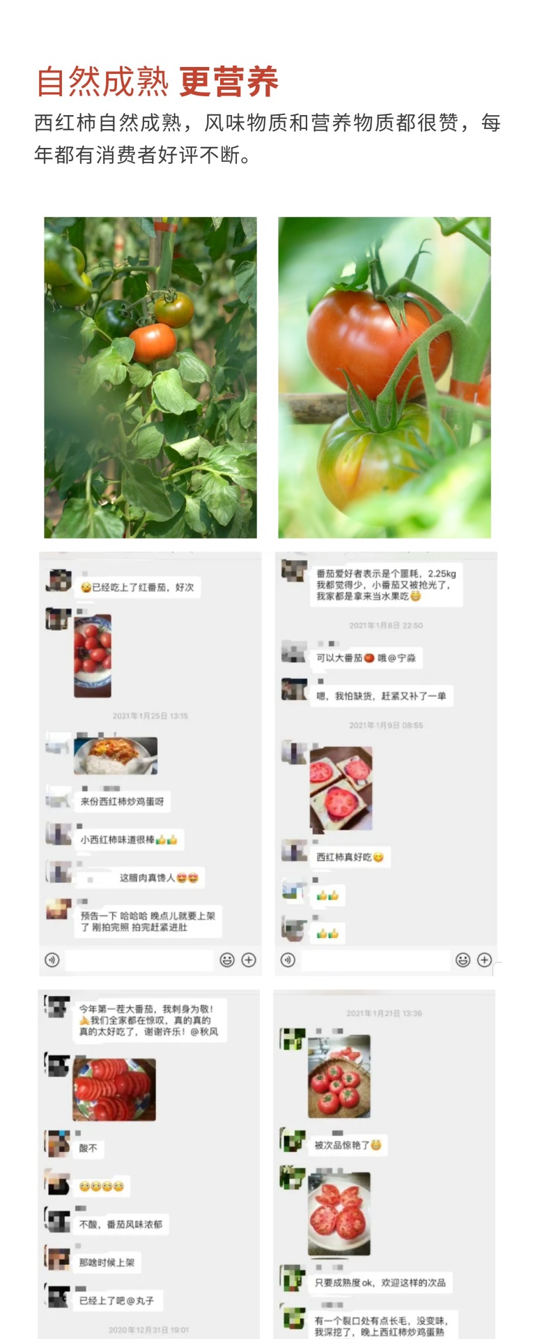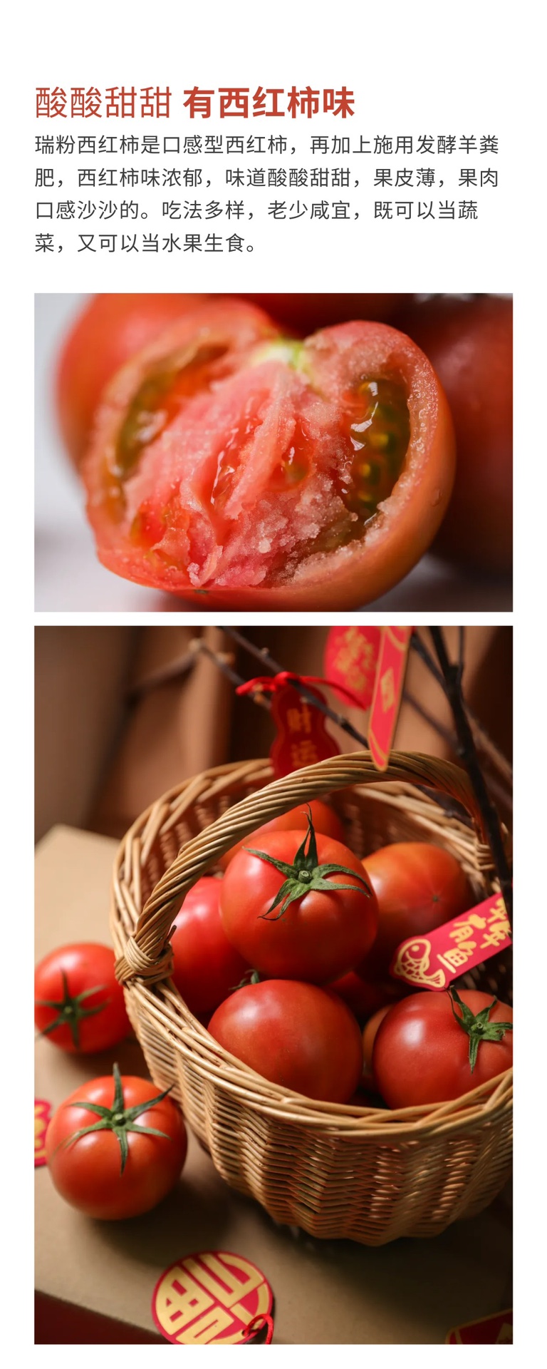 【温馨提示】 1、选取的西红柿品种为薄皮粉果品种,自然成熟,虽然采取了非常好的保护措施,但快递过程中还是不可避免的偶尔会出现开裂现象,对于开裂果没有超过整体三分之一的情况,不予售后,介意慎拍。 2、西红柿可能有个别虫眼、疤痕现象,介意慎拍。 3、瑞粉西红柿成熟后是黄籽,绿果胶,请勿误会为绿果籽未成熟哦,自然成熟。 4、西红柿整体果形呈圆线微扁,略带棱:头部有些为扁平状,有些为尖状(花受不理想的气温和湿度影响,不能正常脱落引起);总体来说树上生长的果子,形状不可能一模一样。 5、在一茬西红柿的尾期,部分西红柿可能会有局部发青的现象,介意慎拍。 6、受天气等原因影响可能偶有耽误,急单请发货前咨询客服,不接受没有提前沟通的拒收。 7、生鲜产品,已发货后不接受退款申请,请谨慎下单!快递抵达后请尽快取件。