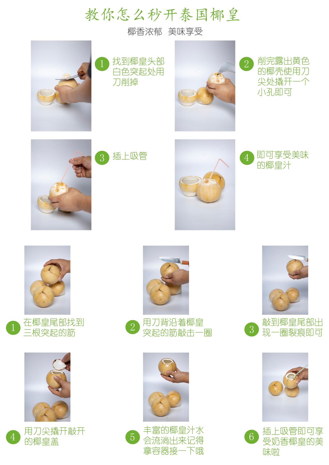 【开果方法】①椰皇的底部去碰撞另外一个的底部,或者用刀子敲底部。②用刀子削掉头部的外壳棉体,会有一个较软的小孔,挖开插上吸管。