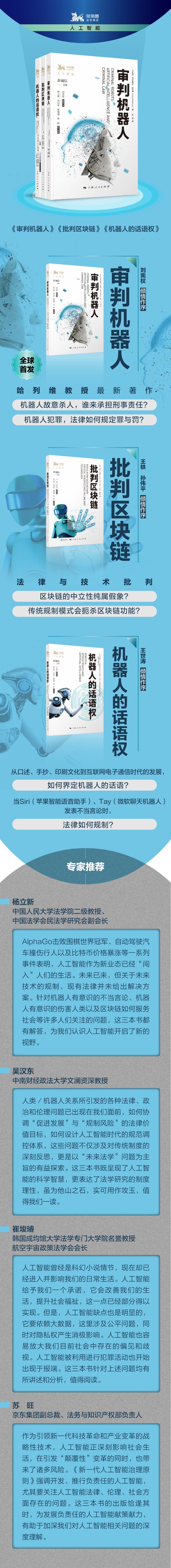 人类/机器人关系所引发的各种法律、政治和伦理问题已出现在我们面前,如何调整“促进发展”与“规制风险”的法律价值目标,如何设计人工智能时代的规范调控体系,这些问题不仅涉及对传统制度的深刻反思,更是以“未来法学”问题为主旨的有益探索。这三本书既呈现了人工智能的科学智慧,更表达了法学研究的制度理性,虽为他山之石,实可用作攻玉,值得我们一读。