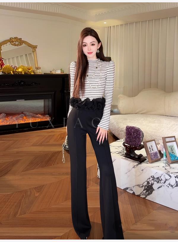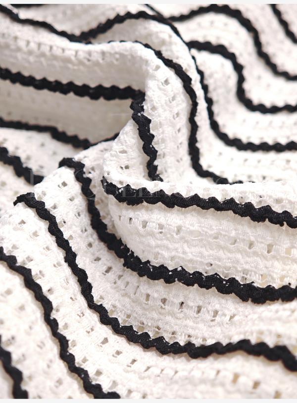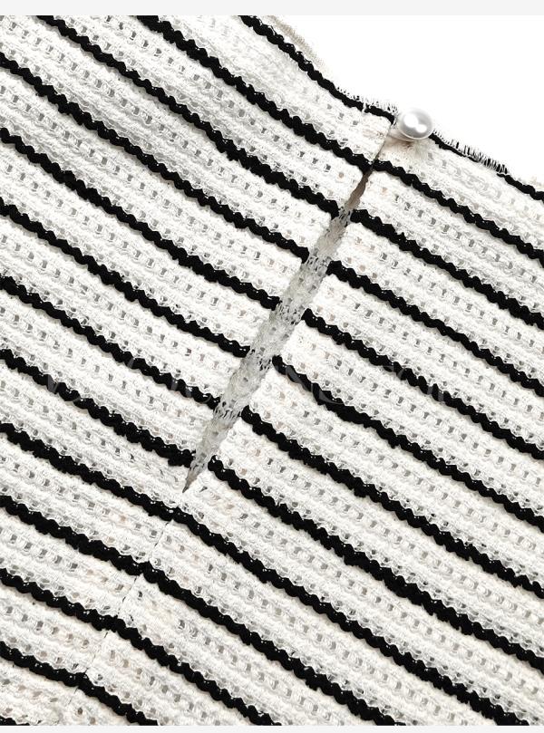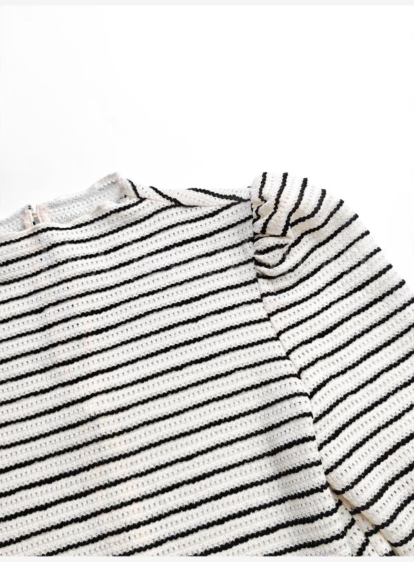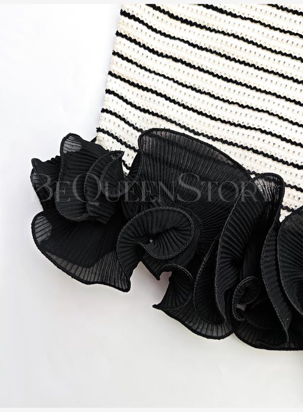 余潇潇【黑白风暴】时尚条纹半高领泡泡袖拼接立体花边针织修身上衣