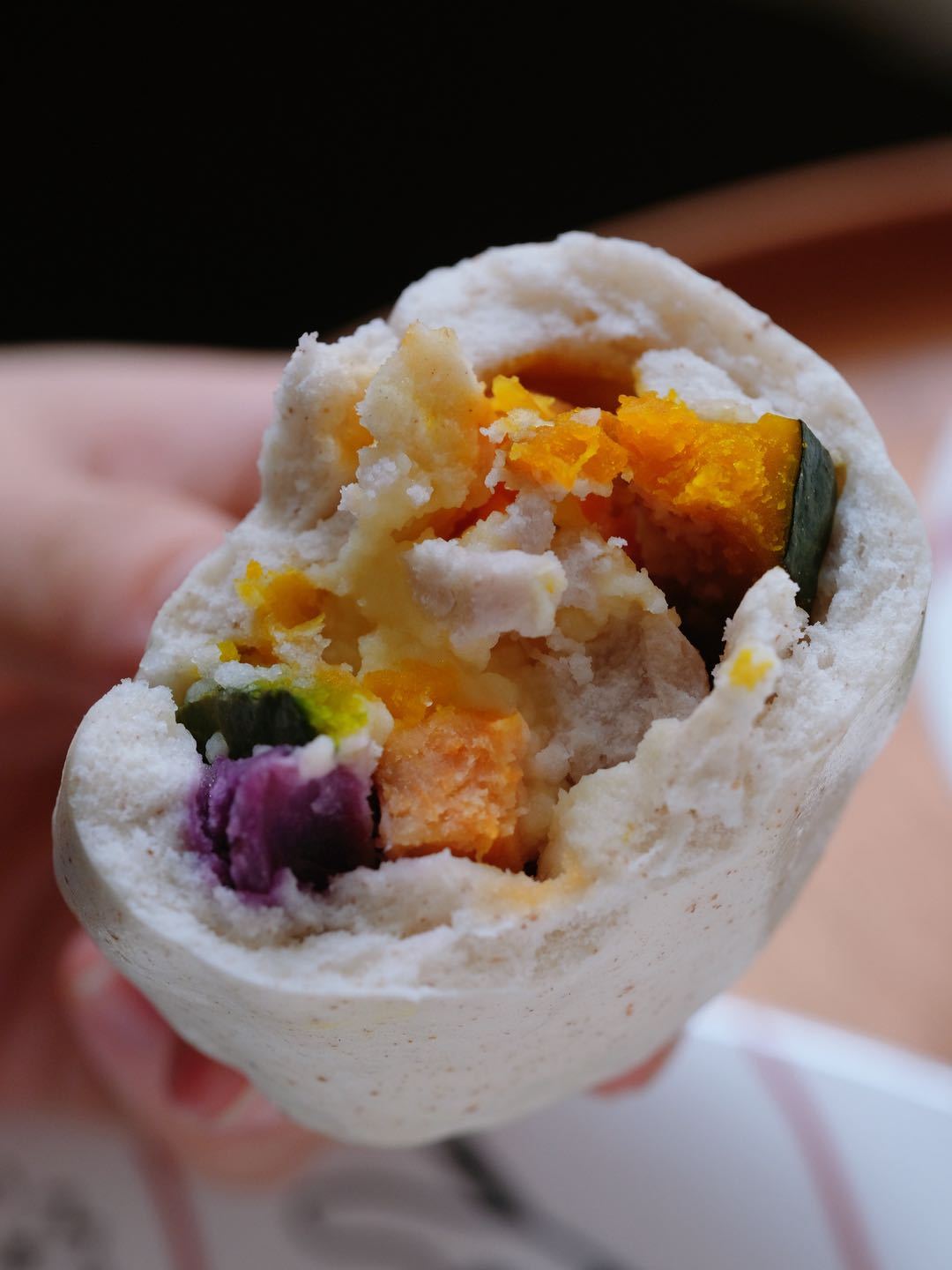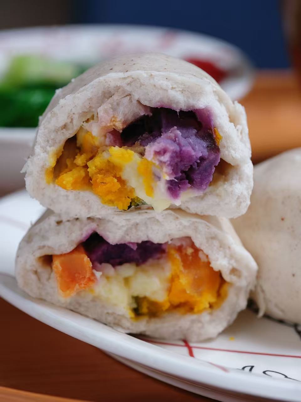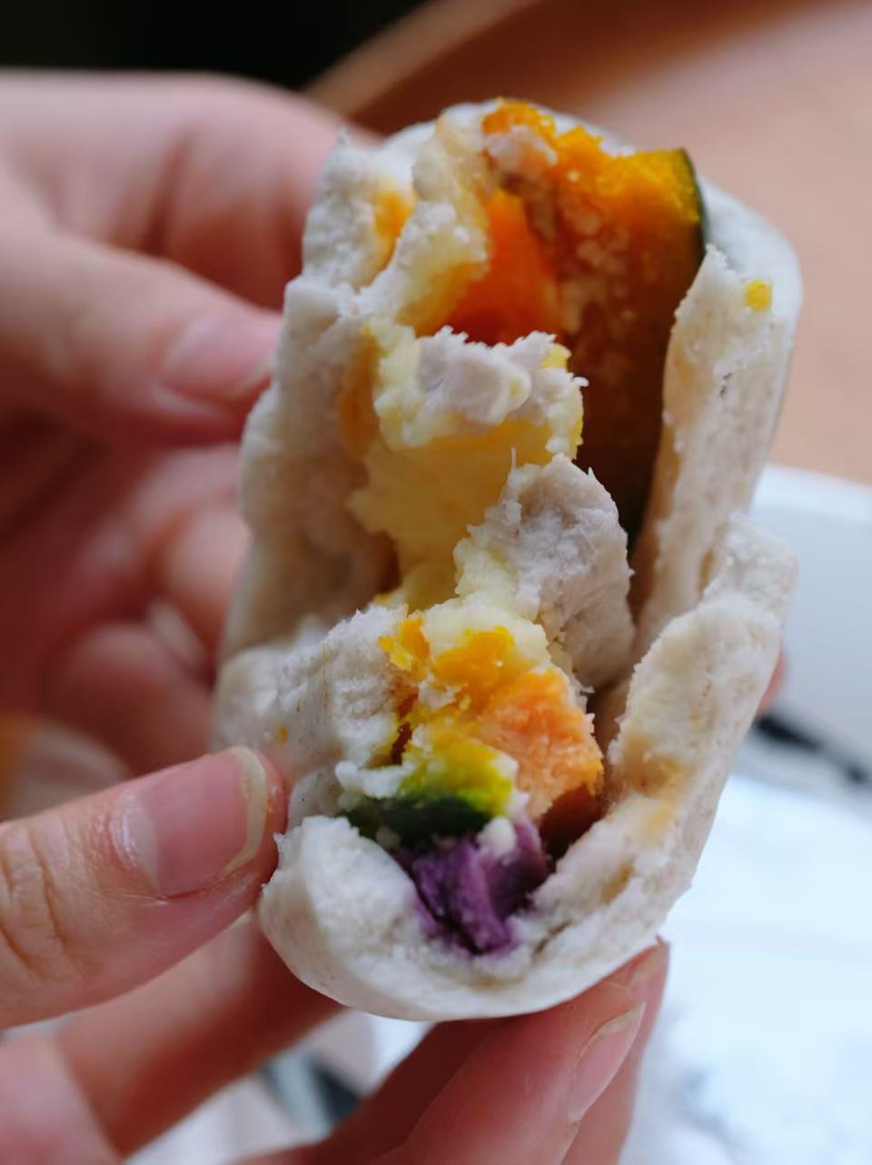 全麦面皮裹着多种食材:粉糯芋头、绵密地瓜、甜面南瓜、沙软紫薯,再加上咸香爆沙的海鸭蛋黄,连乳酪都是轻盈不腻的款。每一口都能咬到粗粮本味,蛋黄的鲜咸还把粗粮的甜衬得更清透,再也不是“啃草式”的健康餐