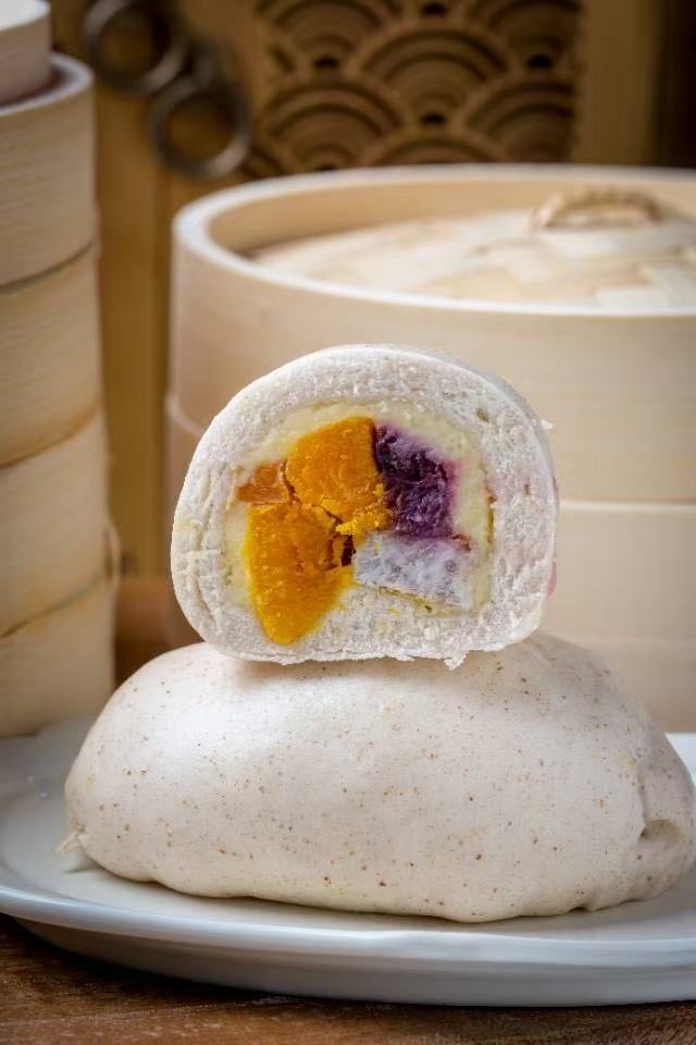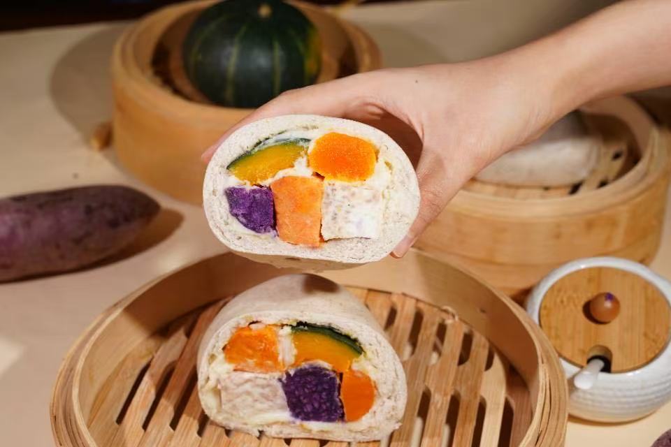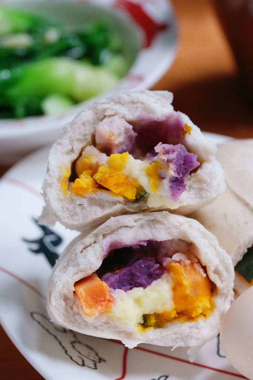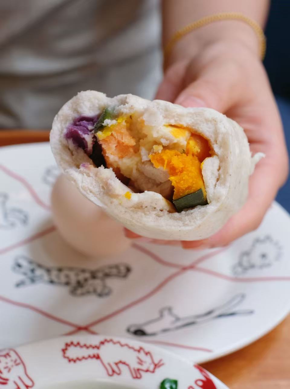 全麦面皮裹着多种食材:粉糯芋头、绵密地瓜、甜面南瓜、沙软紫薯,再加上咸香爆沙的海鸭蛋黄,连乳酪都是轻盈不腻的款。每一口都能咬到粗粮本味,蛋黄的鲜咸还把粗粮的甜衬得更清透,再也不是“啃草式”的健康餐